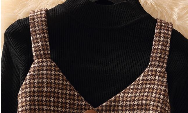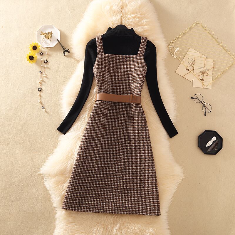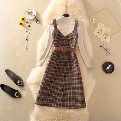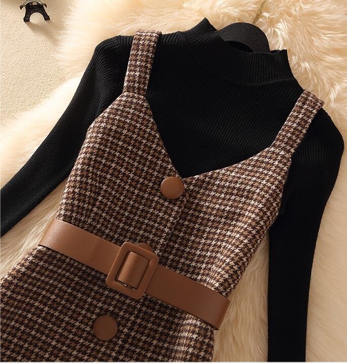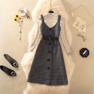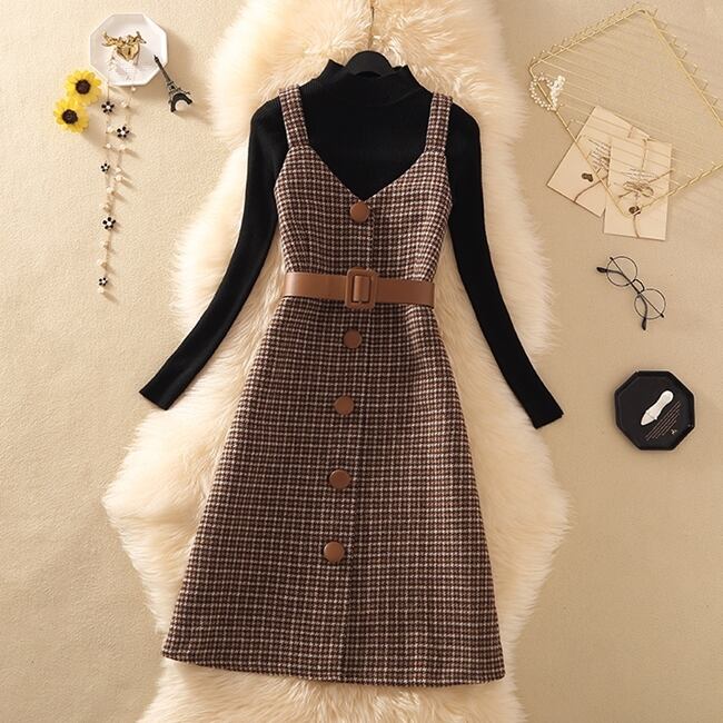 全4色 セットアップ ツーピース 2点セット ワンピース スリム プルオーバー フロントボタン ハイネック チェック柄 ベルト 大人 カジュアル きれいめ デート 女子会 上品 トレンド 秋 春 冬