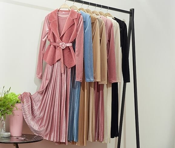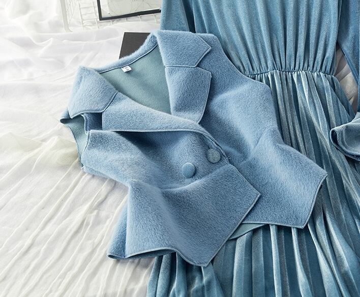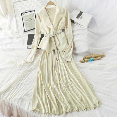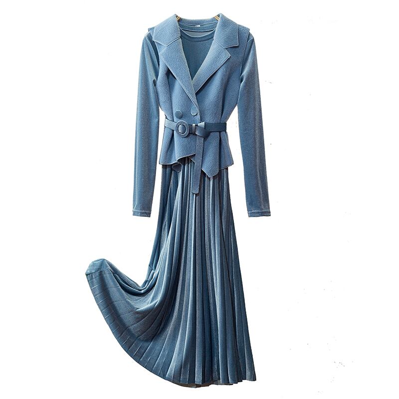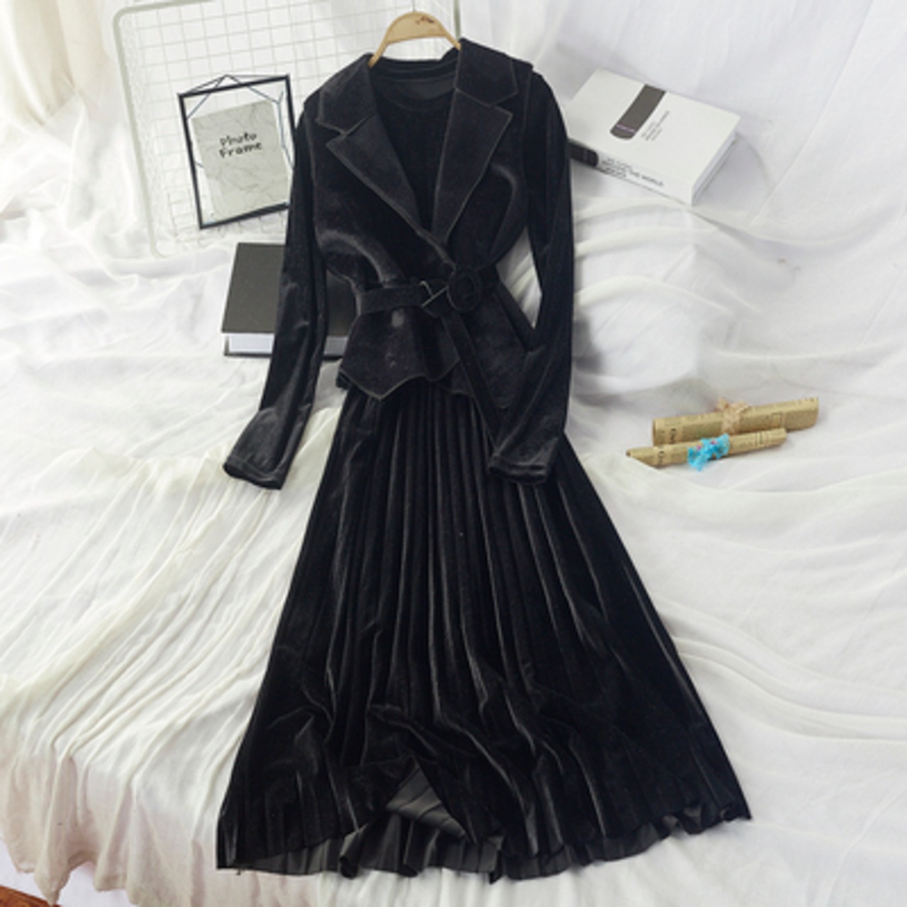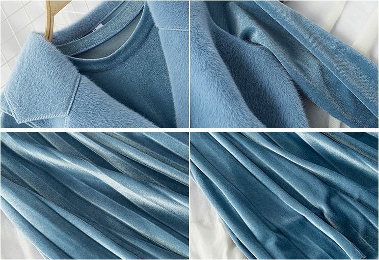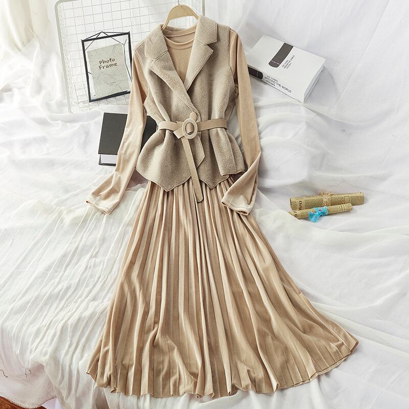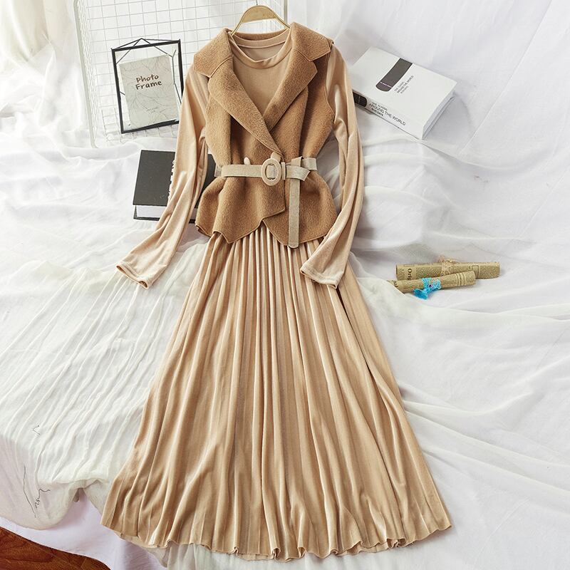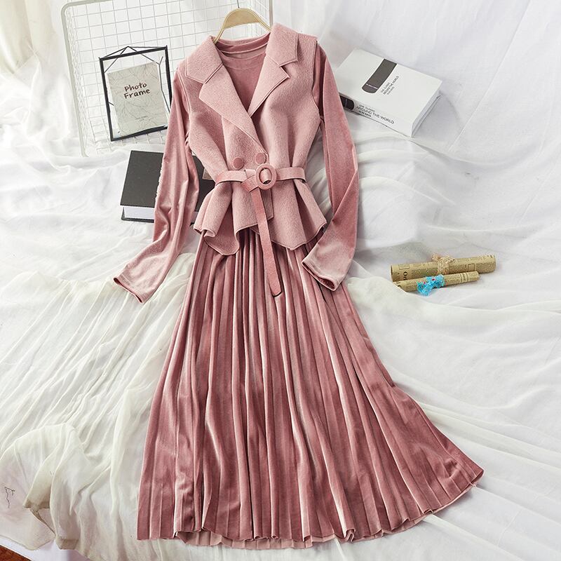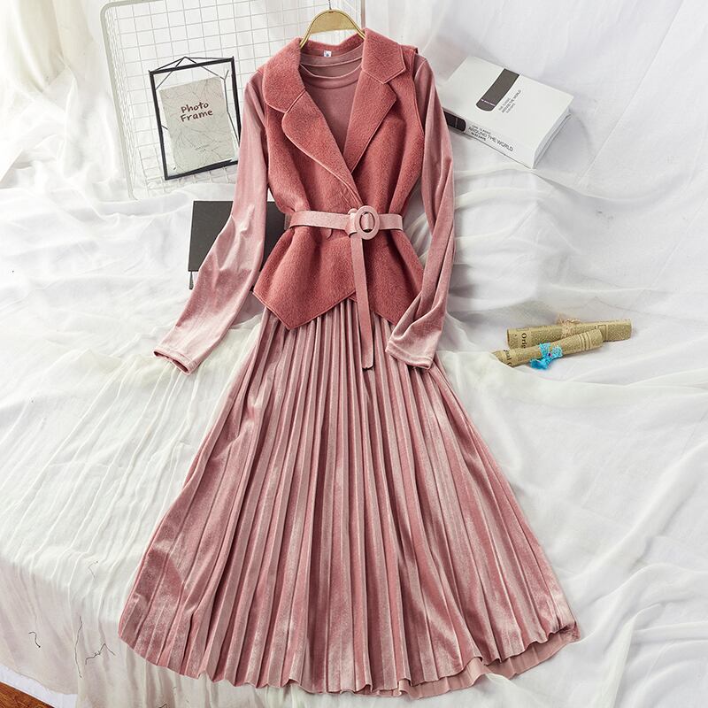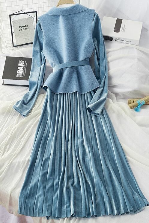 全7色 セットアップ ツーピース 2点セット ワンピース ドレス シャギーニット ベスト レイヤード レディ フレア ロング丈 ベルベット ベルト 大人可愛い きれいめ デート パーティー お呼ばれ 上品 光沢 秋 春 冬