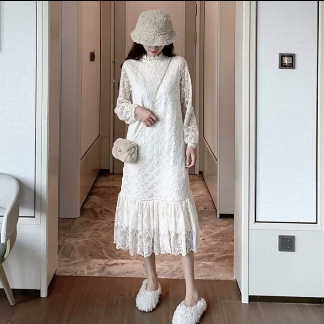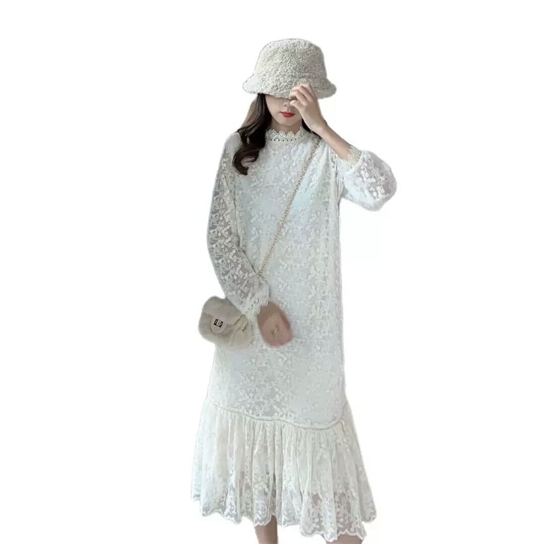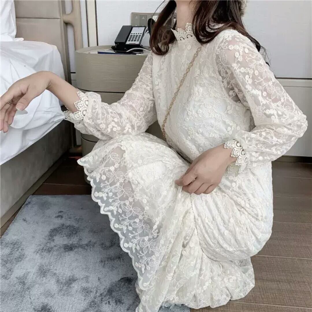 マキシ丈 レース ワンピース 長袖 ドレス シンプル 大人 キレイめ 上品 可愛い カジュアル お出かけ お買い物 デート 女子会 秋冬 春 通学 学生 通勤 韓国ファッション