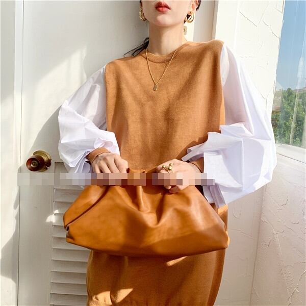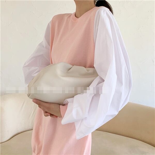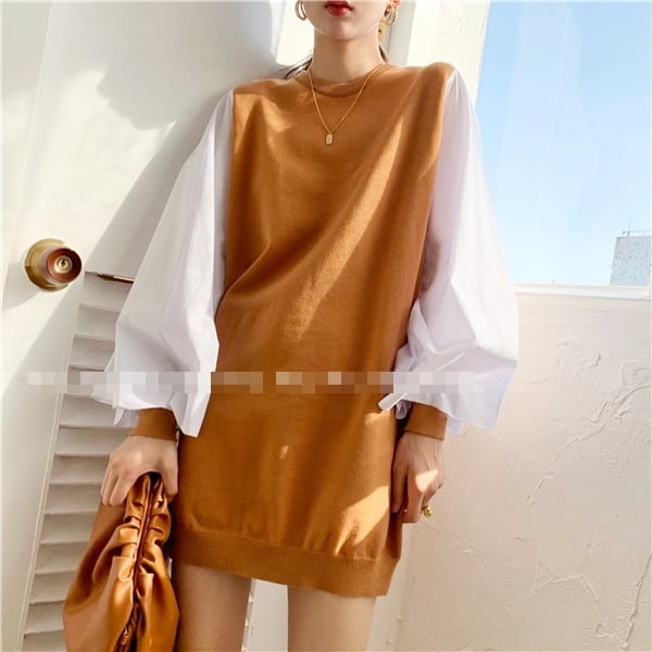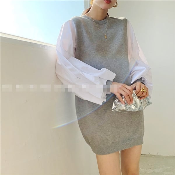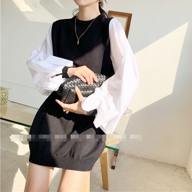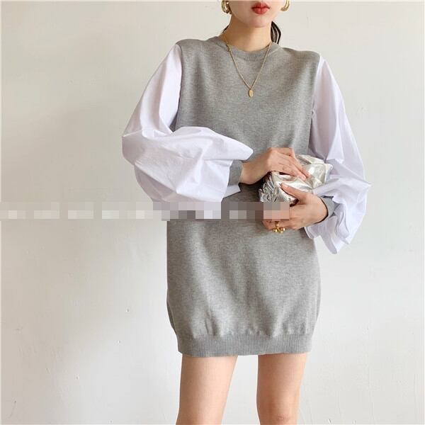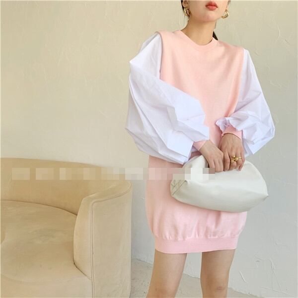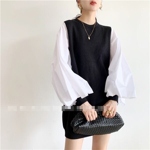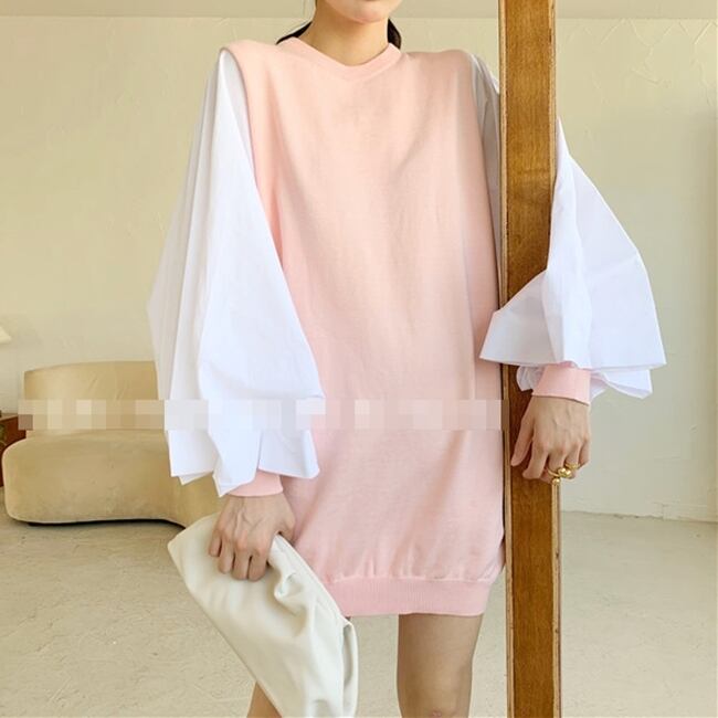 全4色 ワンピース ニットワンピース セーター ミニ丈 ランタンスリーブ バルーンスリーブ クルーネック ボリューム袖 バイカラー ゆったり上品 秋 春 冬
