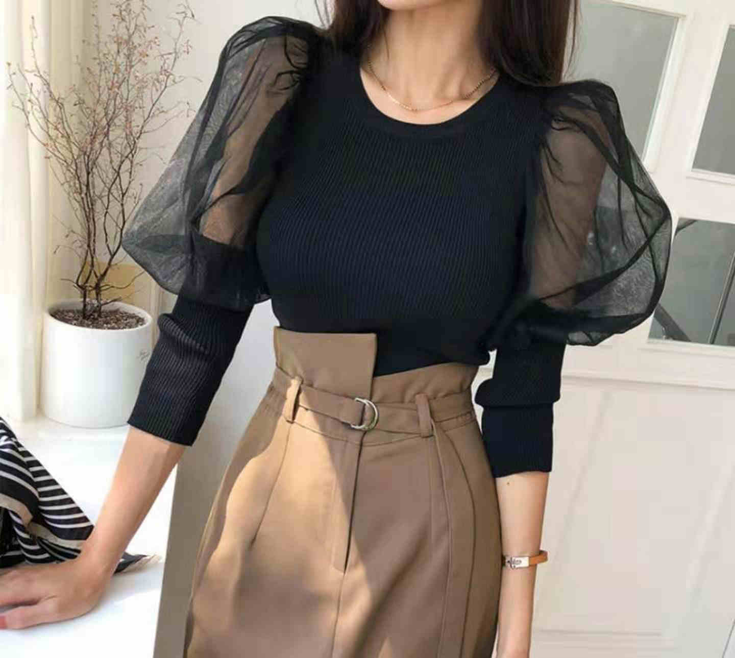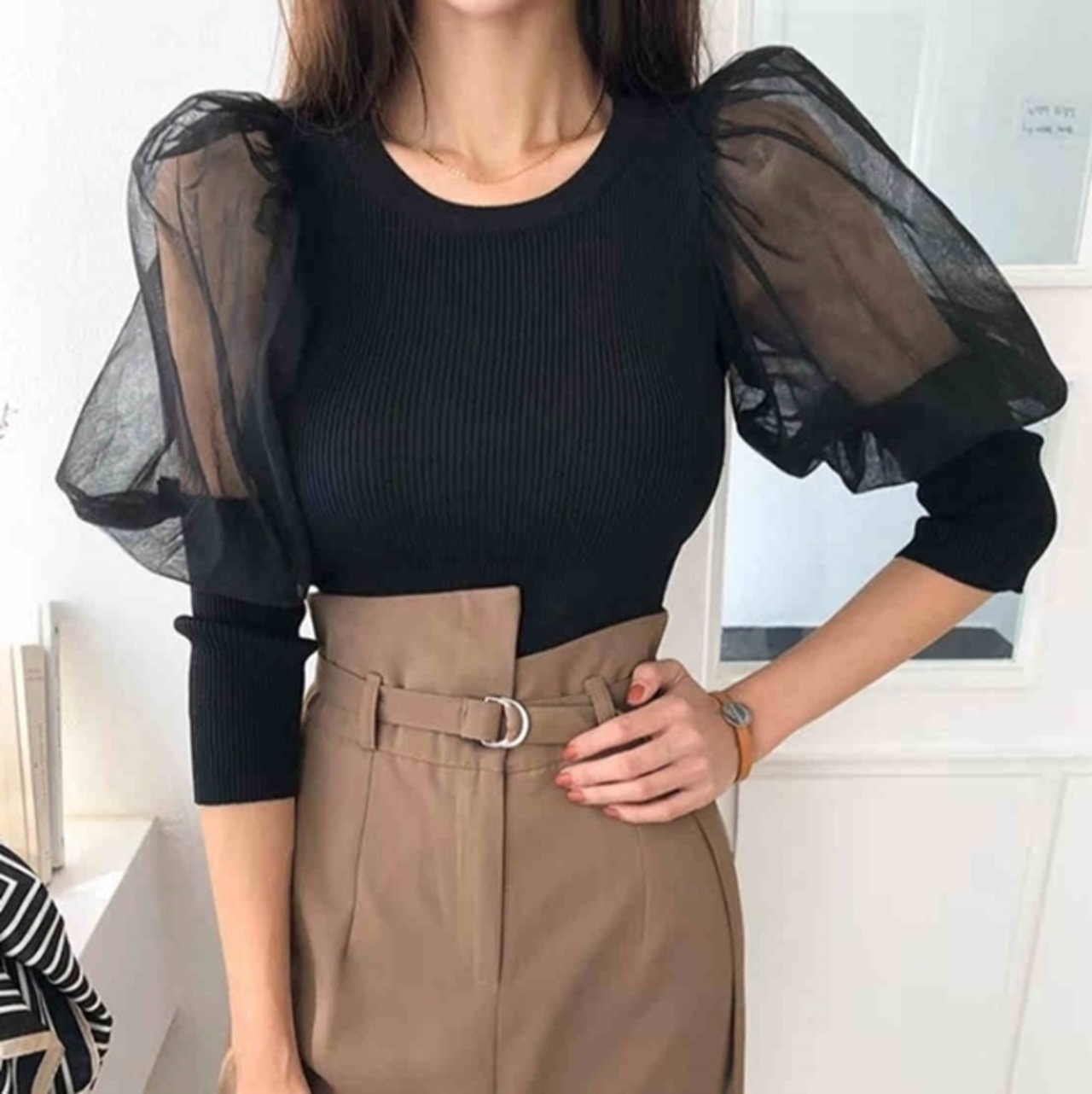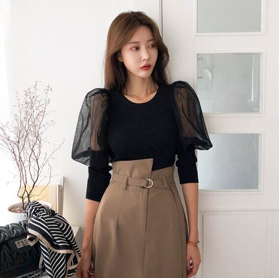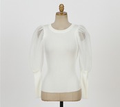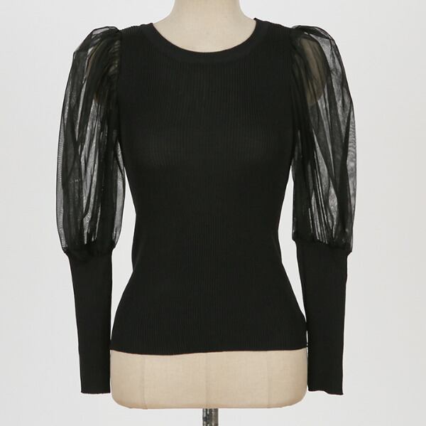 全2色トップス ブラウス プルオーバー バルーンスリーブ ラウンドネック ボリューム袖 シースルー タイト 上品 シック 大人 きれいめ エレガント お呼ばれ 秋 春 冬