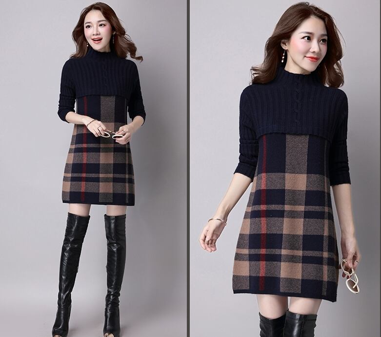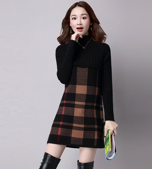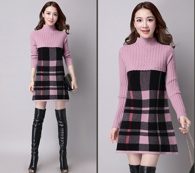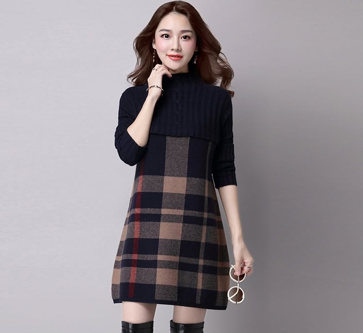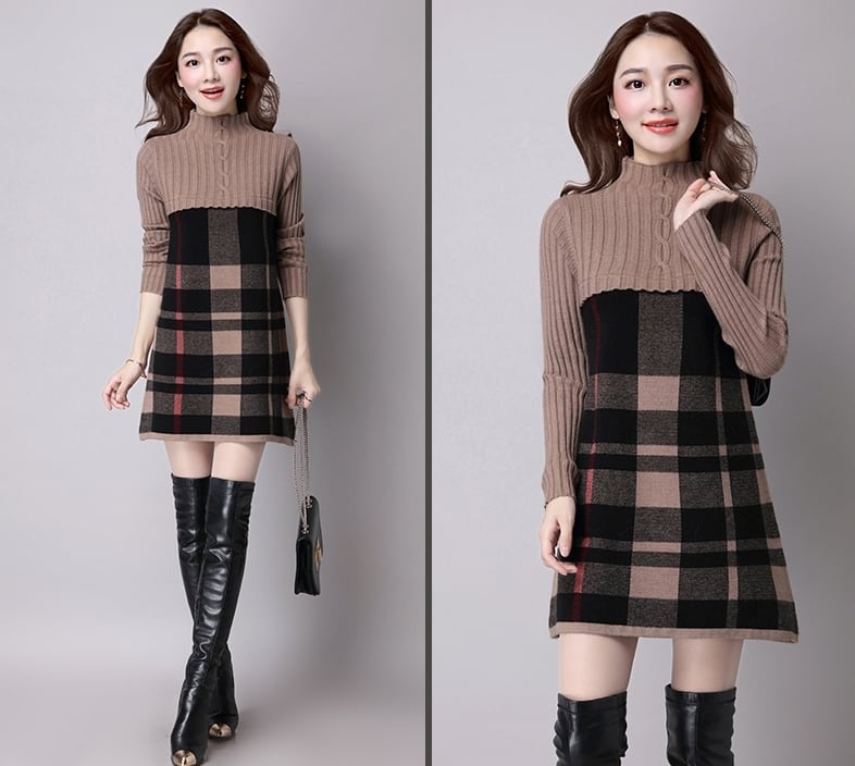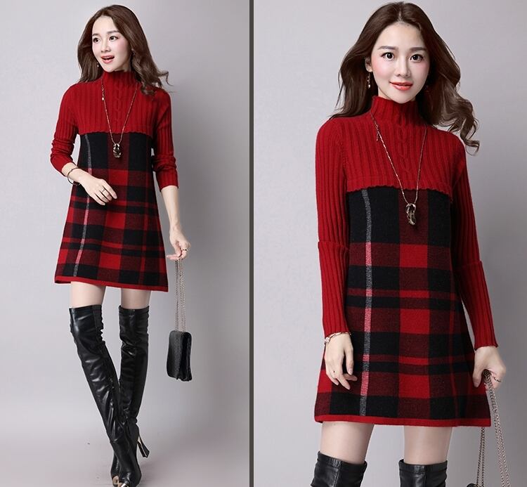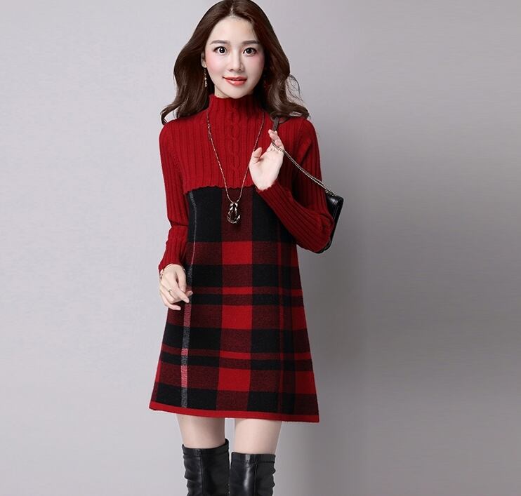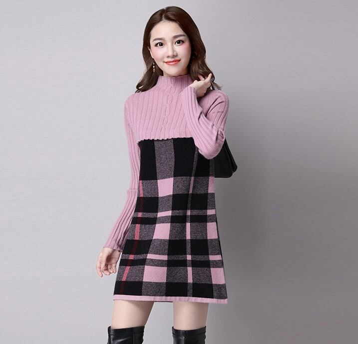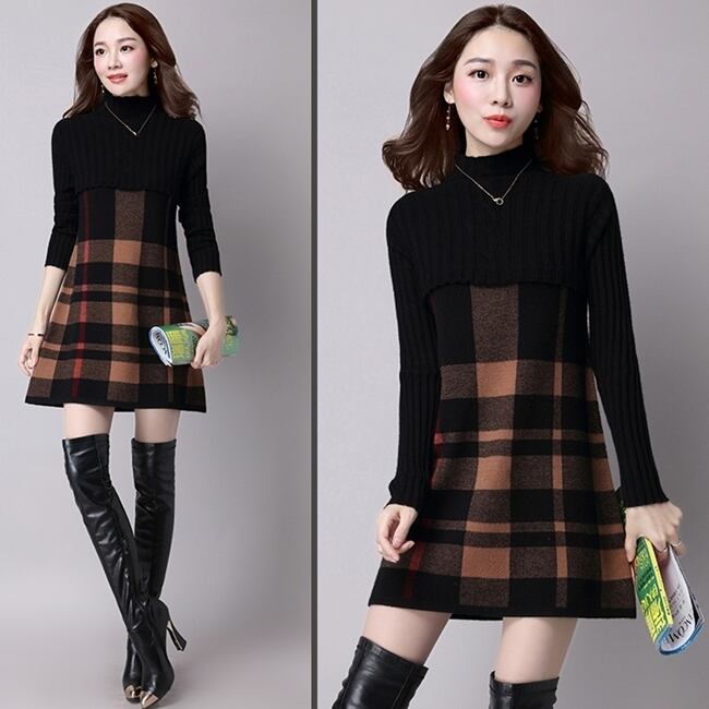 全5色 ワンピース ニットワンピース チェック柄 ミニ丈 セーター デート 女子会 カジュアル 大人可愛い スリム 上品 ハイネック 秋 春 冬