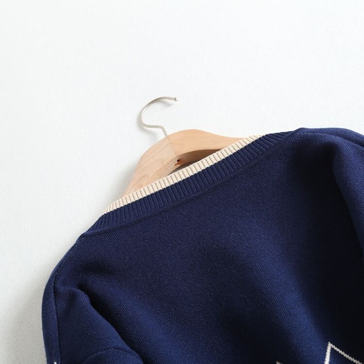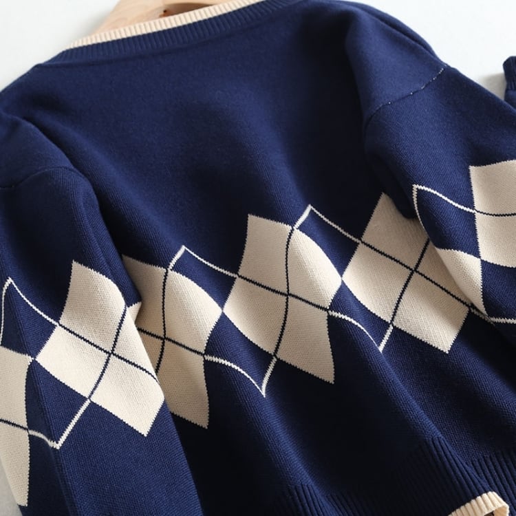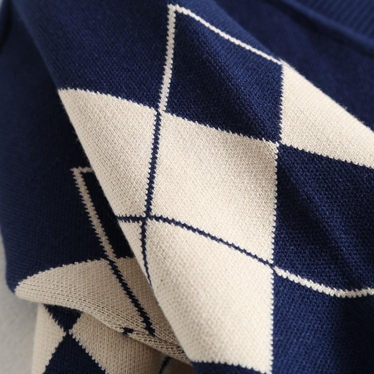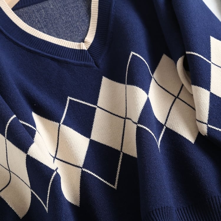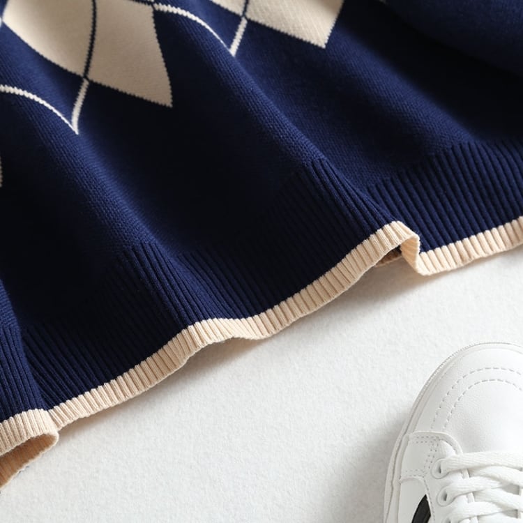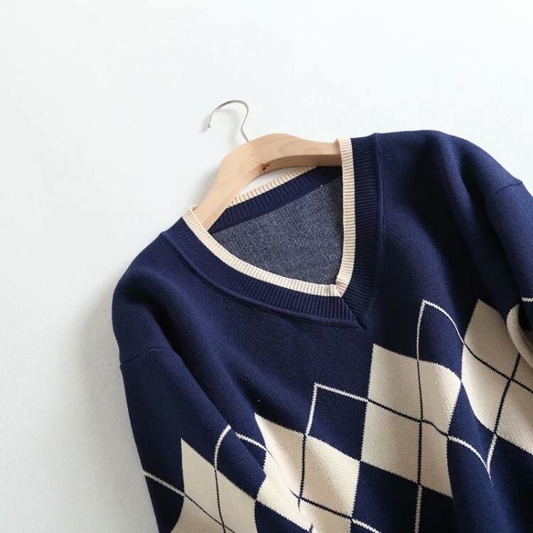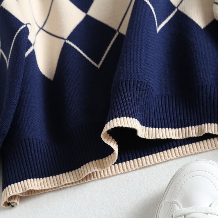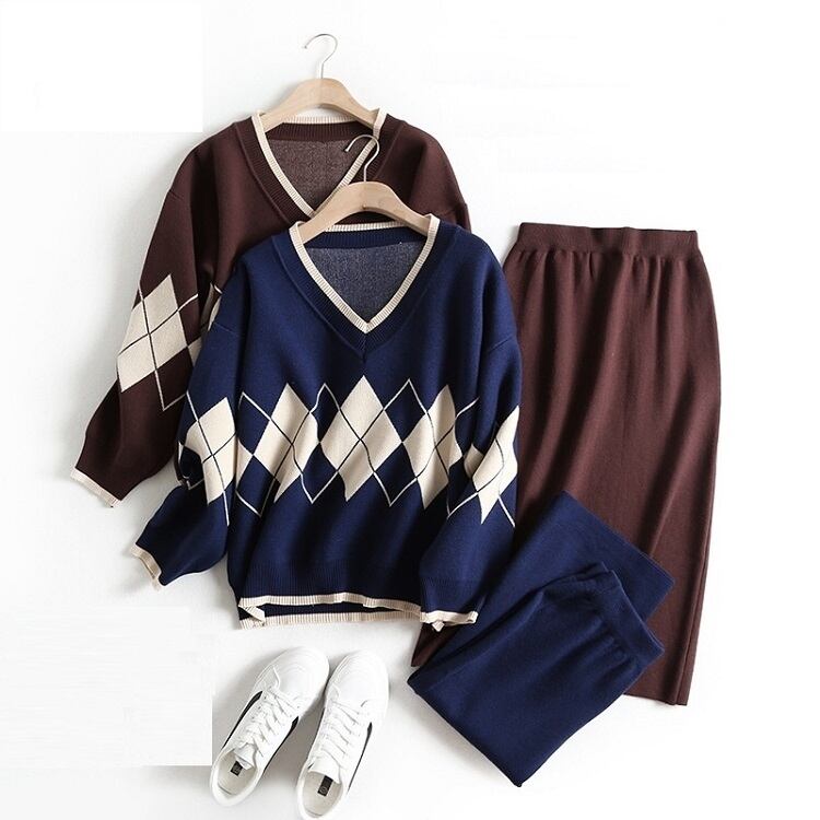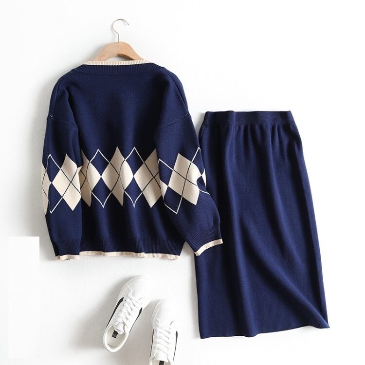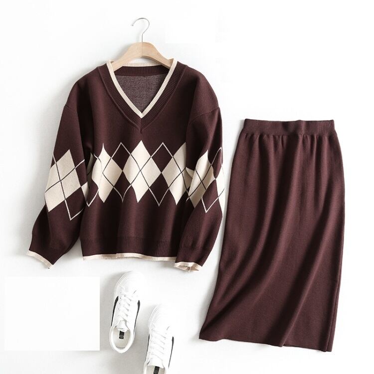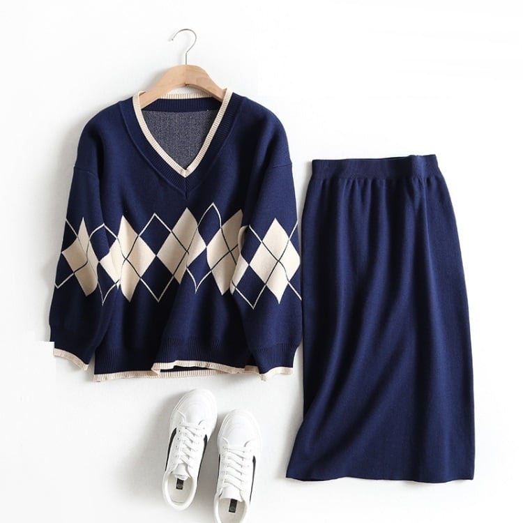 全2色 セットアップ ニット ツーピース 上下セット アーガイル Vネック ニットスカート プルオーバー ゆったり お出かけ カジュアル デート ブルー ブラウン 秋冬