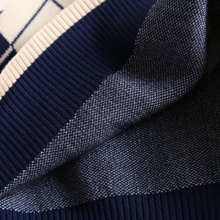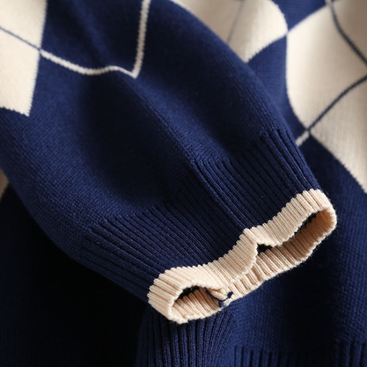 アーガイル柄がアクセントになったニットトップスとニットスカートのセットアップ。