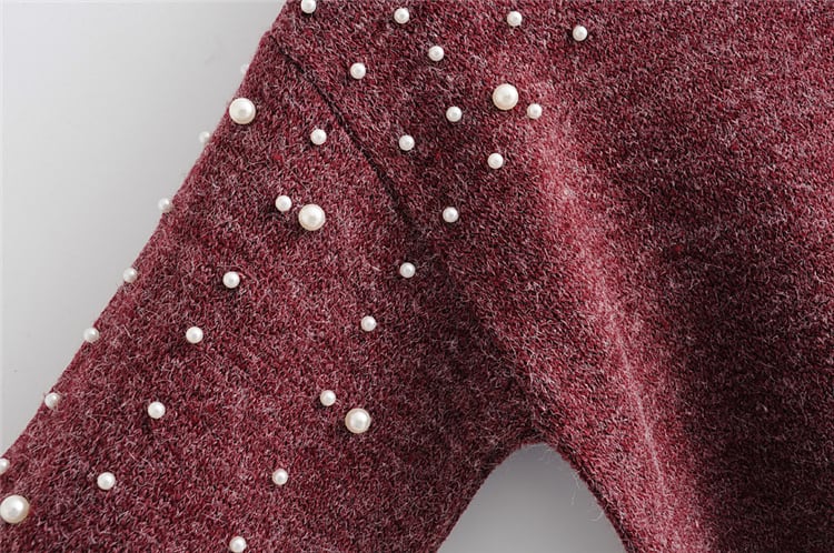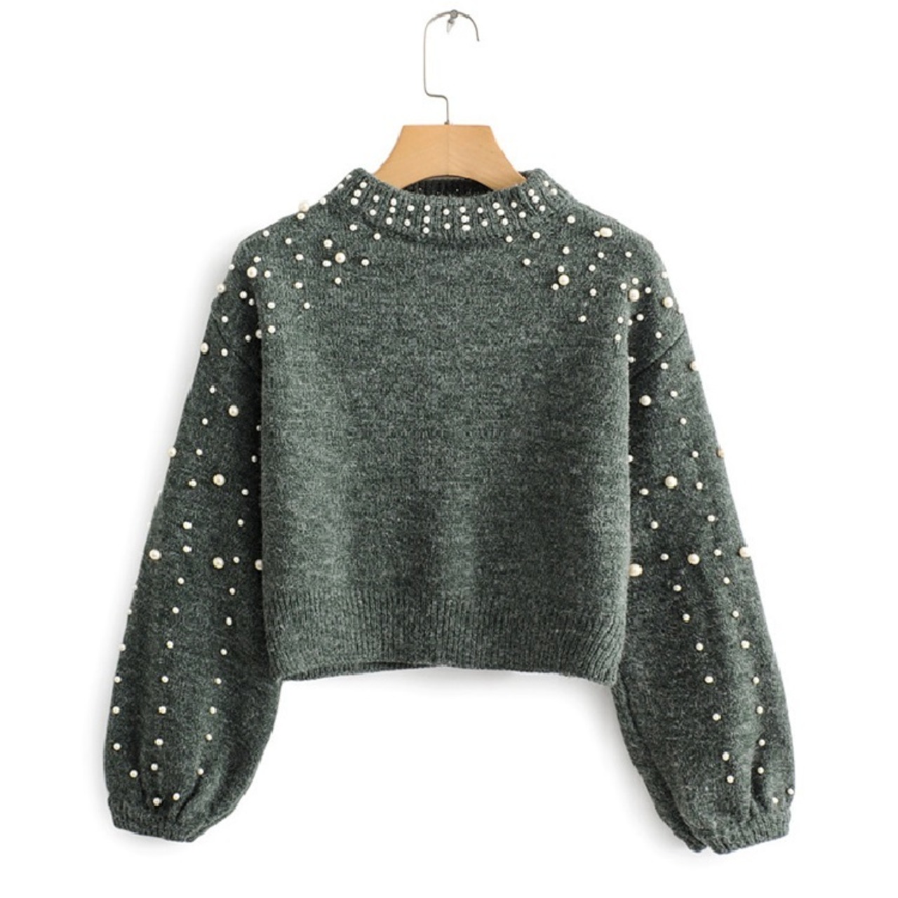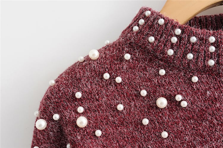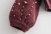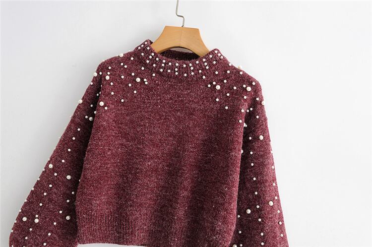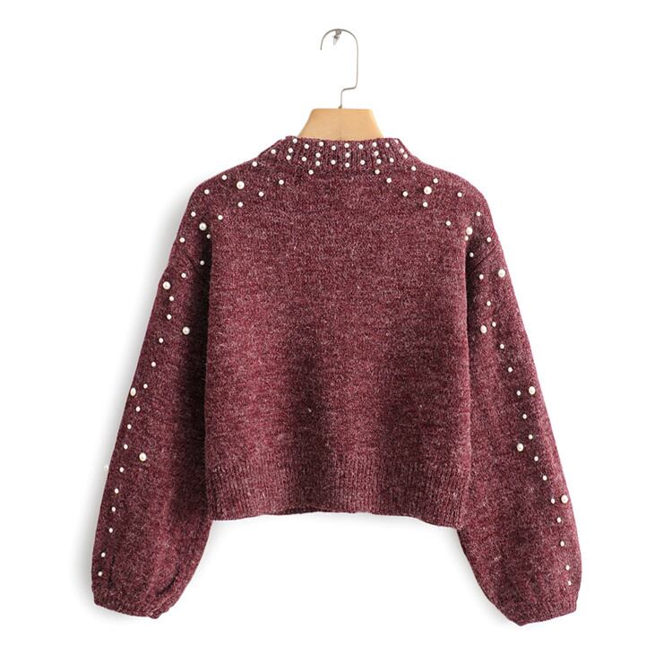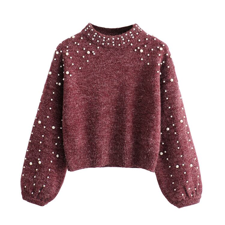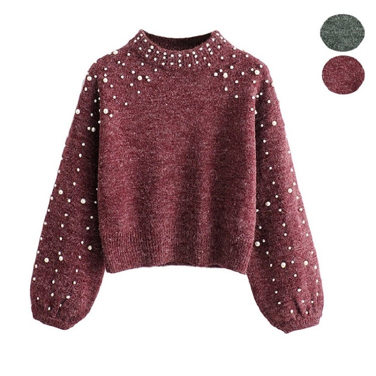 全2色 ニット セーター ハイネック バルーンスリーブ ビーズ プルオーバー ゆったり お出かけ カジュアル デート グリーン ワインレッド 秋冬