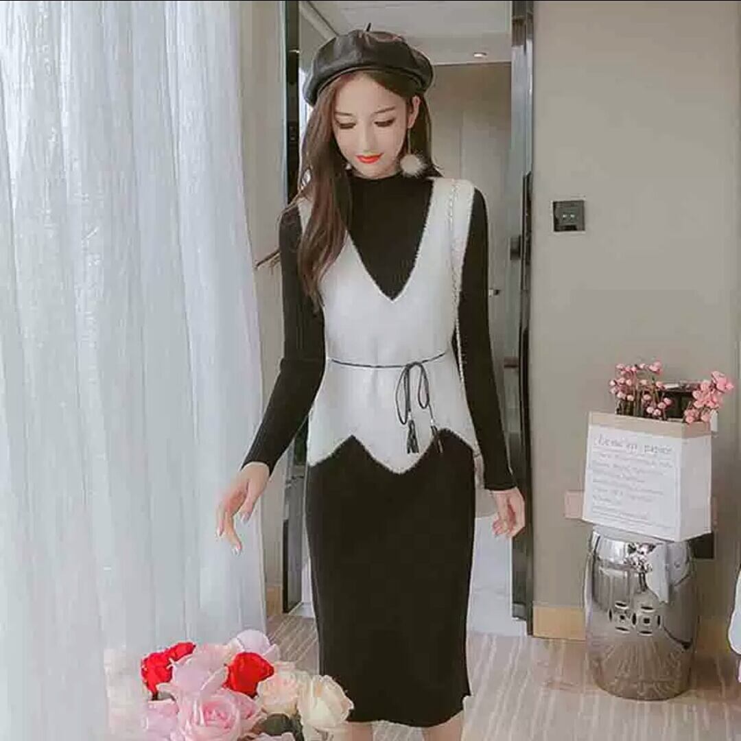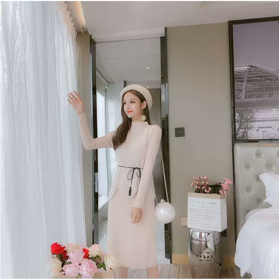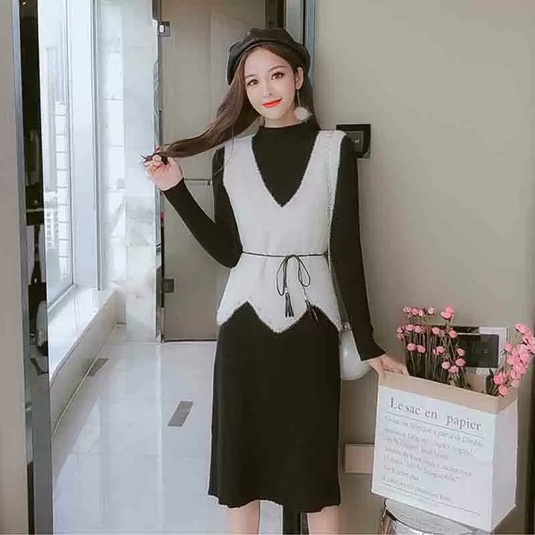全3色 ニットベストつき ワンピース ひざ丈 ミディアム丈 大人 シンプル 無地 キレイめ 上品 可愛い お出かけ お買い物 デート 女子会 秋冬 春 通学 学生 通勤 韓国ファッション