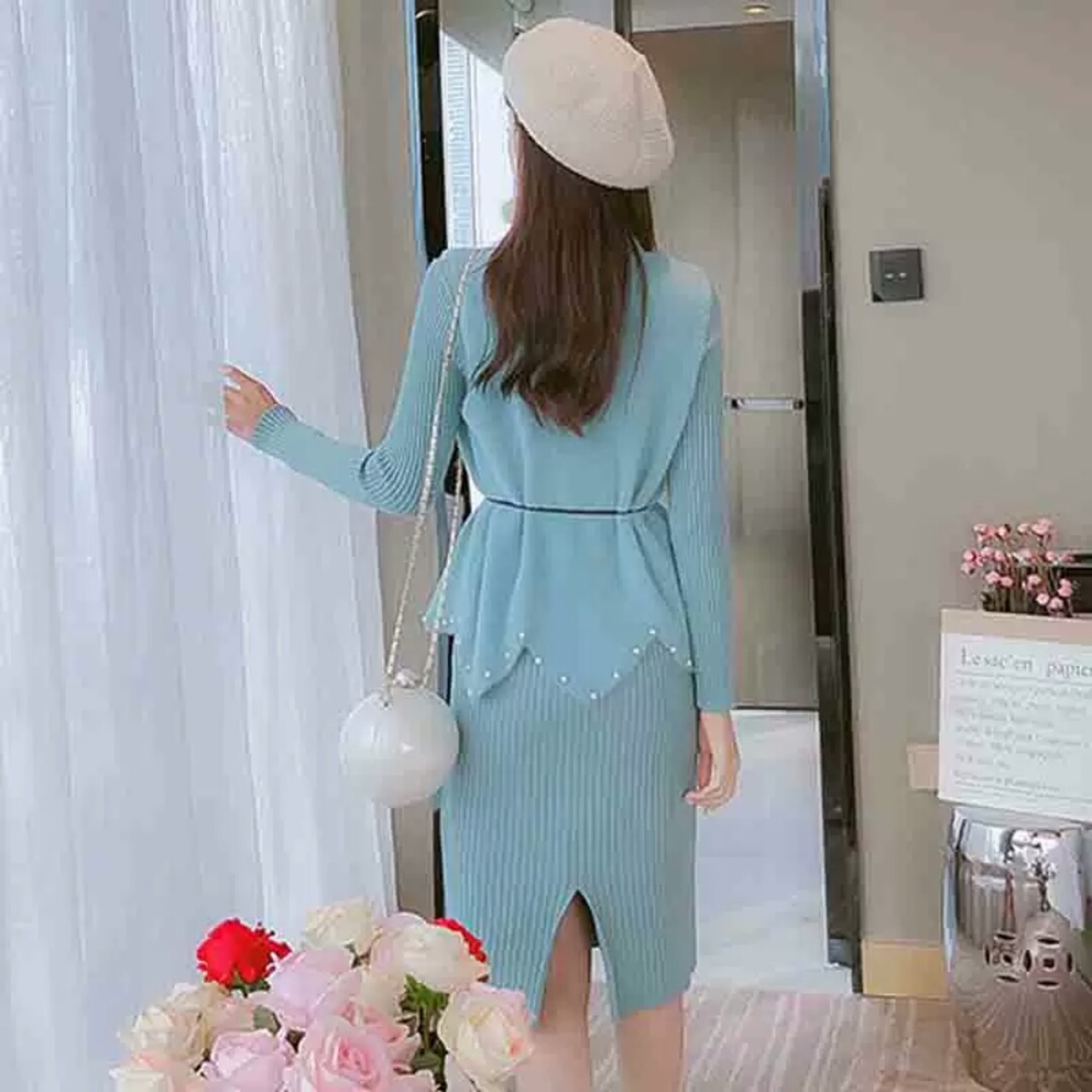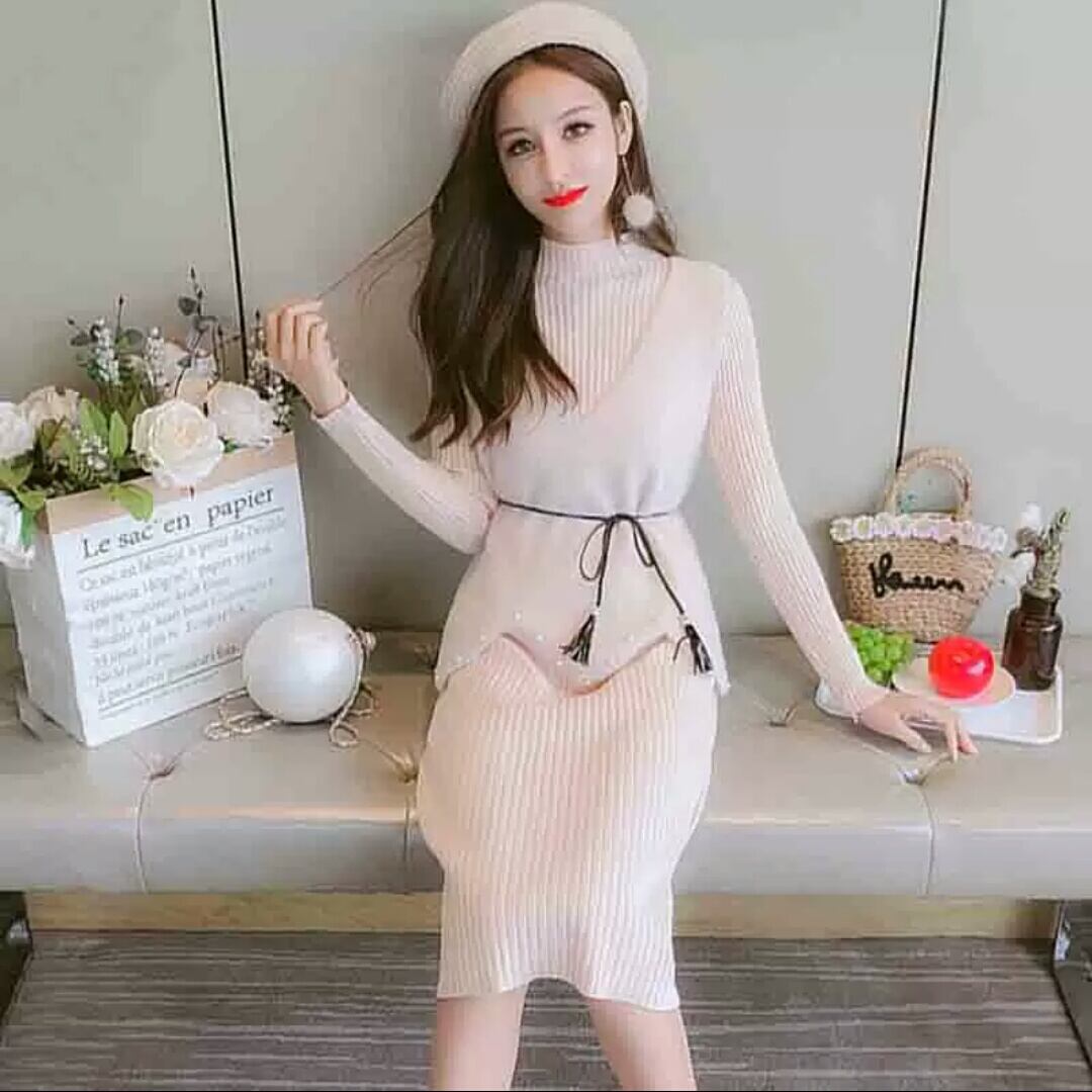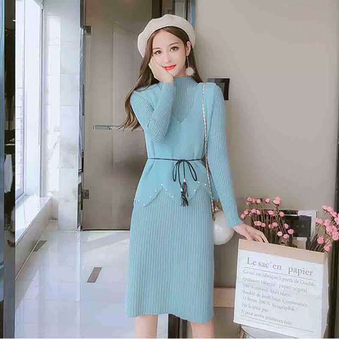 全3色 ニットベストつき ワンピース ひざ丈 ミディアム丈 大人 シンプル 無地 キレイめ 上品 可愛い お出かけ お買い物 デート 女子会 秋冬 春 通学 学生 通勤 韓国ファッション