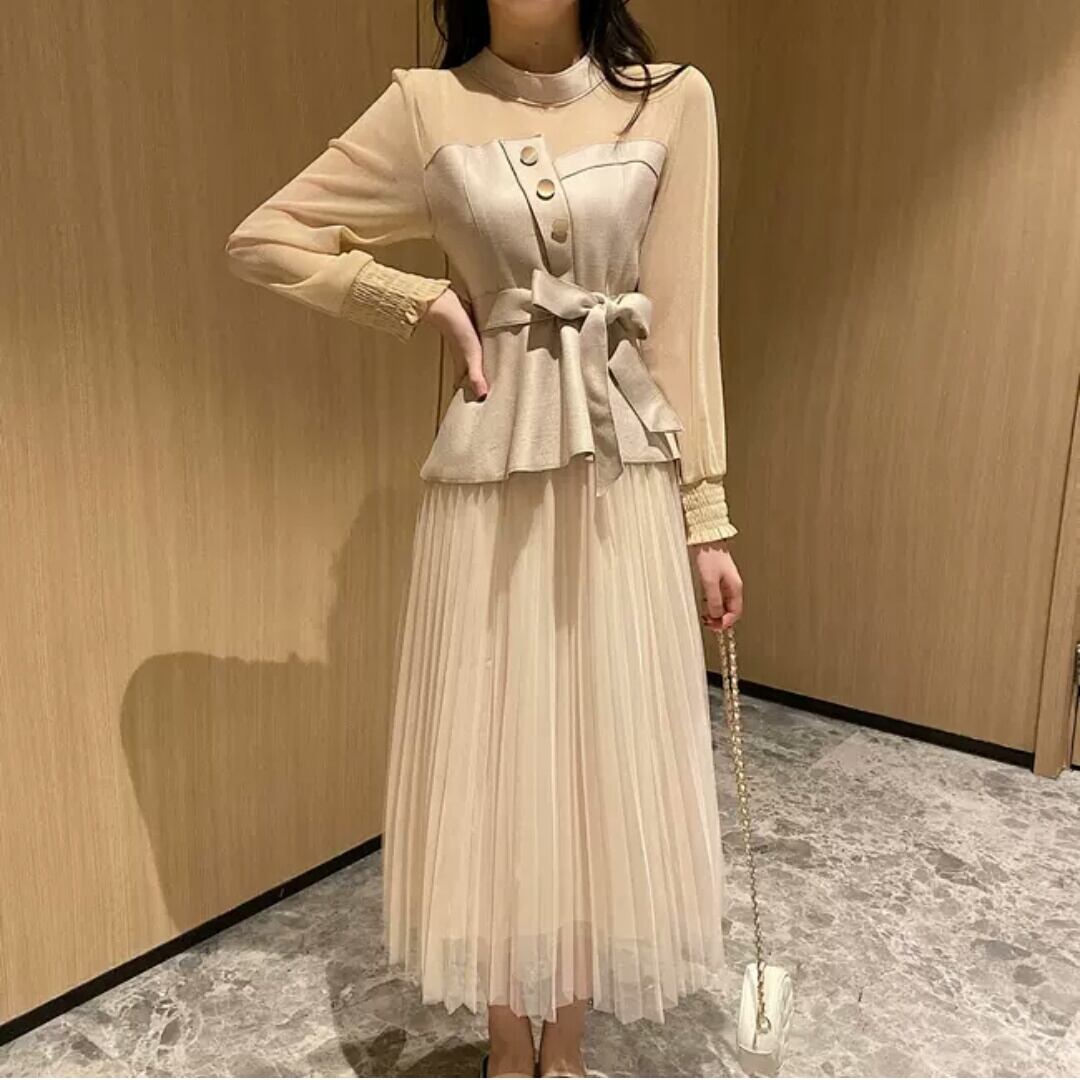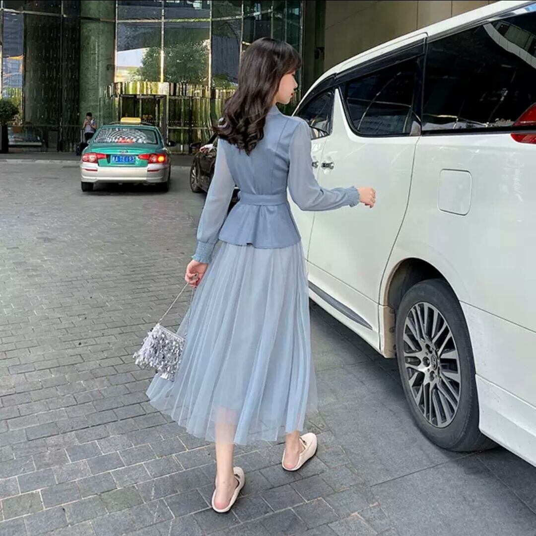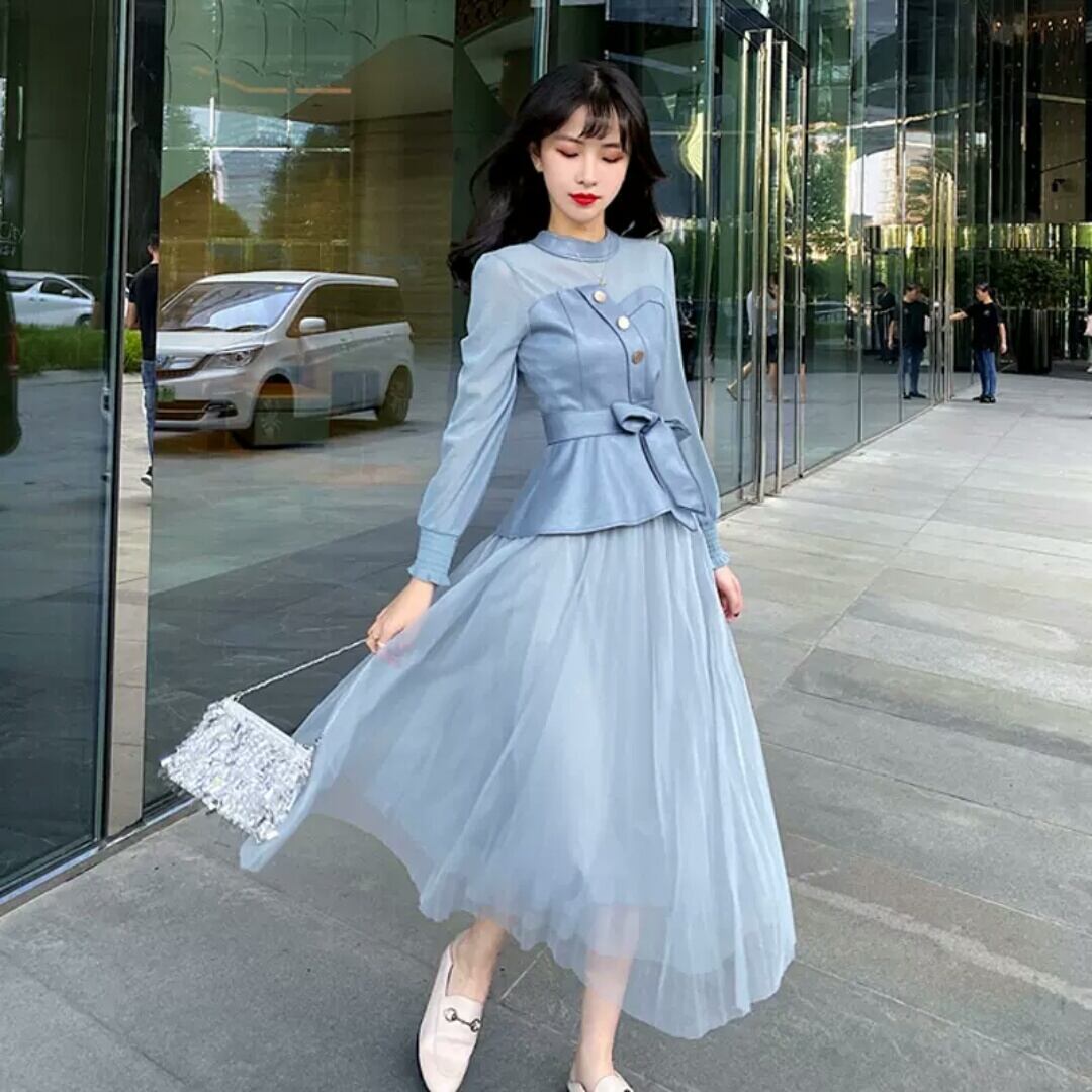 全2色 セットアップ マキシ丈 メッシュ スカート ブラウス トップス 長袖 大人 可愛い キレイめ 上品 お出かけ お買い物 デート 女子会 秋冬 春 通学 学生 通勤 韓国ファッション