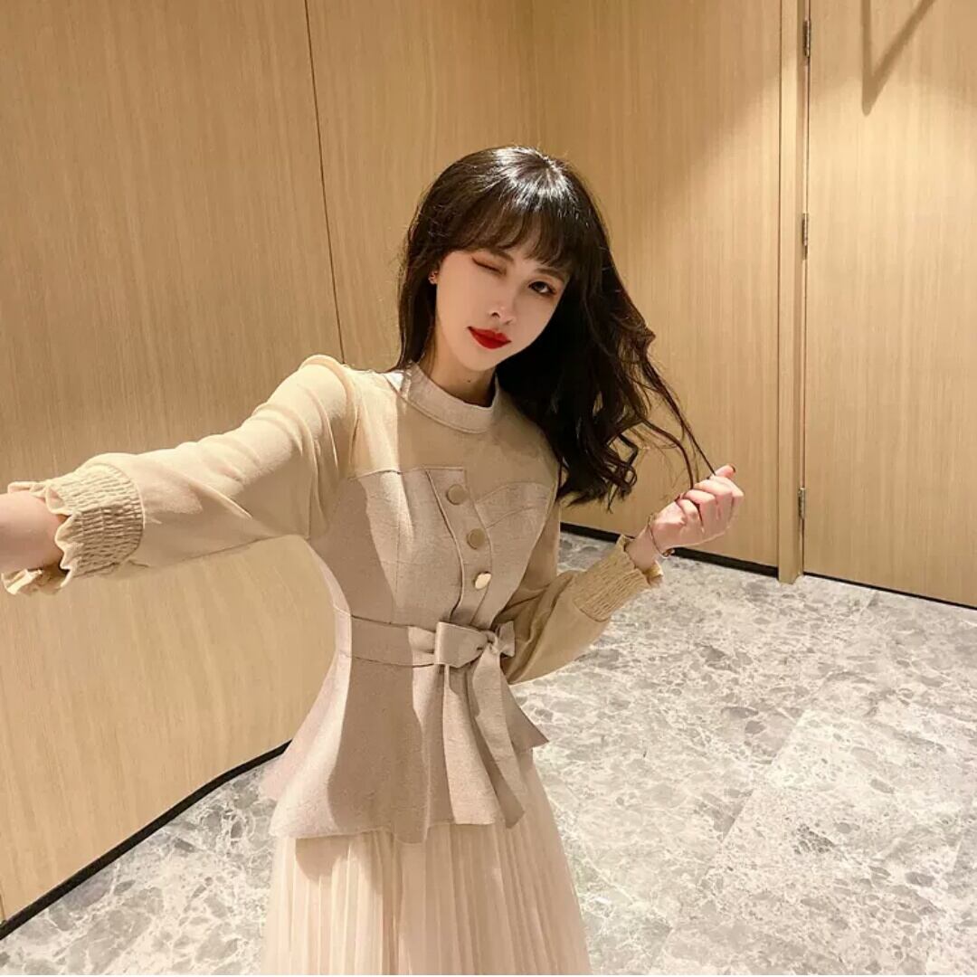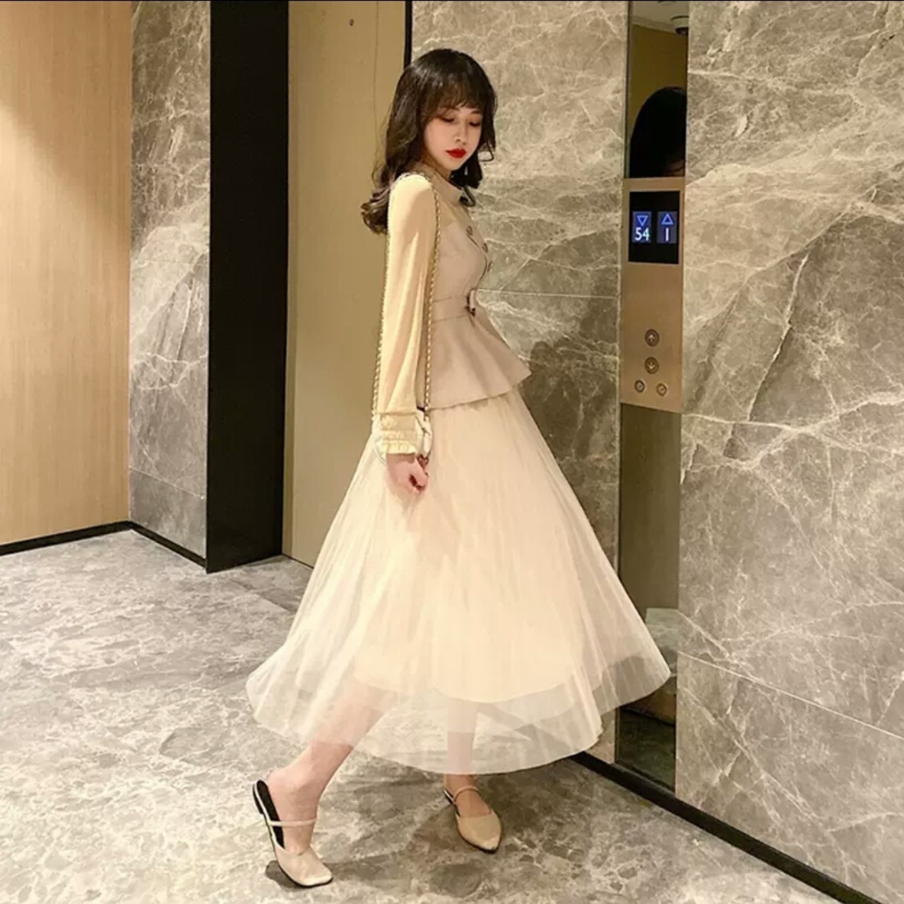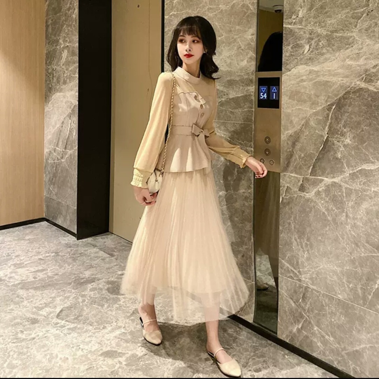 全2色 セットアップ マキシ丈 メッシュ スカート ブラウス トップス 長袖 大人 可愛い キレイめ 上品 お出かけ お買い物 デート 女子会 秋冬 春 通学 学生 通勤 韓国ファッション