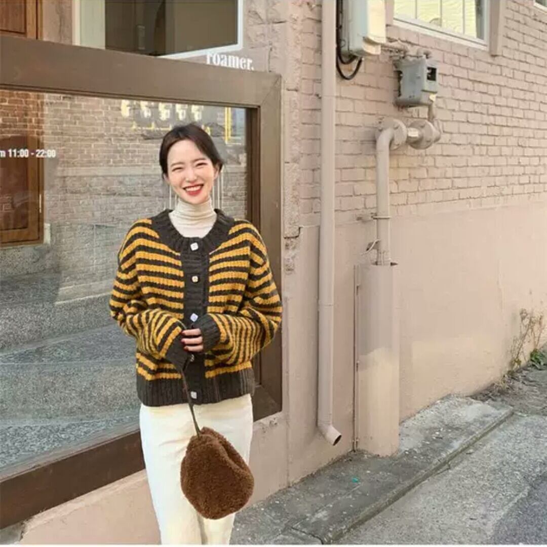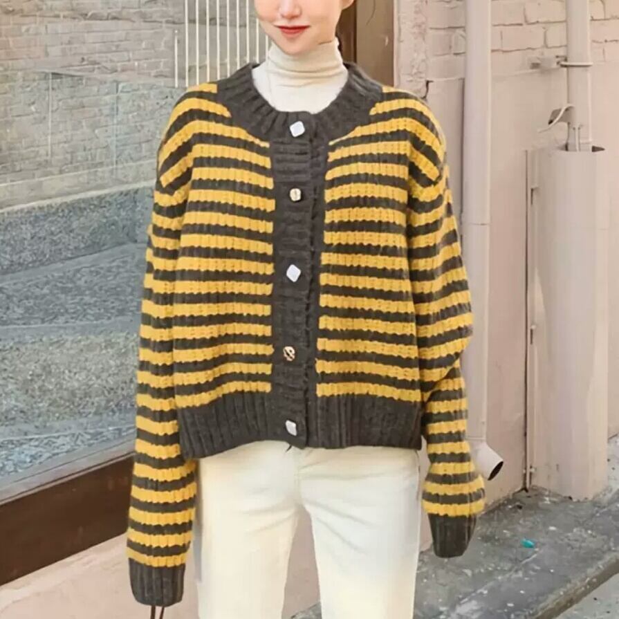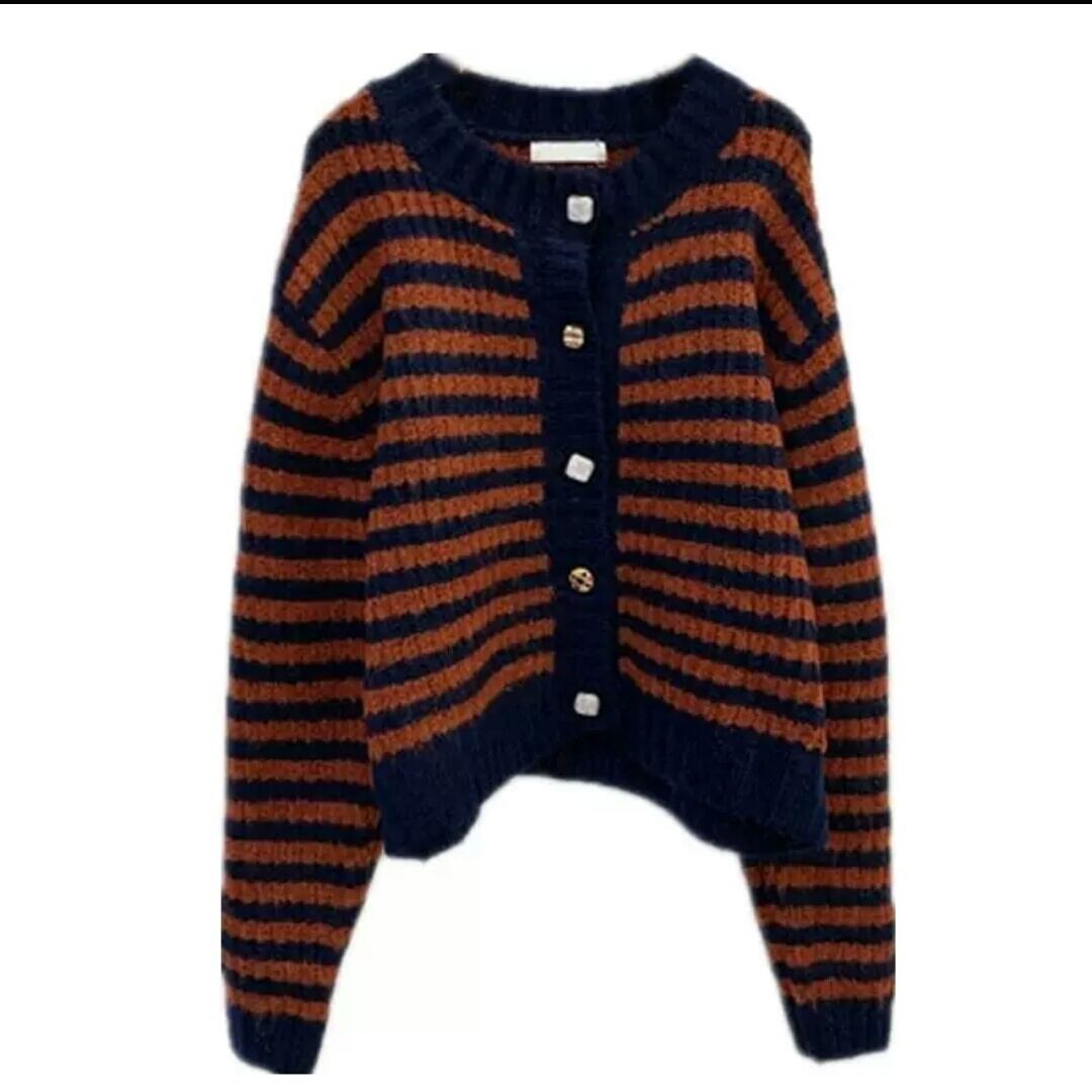 全2色 ボーダー ニット カーディガン 大人 カジュアル キレイめ シンプル お出かけ お買い物 デート 女子会 秋冬 春 通学 学生 通勤 韓国ファッション