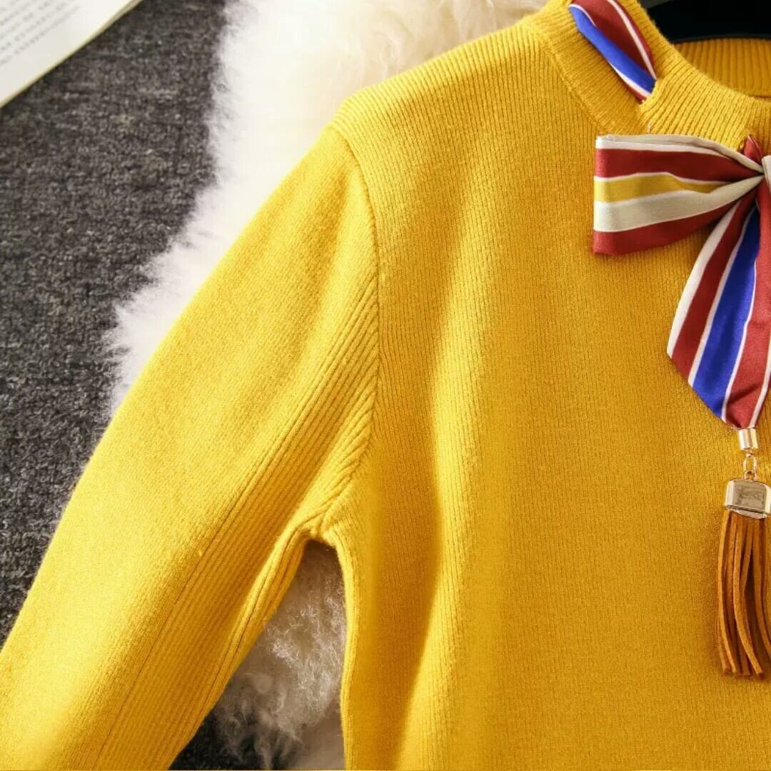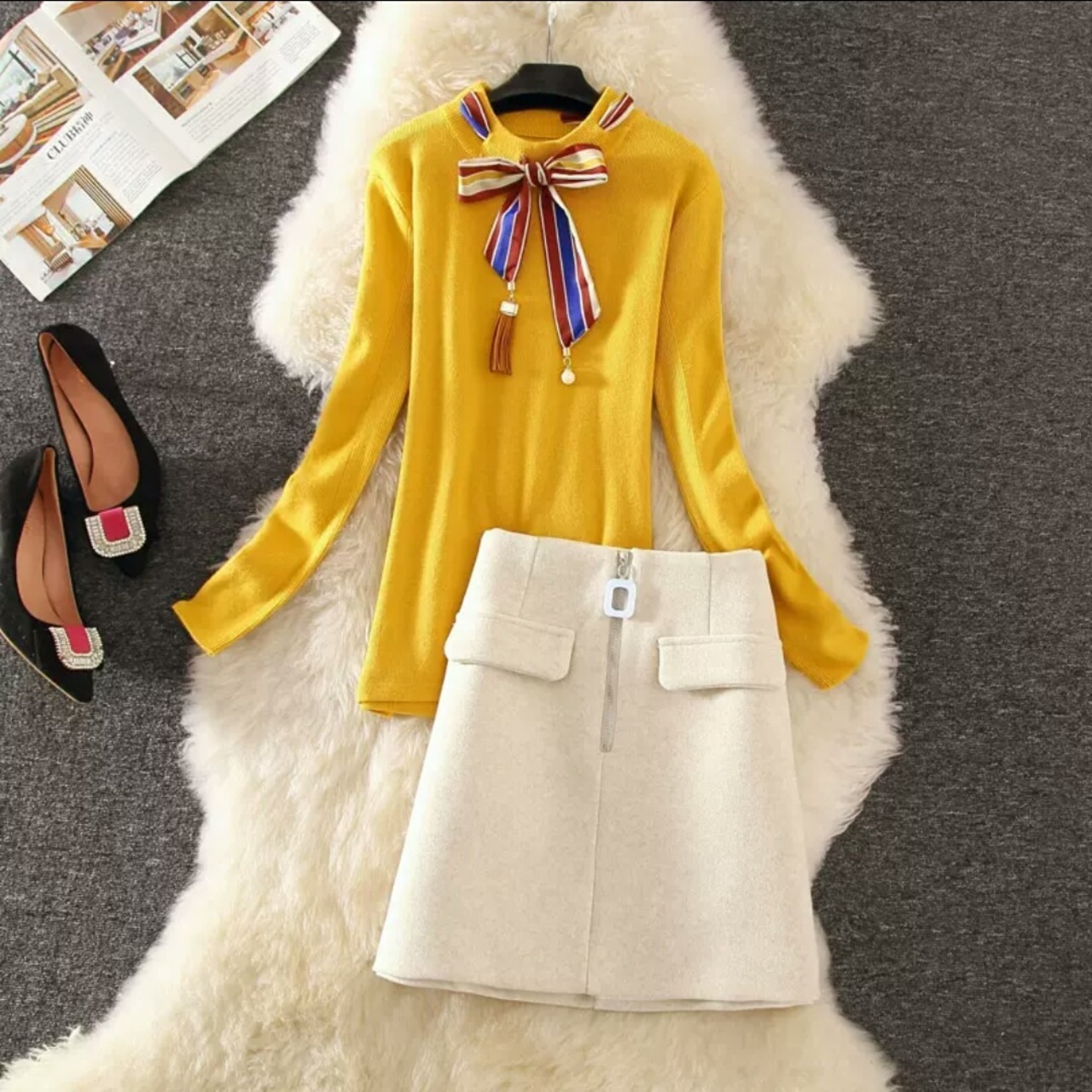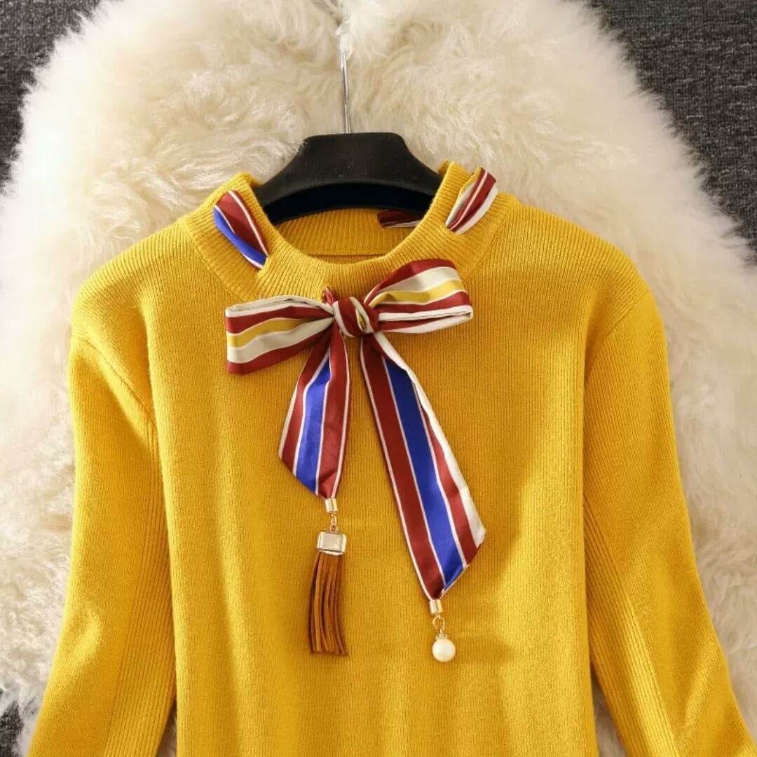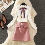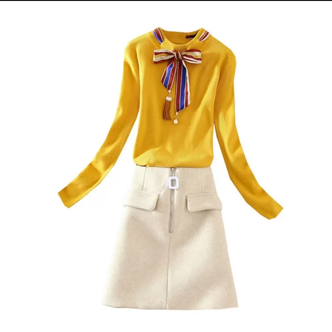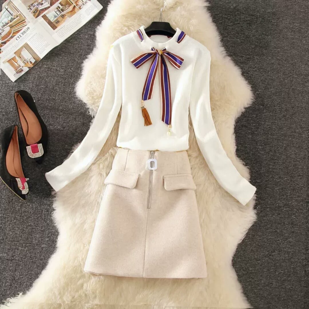 リボンつきのニットとシンプルなショート丈スカートです。