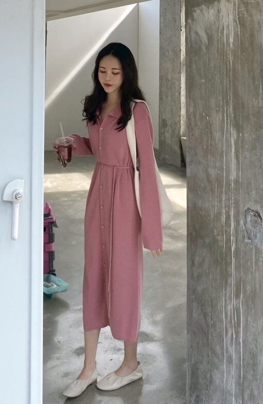 全2色 ワンピース ニットワンピース 上品 フロントボタン シャツワンピース ロングスリーブ ウエストリボン カジュアル 大人可愛い 無地 秋 春 冬