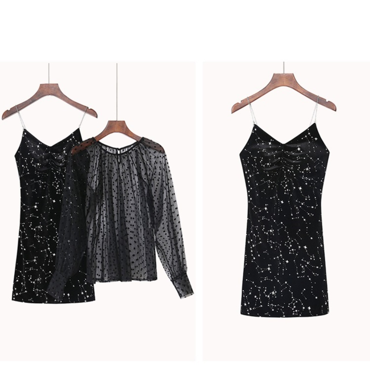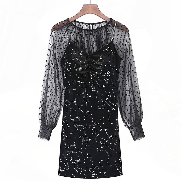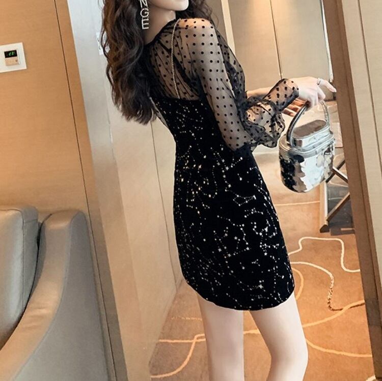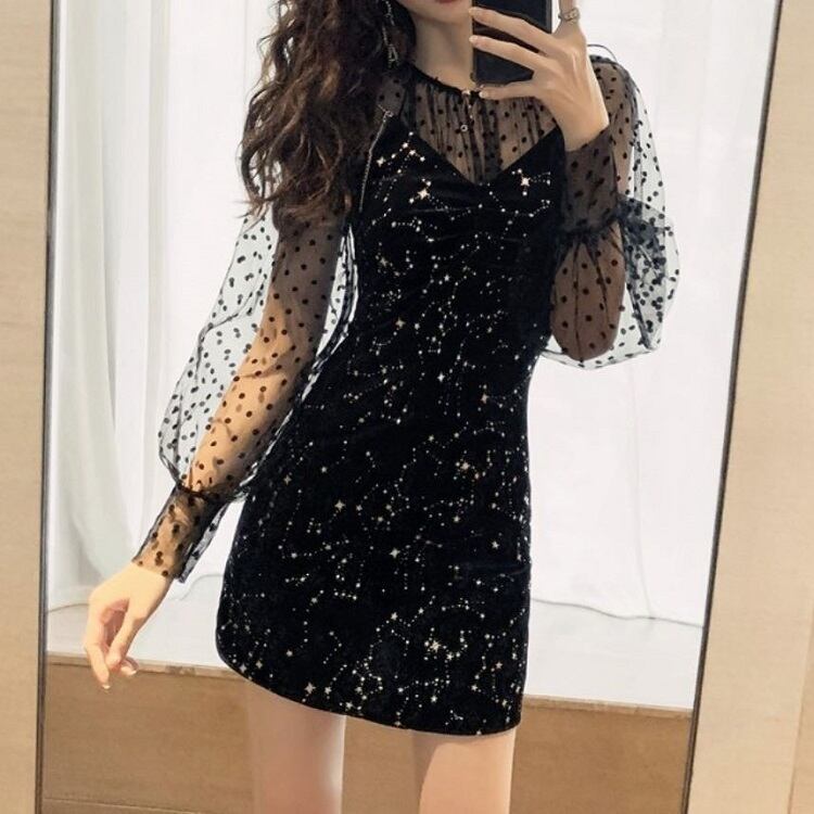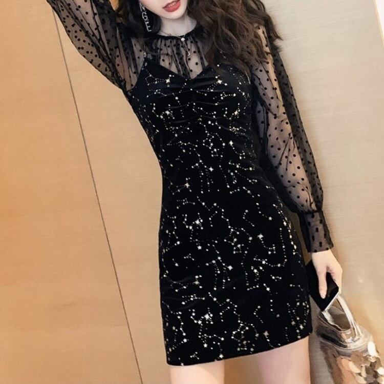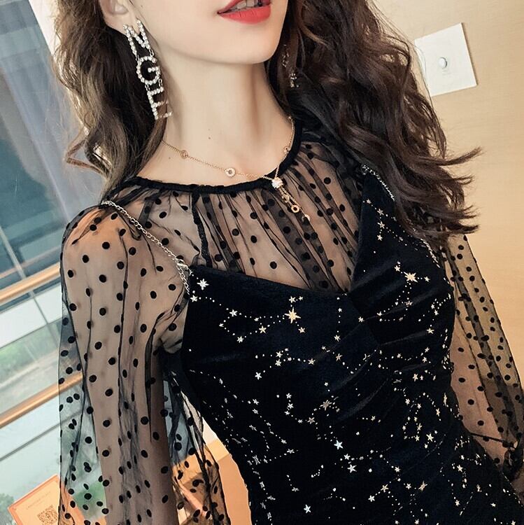 セットアップ ミニドレス パーティドレス シースルー フォーマル メッシュブラウス 星 きれいめ セクシー パーティ ブラック