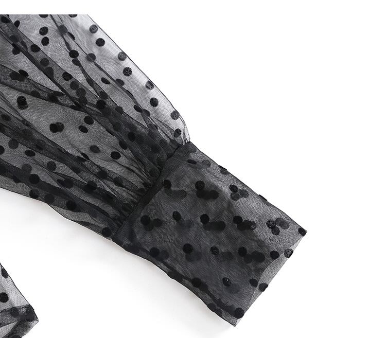 シースルーのドットブラウスとタイトなワンピースのセットアップです。
