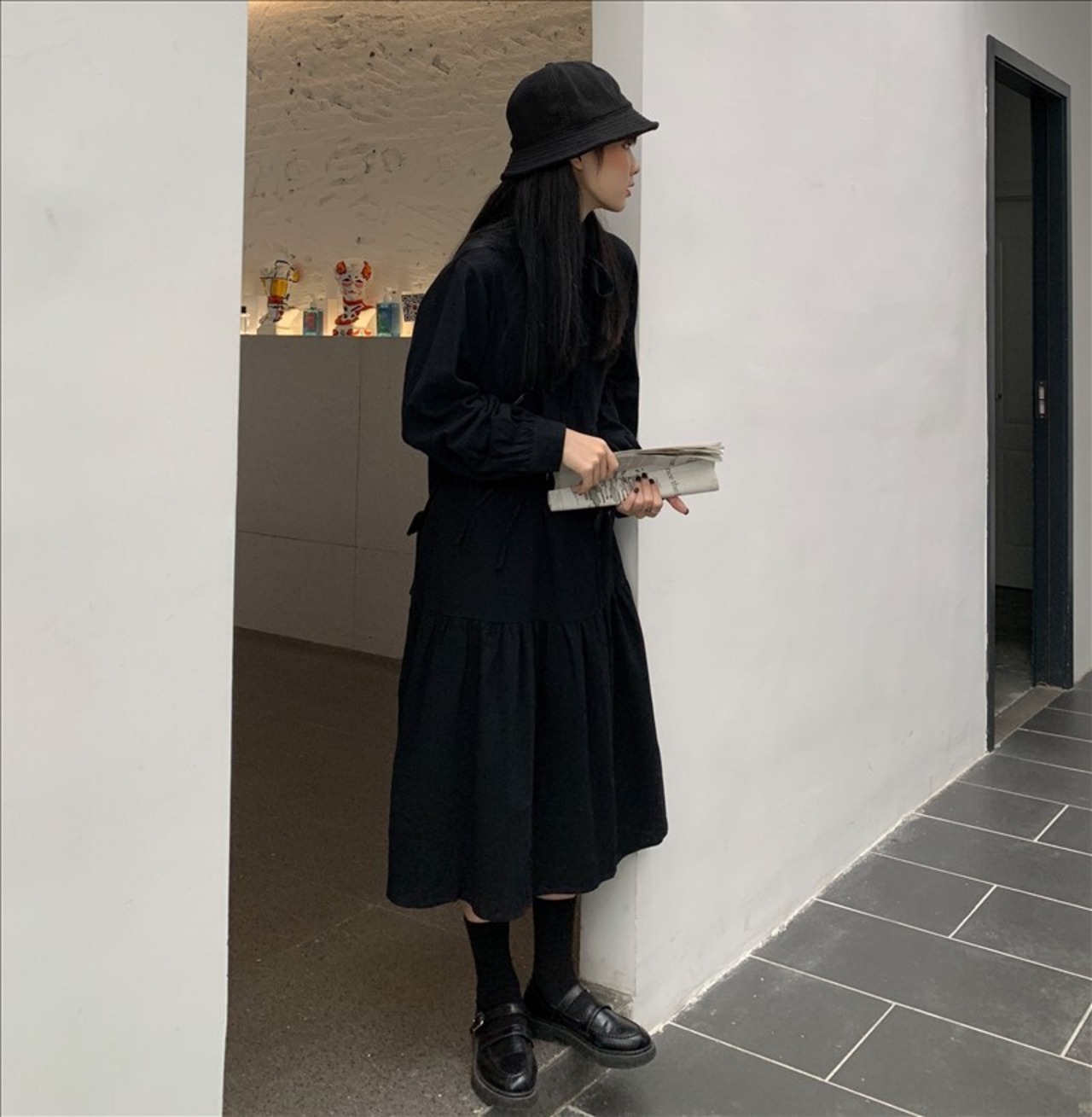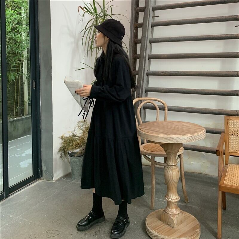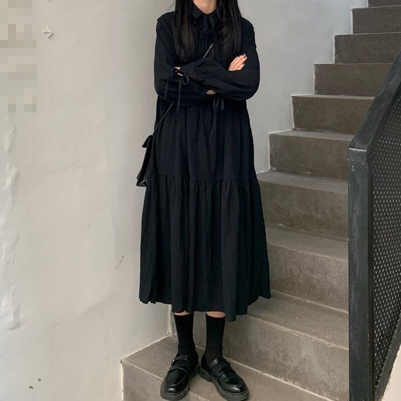 ワンピース ミモレ丈 ティアード 長袖 ロック レトロ ダーク ゆったり フレア Aライン ボウタイネック 無地 カジュアル きれいめ 秋 冬 春