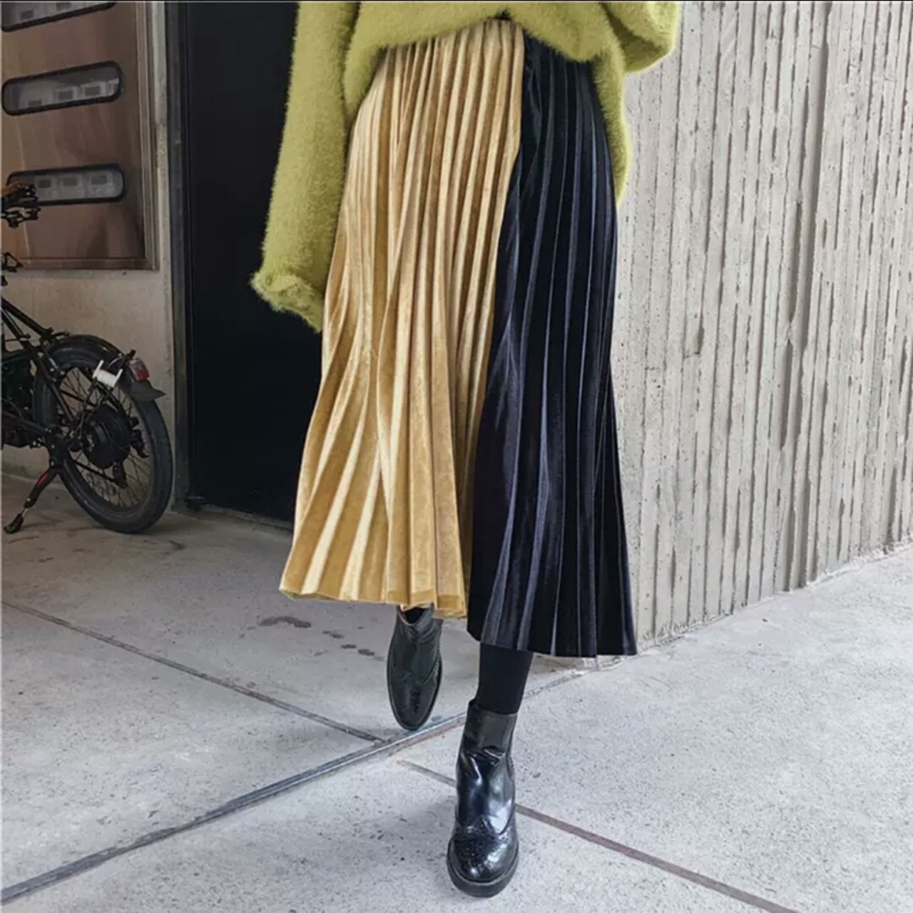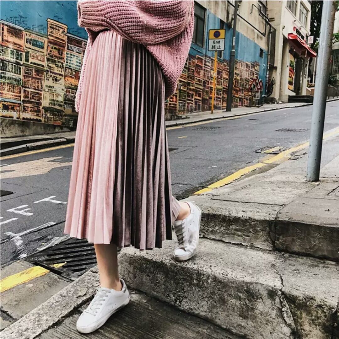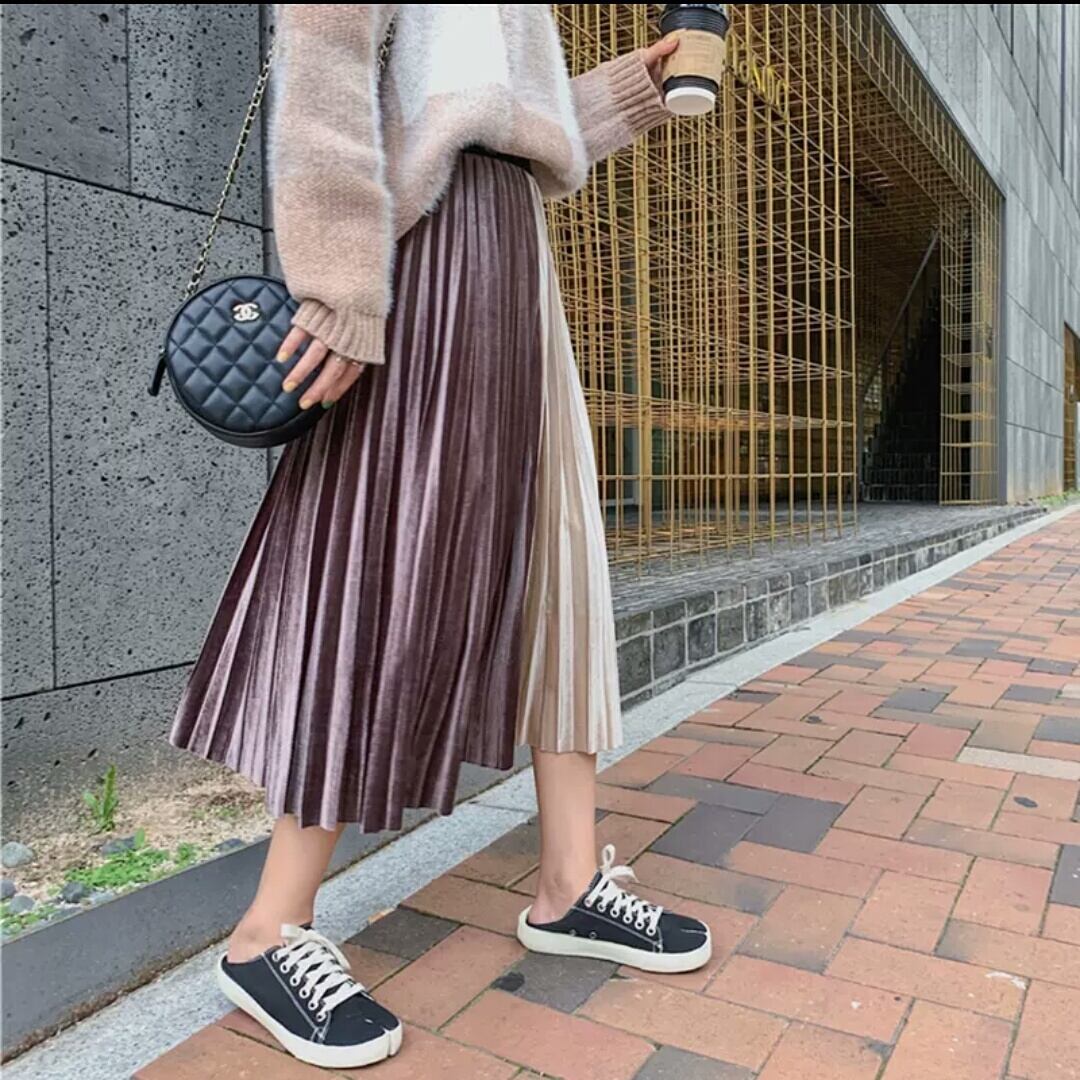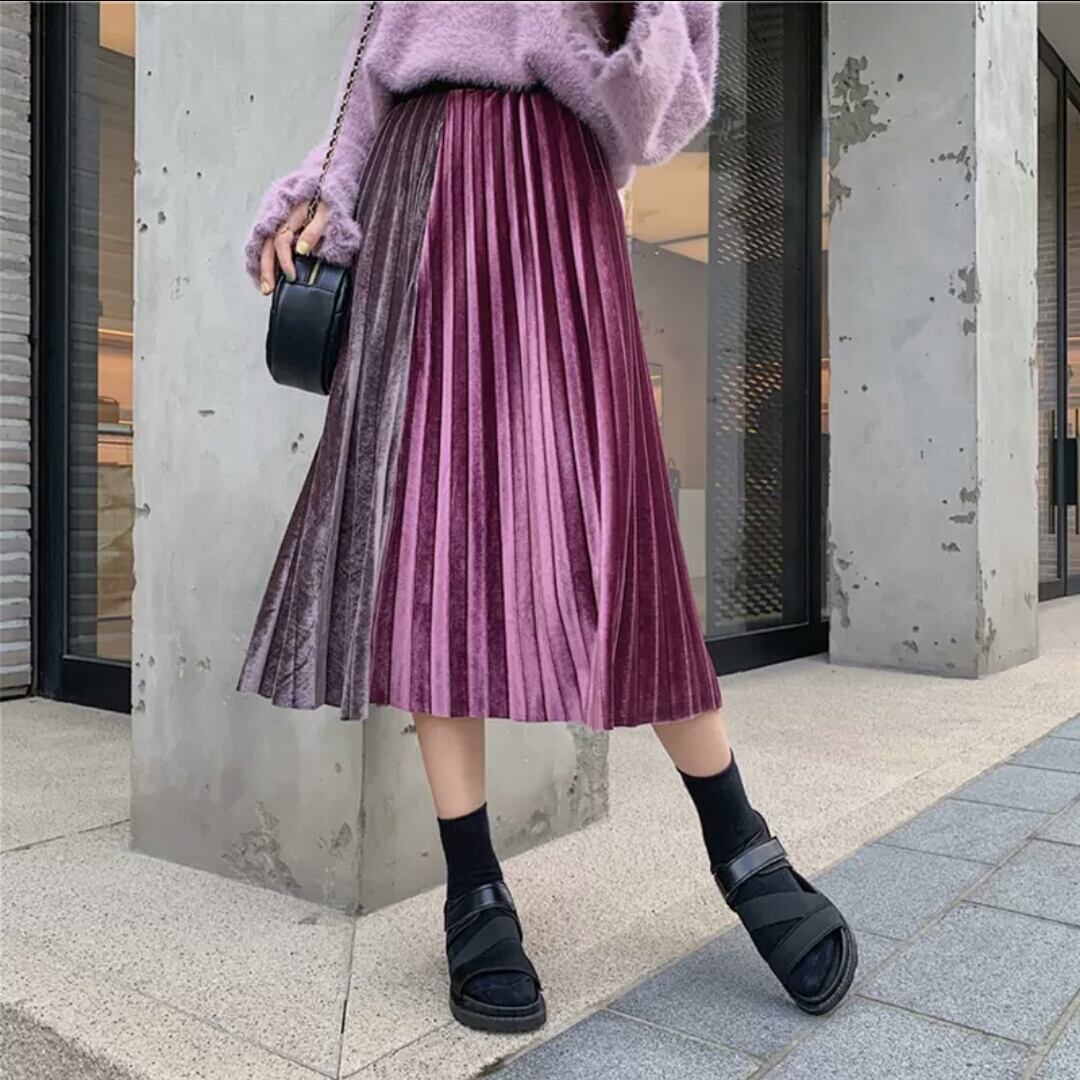 全6色 バイカラー プリーツ ベルベット スカート フリーサイズ ゴムウエスト 大人 可愛い カジュアル キレイめ 上品 お出かけ お買い物 デート 女子会 秋冬 春 通学 学生 通勤 韓国ファッション