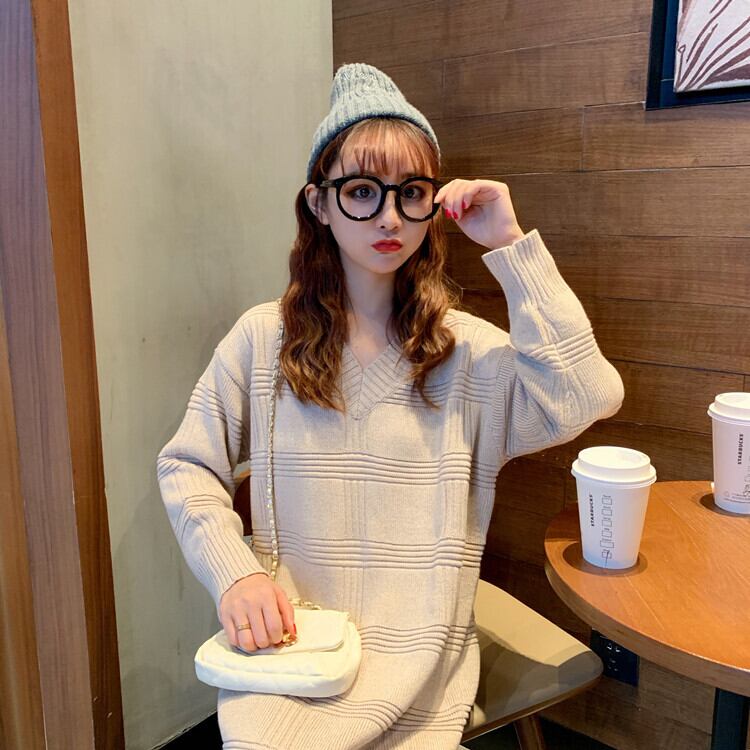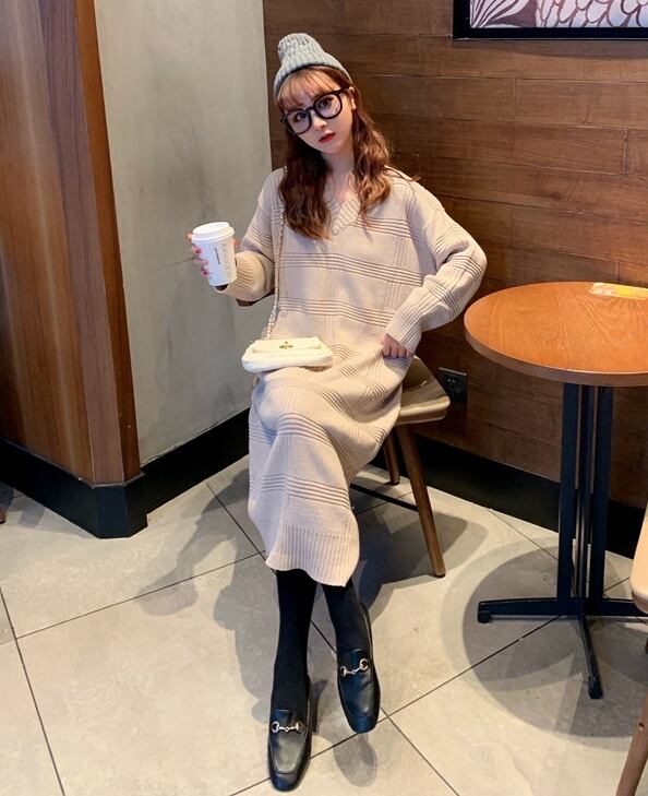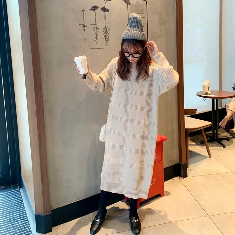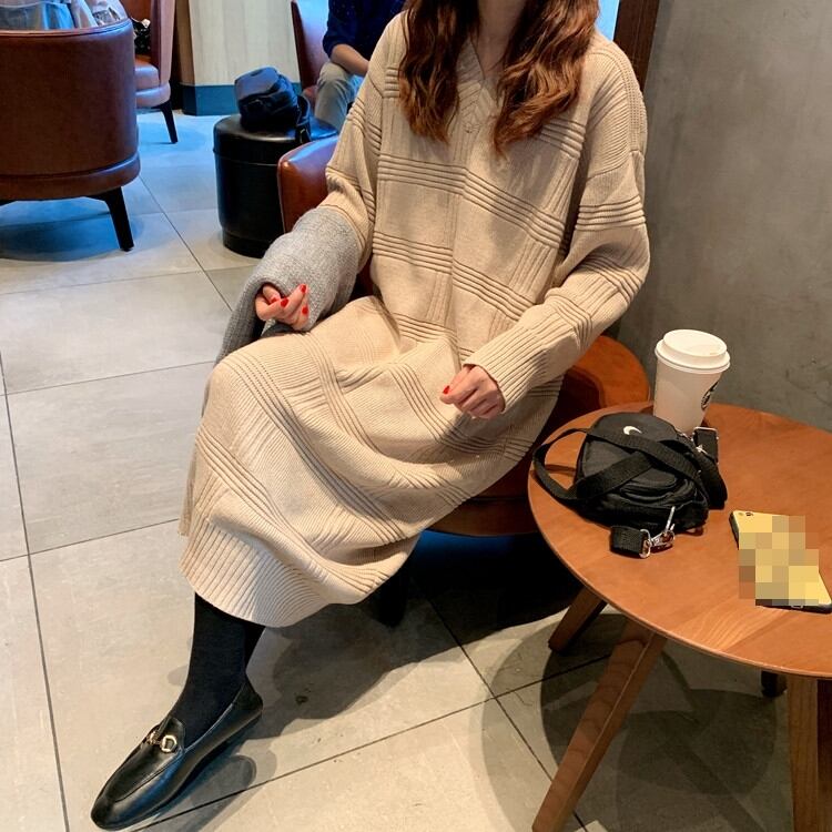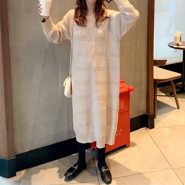 全2色 ワンピース ニットワンピース ゆったり ミモレ丈 体型カバー Vネック カジュアル 大人 デイリー シンプル 秋 春 冬