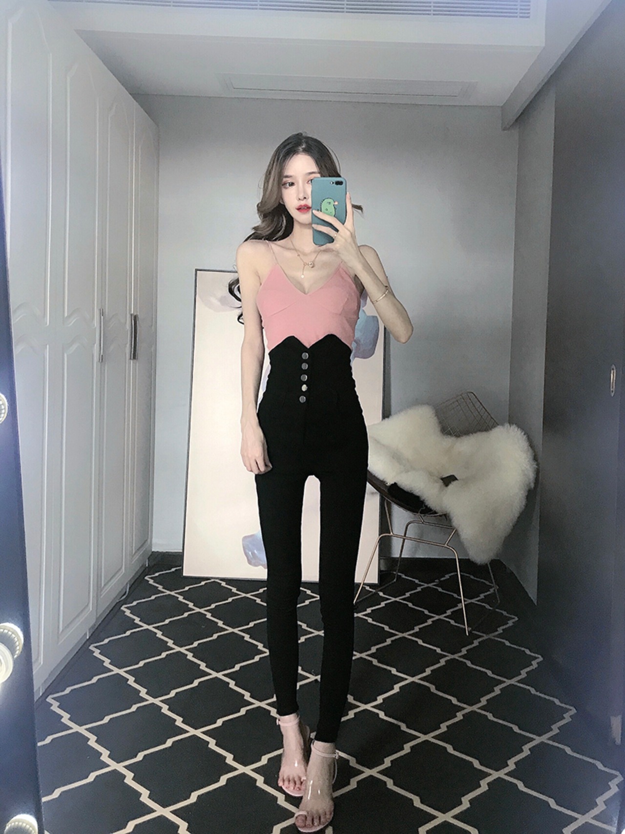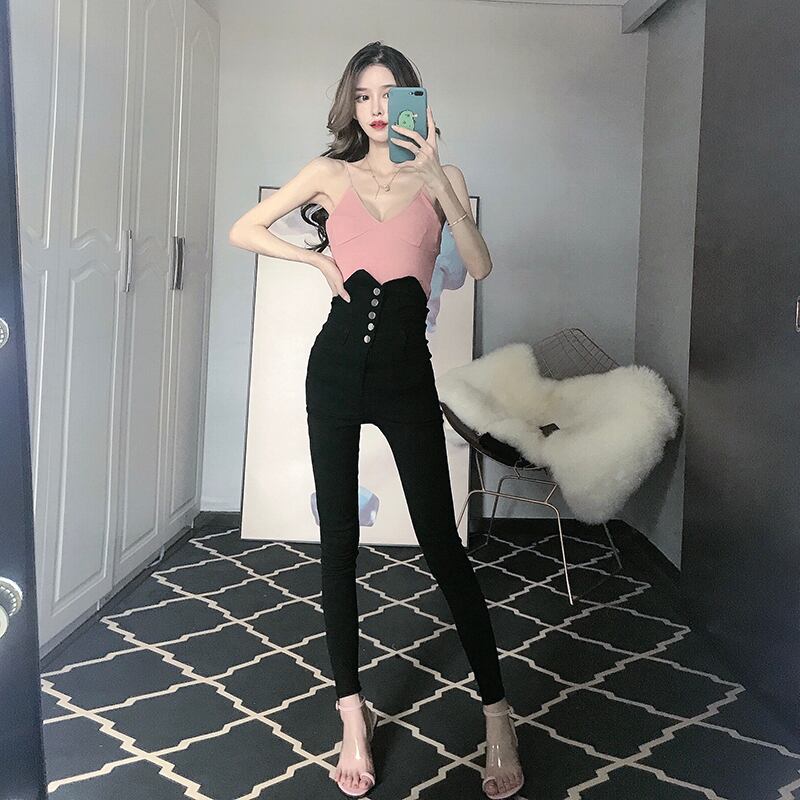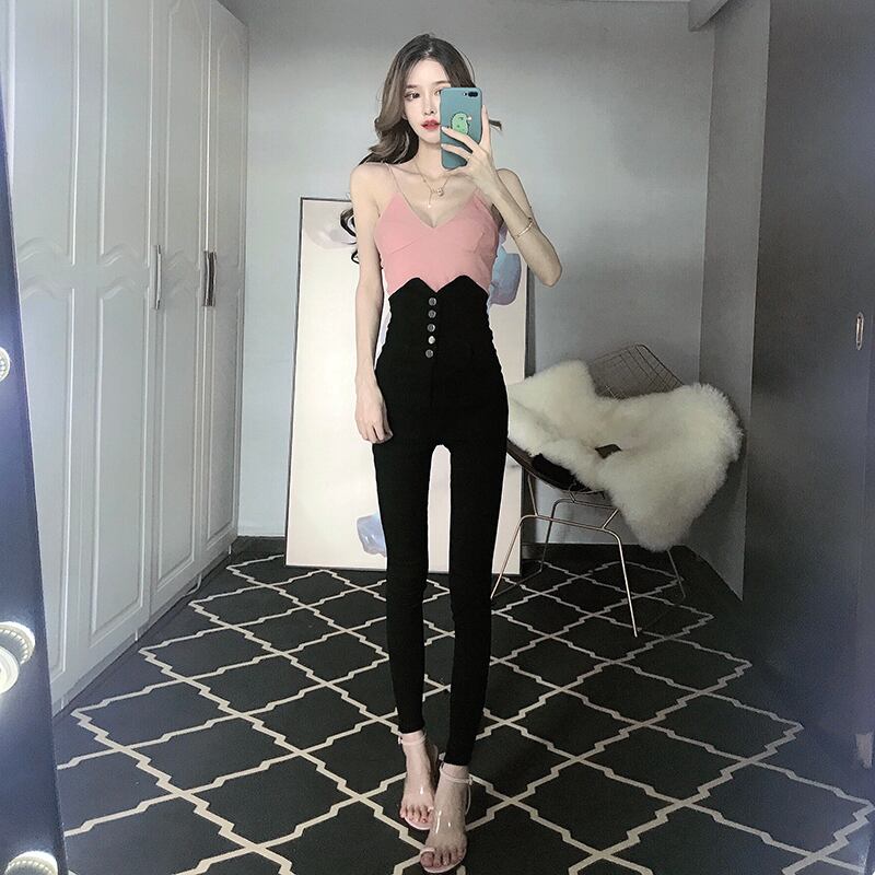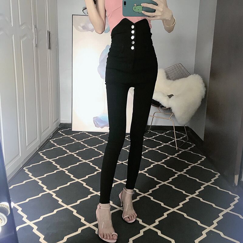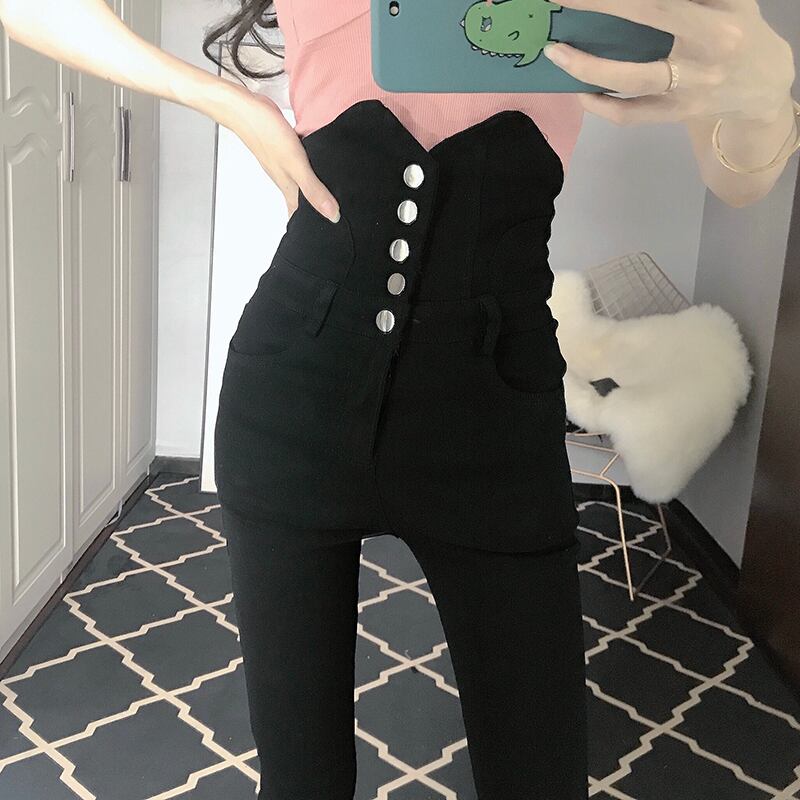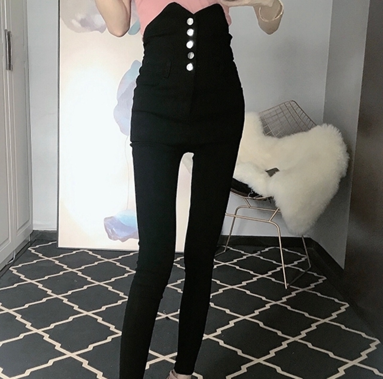 パンツ ボトムス スキニー ハイウエスト ボタン フィット 無地 上品 ストレッチ ロック クール スタイルアップ レギンス デート カジュアル 秋 春 冬