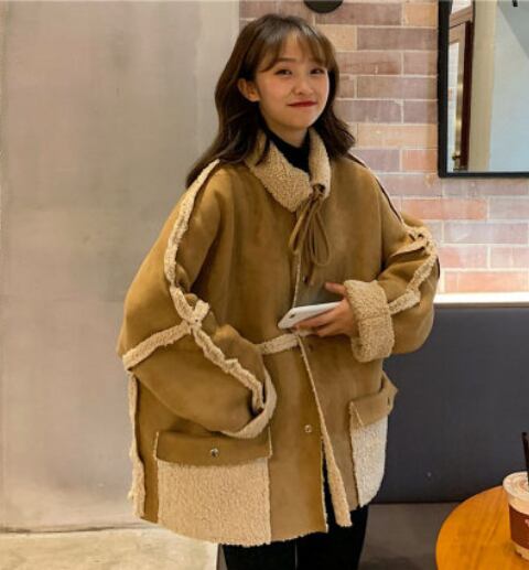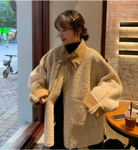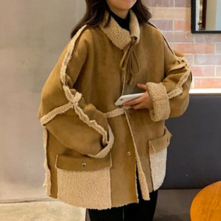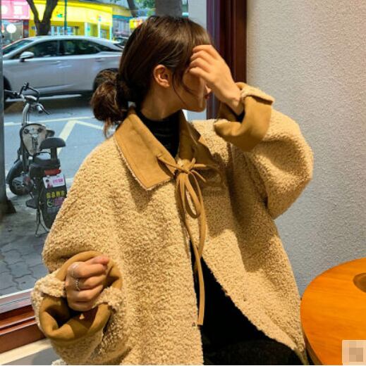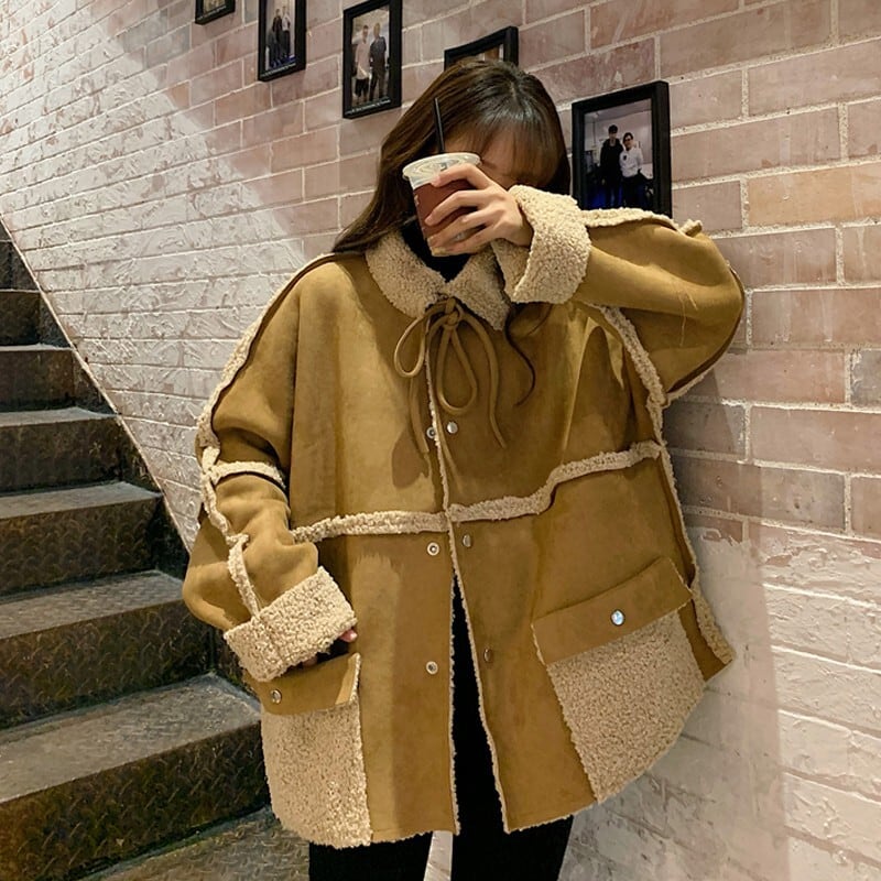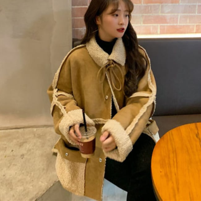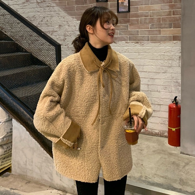 アウター ムートン もこもこ リバーシブル ゆったり ポケット オーバーサイズ ネックリボン フロントボタン ボアジャケット ガーリー 韓国ファッション カジュアル 秋 春 冬