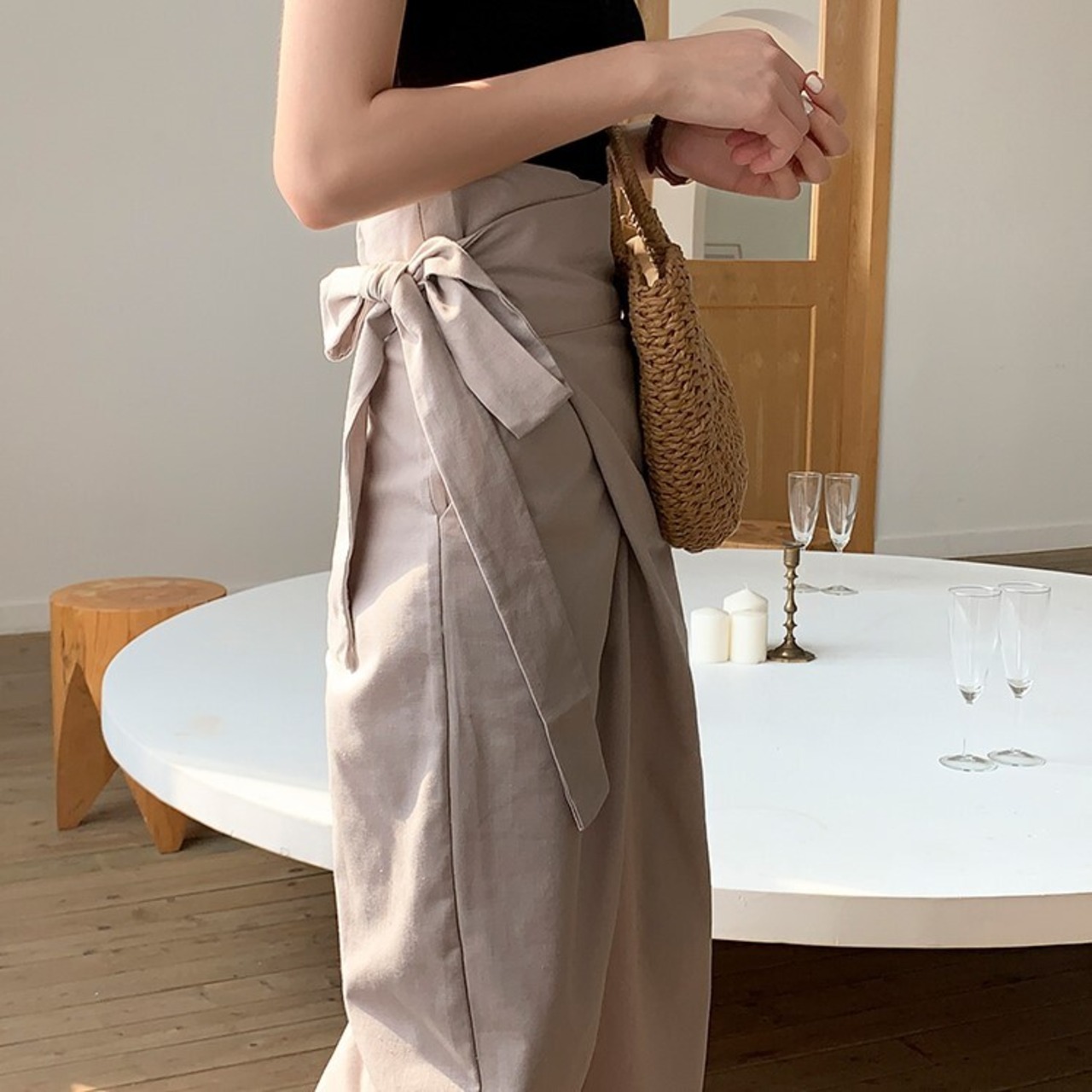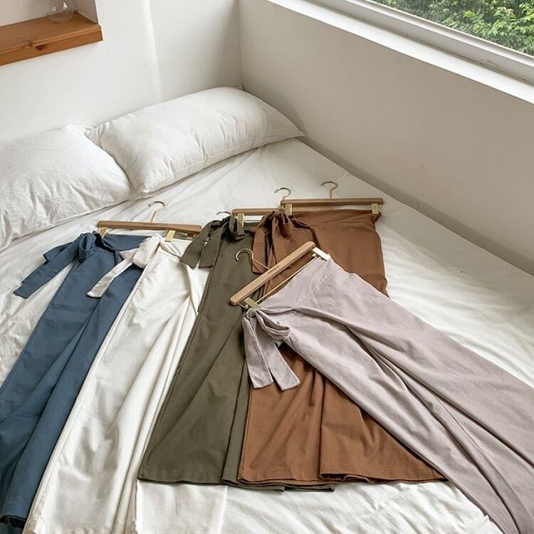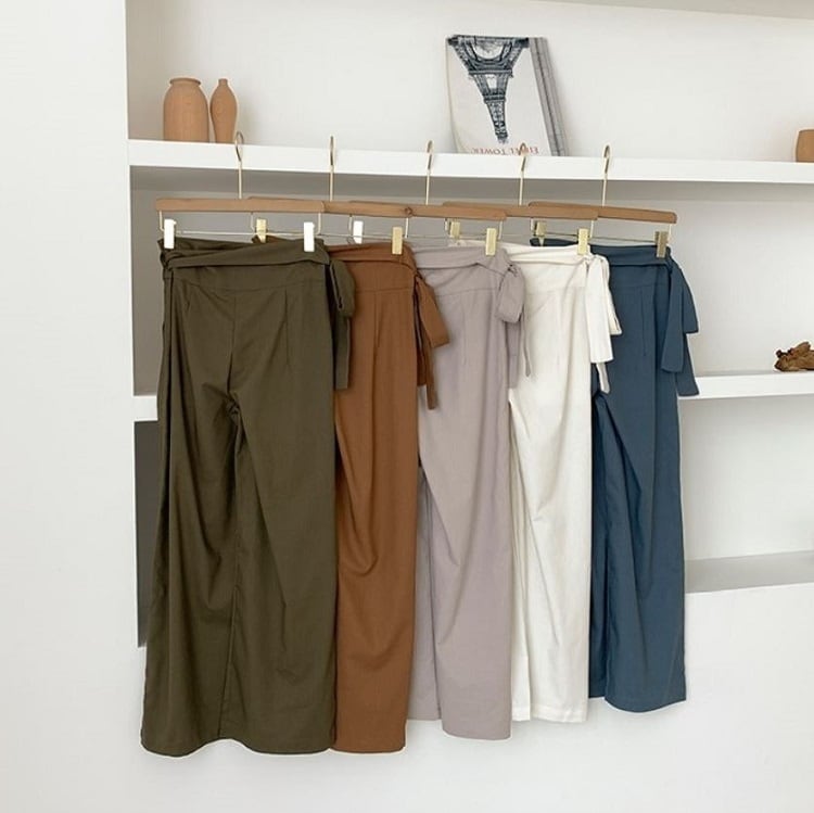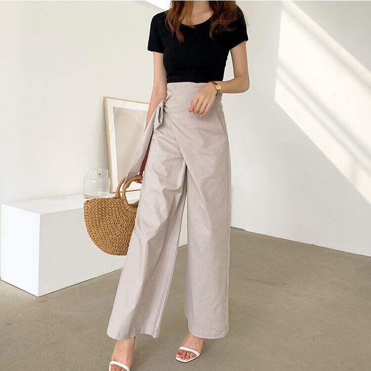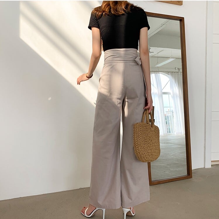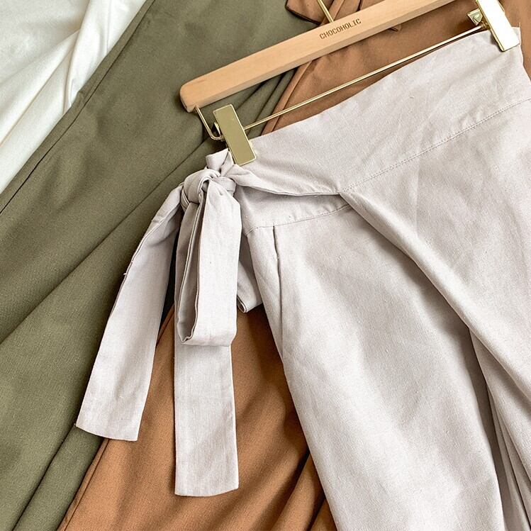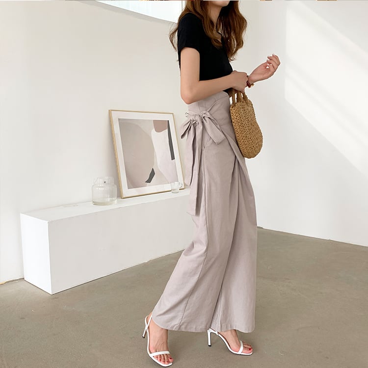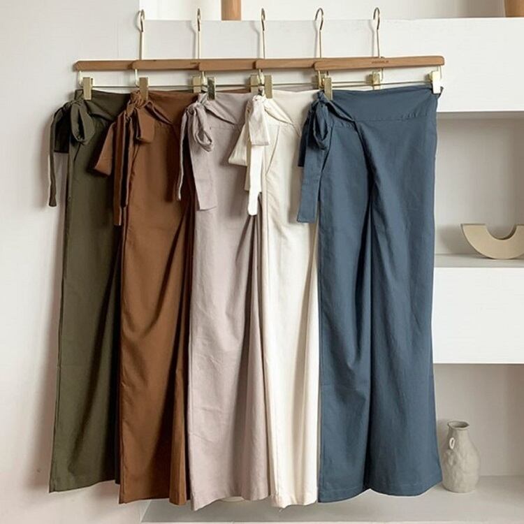 全5色 ワイドパンツ ロングパンツ 無地 麻 ウエストリボン ゆったり ルーズ きれいめ カジュアル お出かけ オフィス デイリー グリーン カーキ アプリコット ホワイト ブルー 春