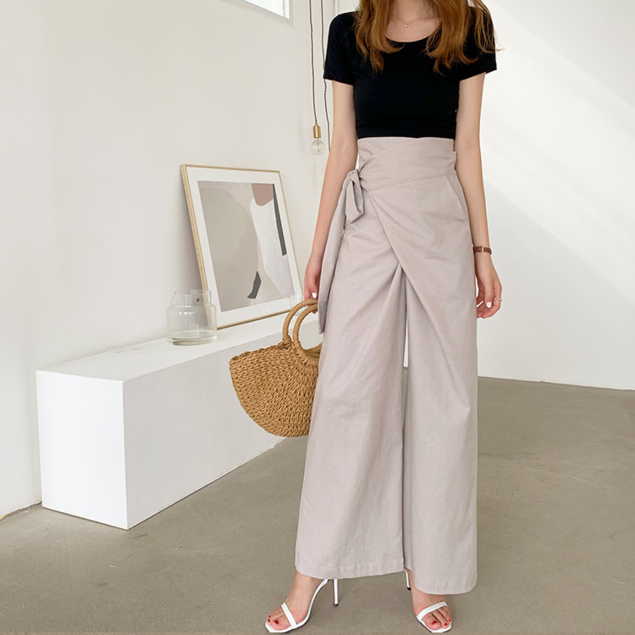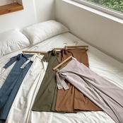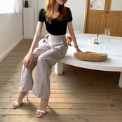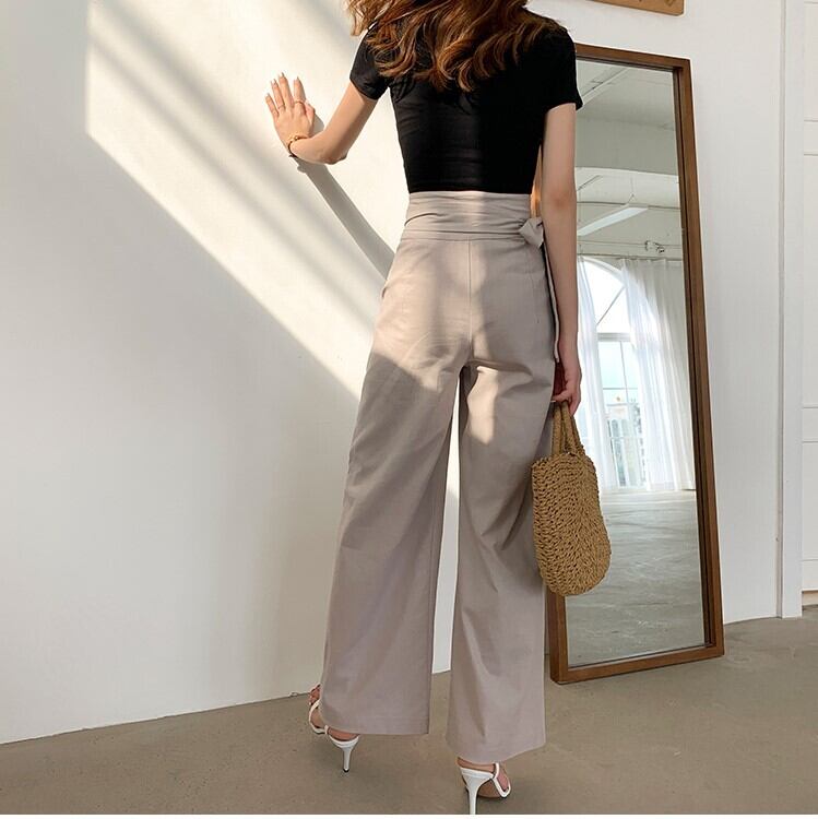 シンプルなゆったりシルエットで足長効果も期待できるハイウエスト。