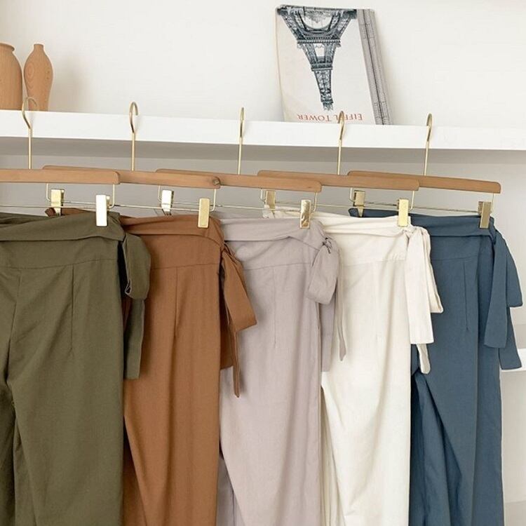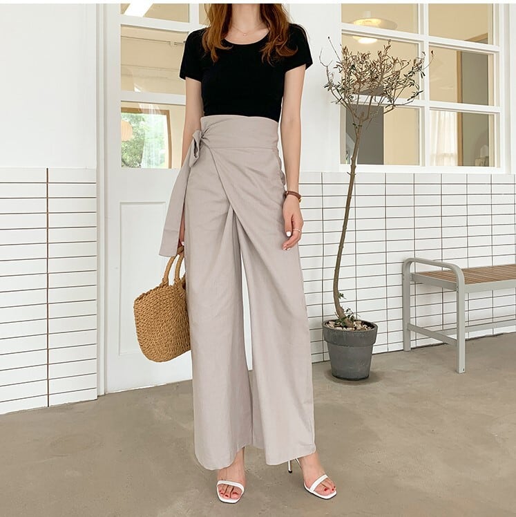巻きスカート風のデザインがかわいいワイドパンツです。