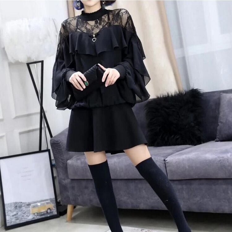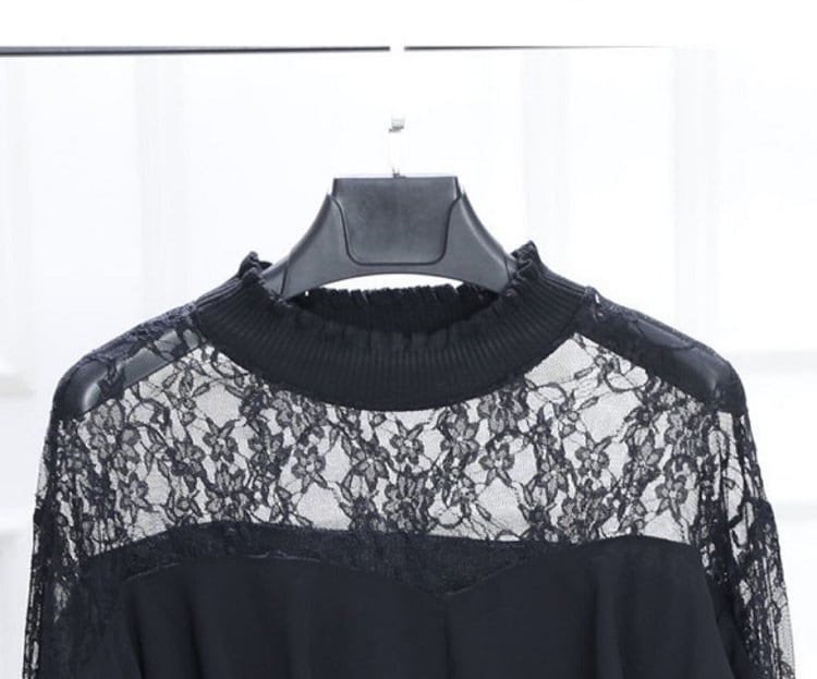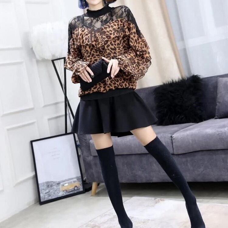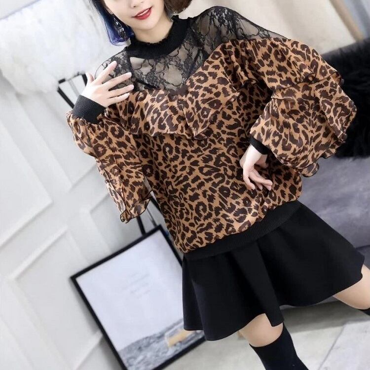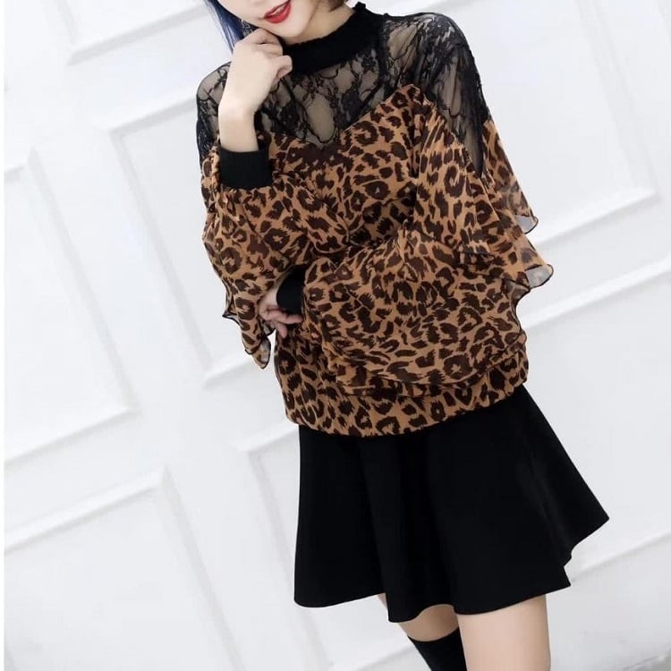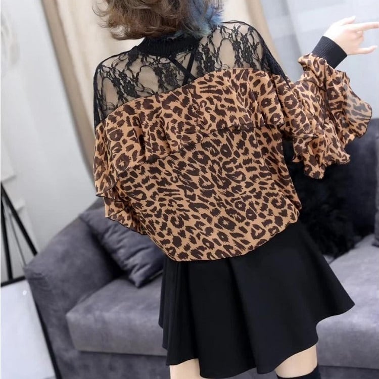 全2色 大きいサイズ トップス ブラウス プルオーバー レース切り替え スタンドカラー フリル パフスリーブ 長袖 ゆったり かわいい きれいめ カジュアル お出かけ デート ブラック ヒョウ柄 春