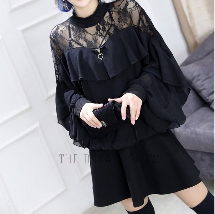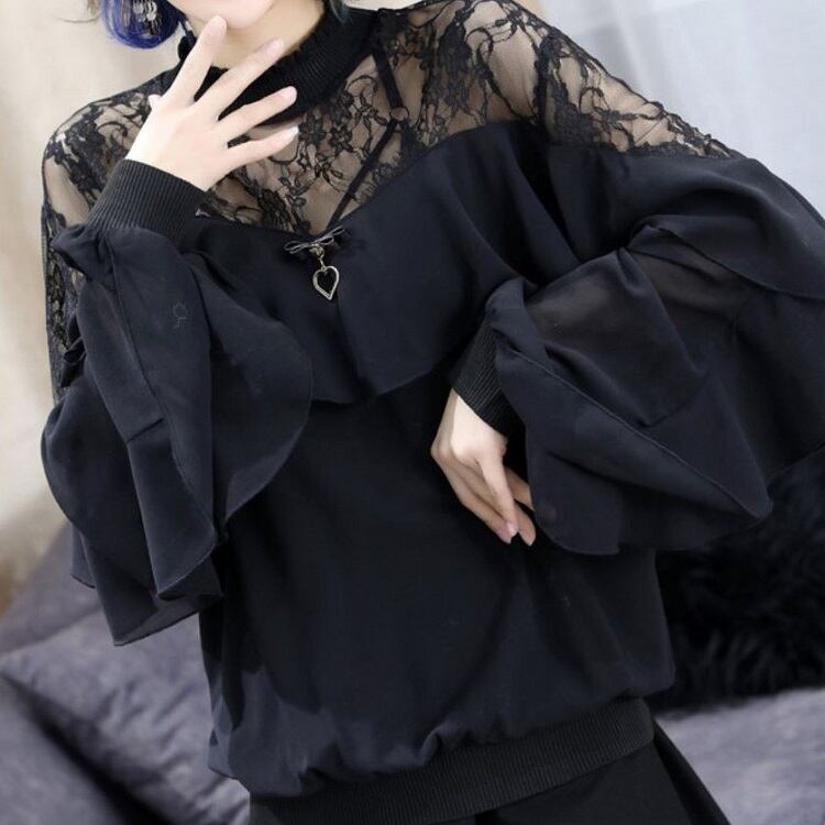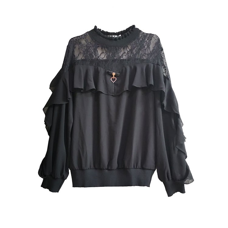 胸元の切り替えレースとボリューム感のあるフリルがロマンチックなブラウス。