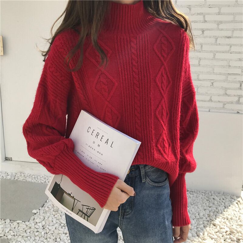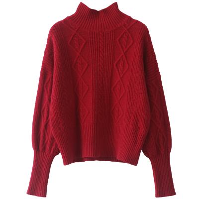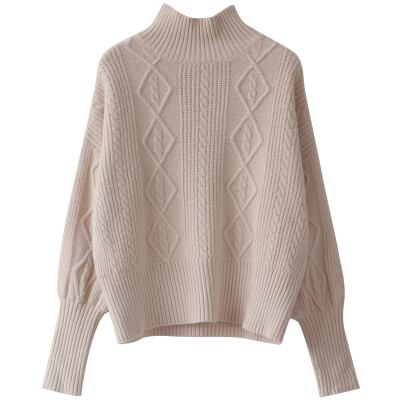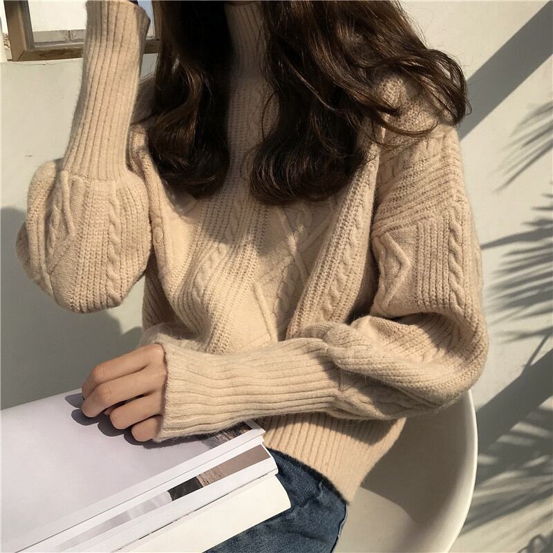 全2色トップス ニット セーター ハイネック 上品 デート デイリー ゆったり ショート ツイストニット ランタンスリーブ あったか カジュアル 大人 秋 冬 春