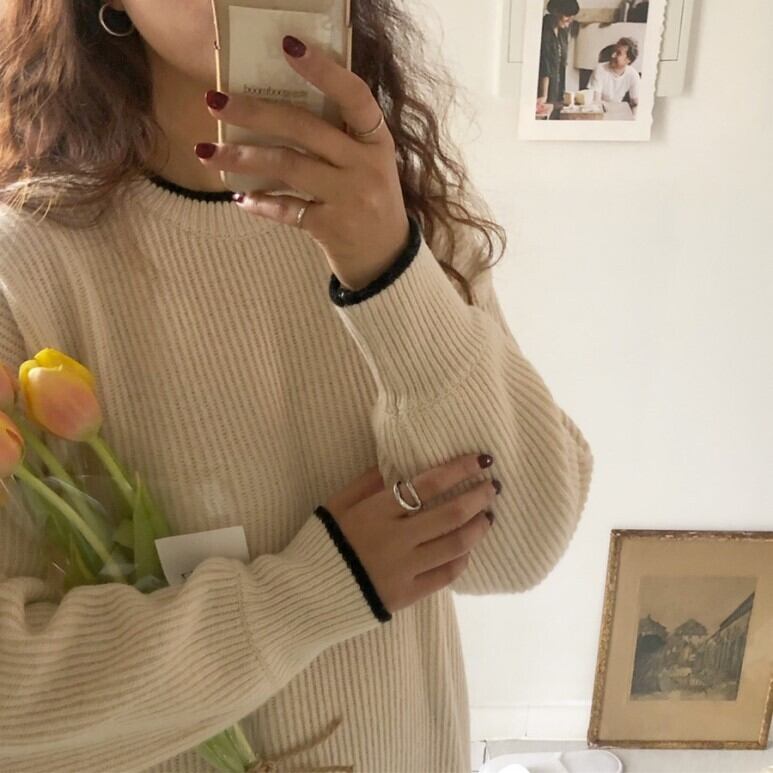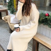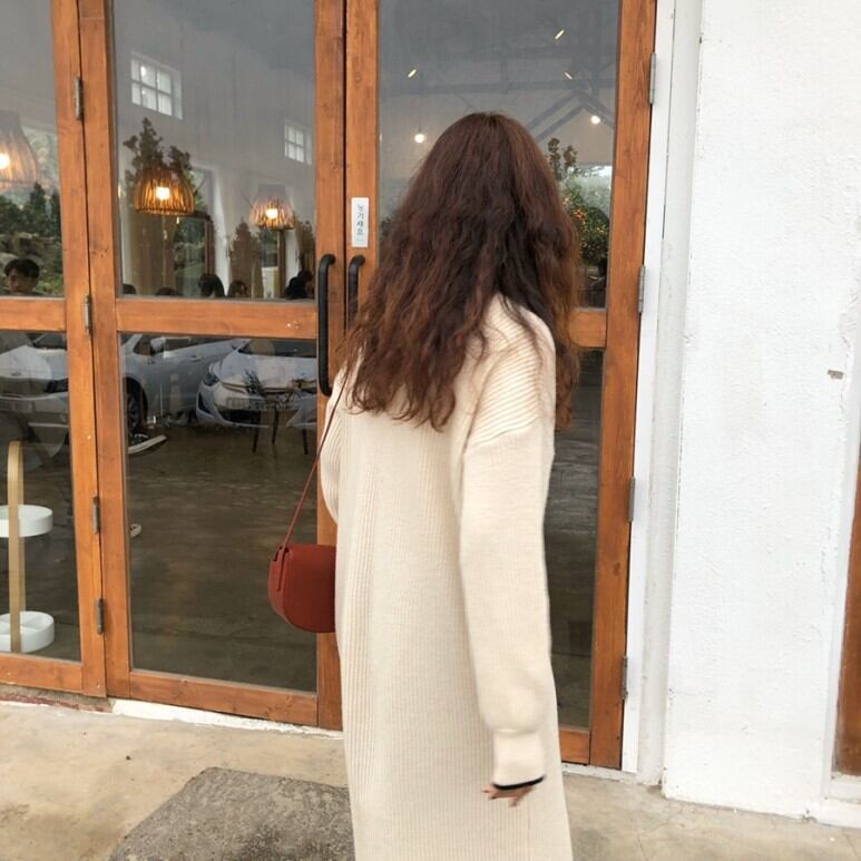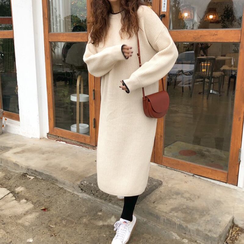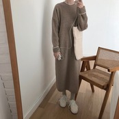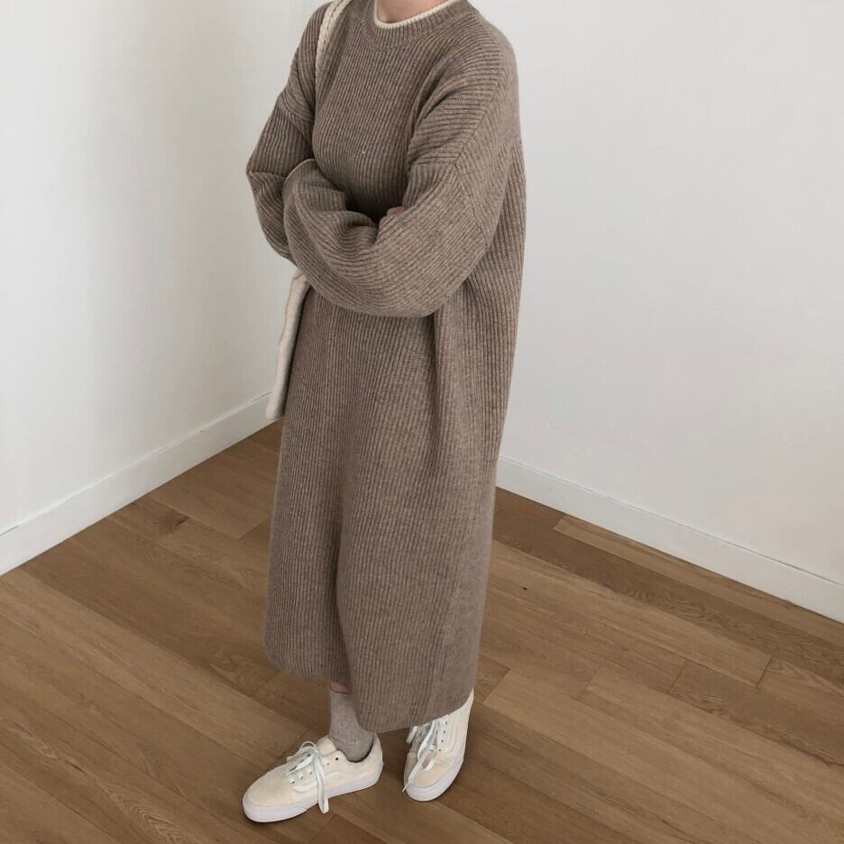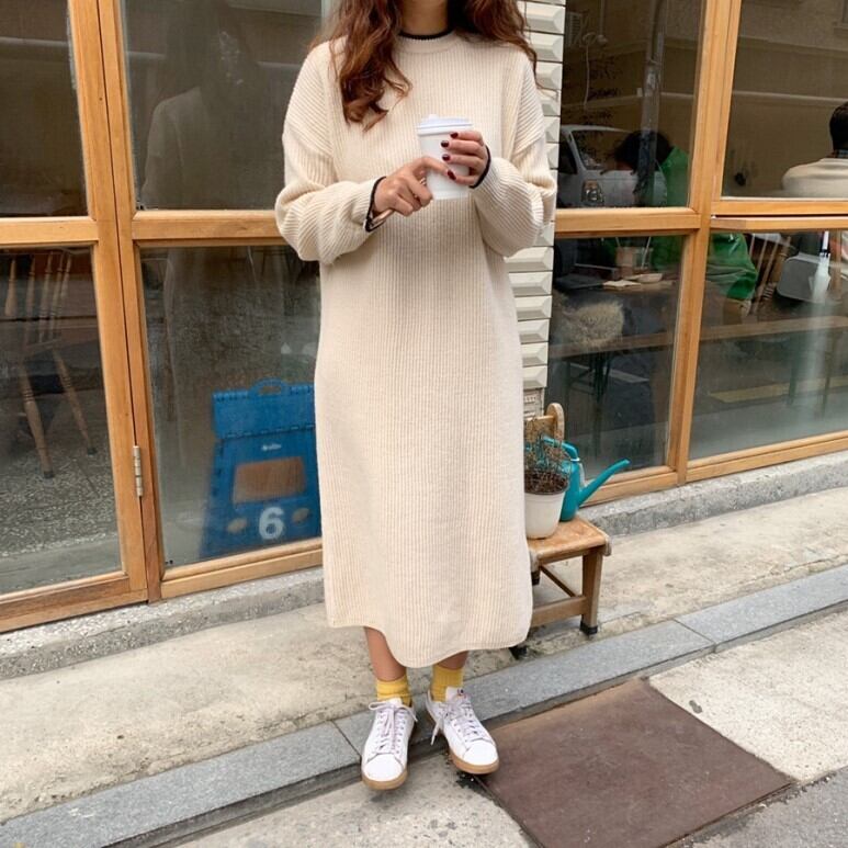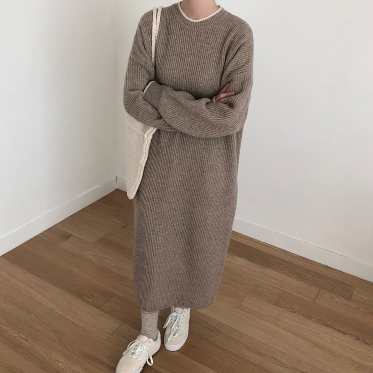 全2色 ワンピース ニットワンピース ミモレ丈 ゆったりめ クルーネック リブニット 上品 大人 デイリー 韓国ファッション ゆったり あったか カジュアル 秋 冬 春