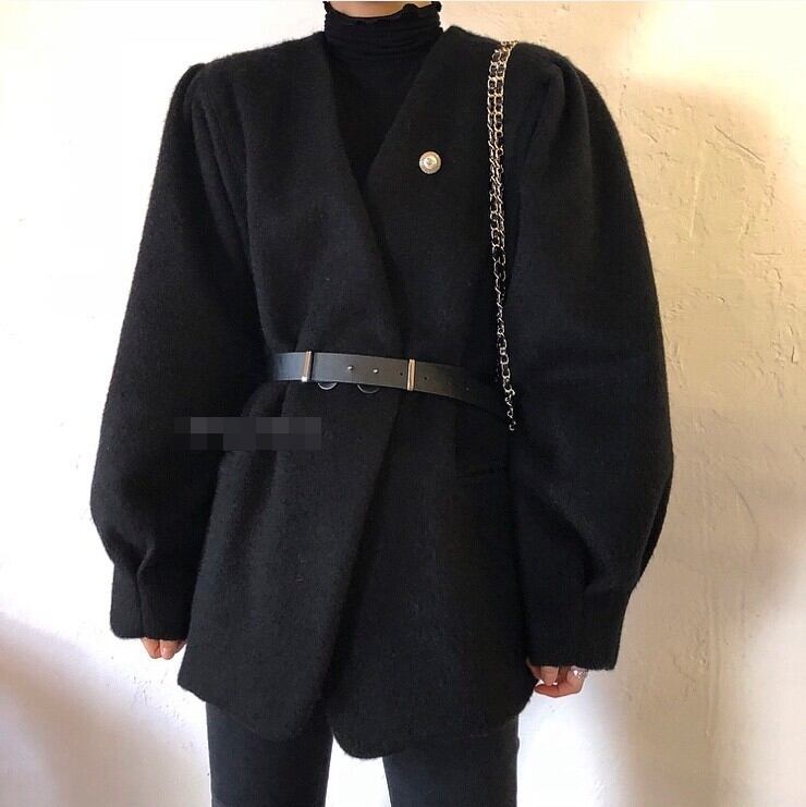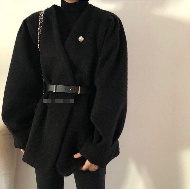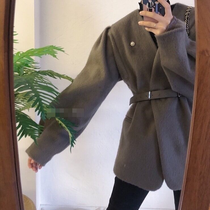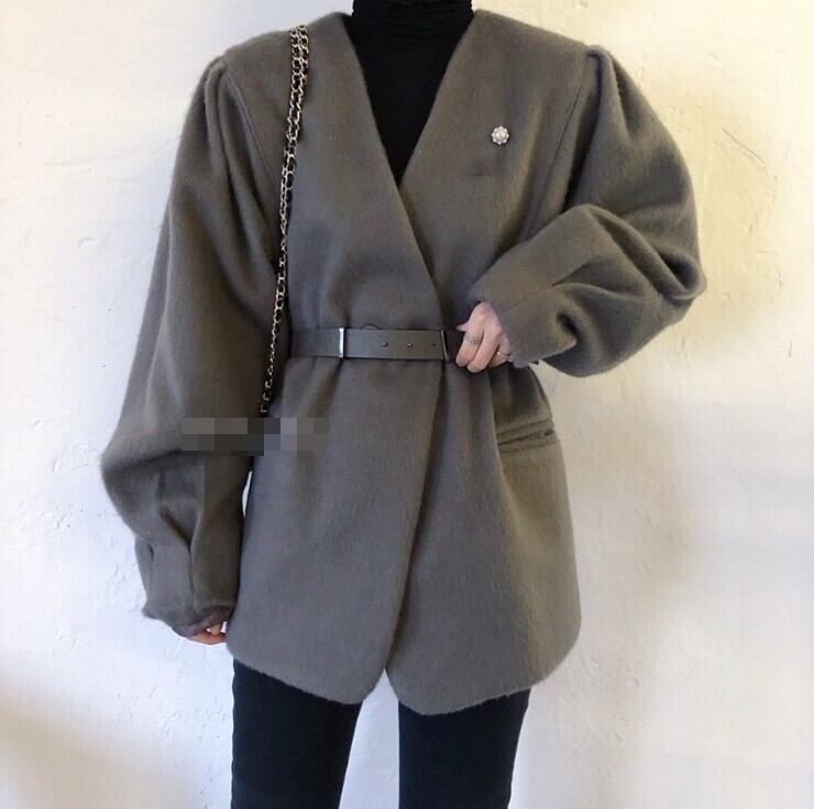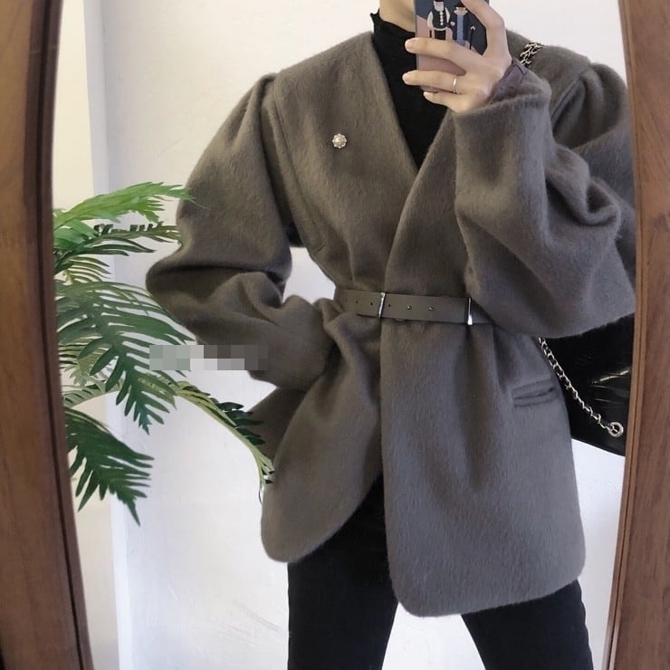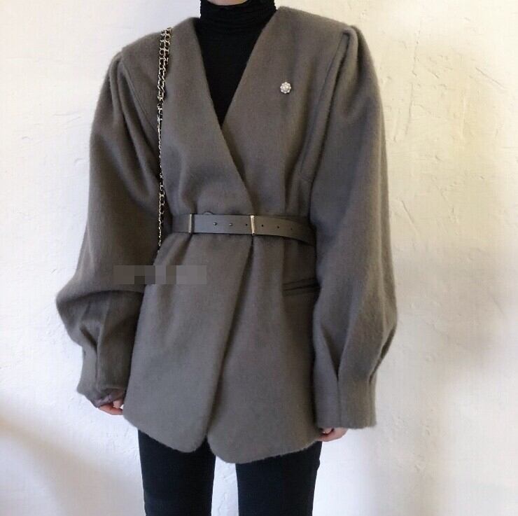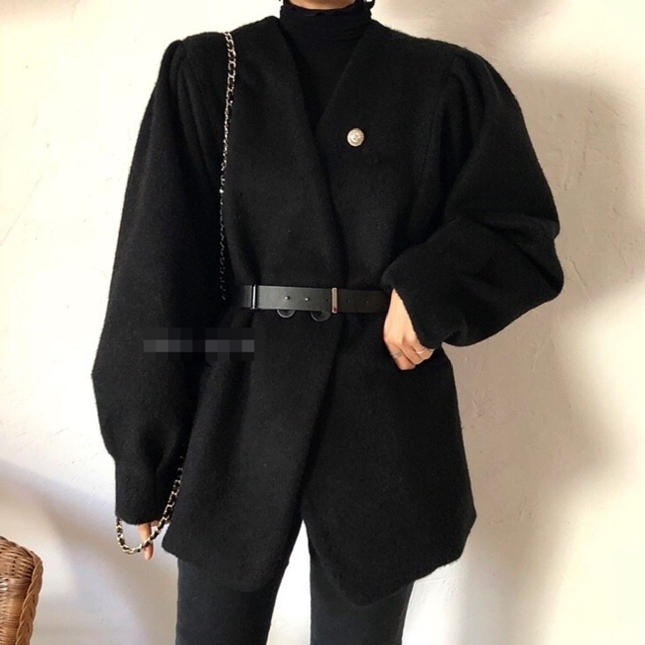 全2色 アウター コート ノーカラージャケット ベルト 無地 カシュクール ボリューム袖 袖コンシャス 上品 きれいめ 大人 カジュアル 大人 秋 冬 春