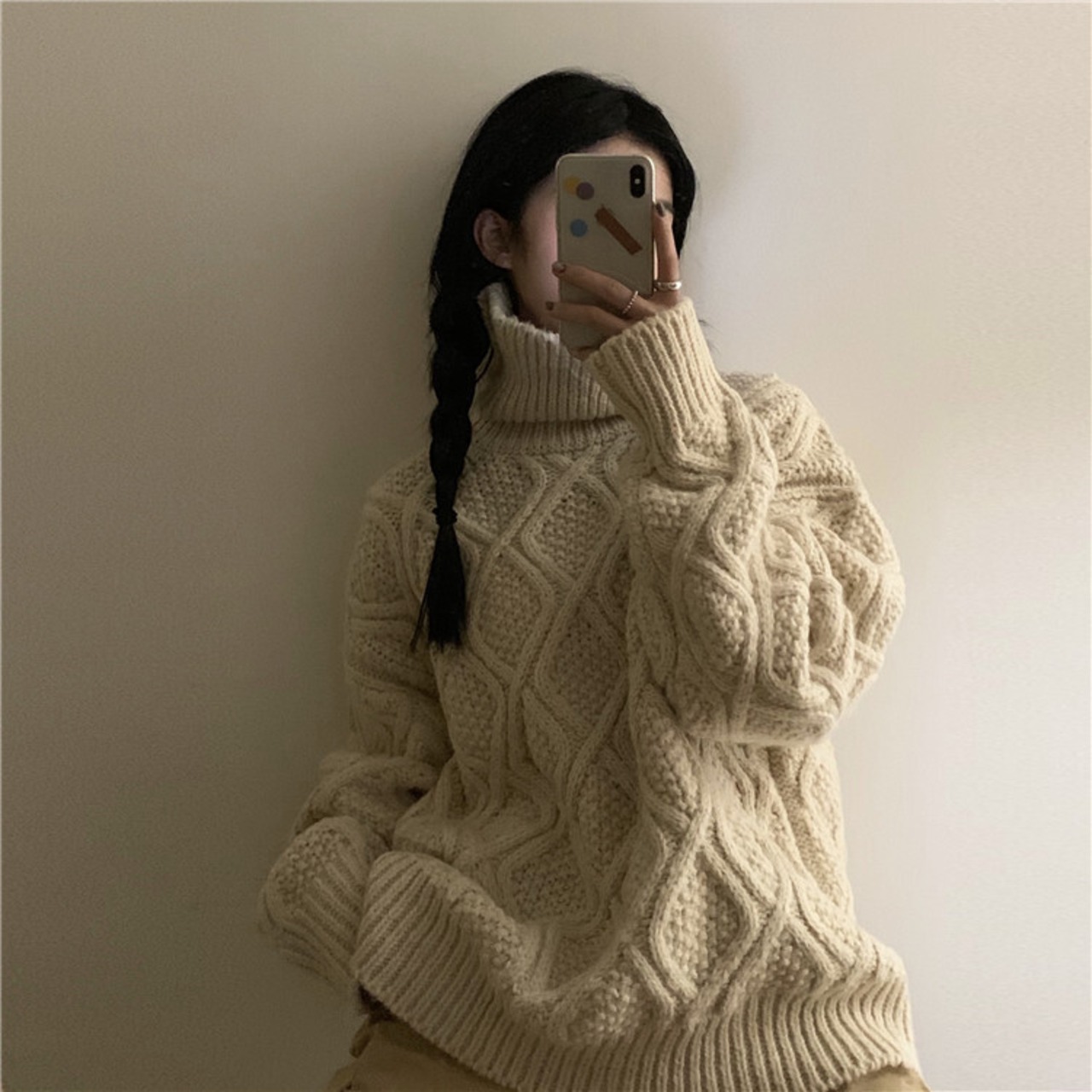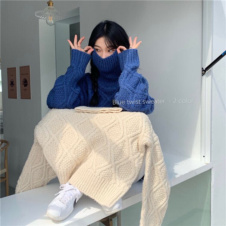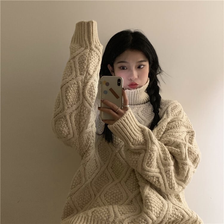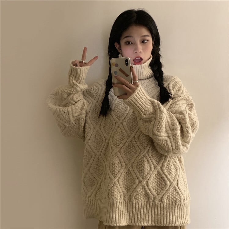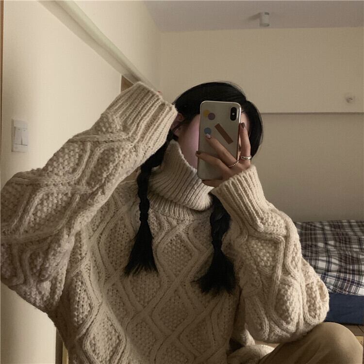 ケーブル編みのタートルネックニットです。