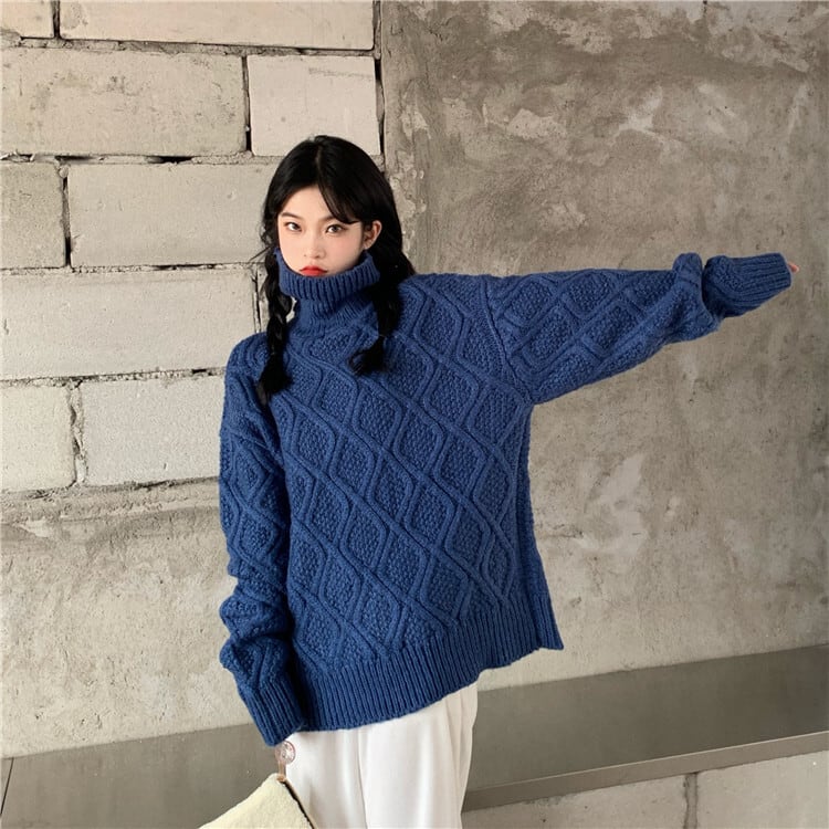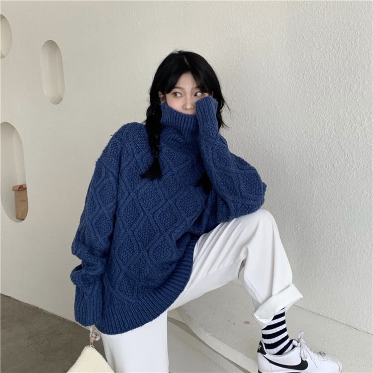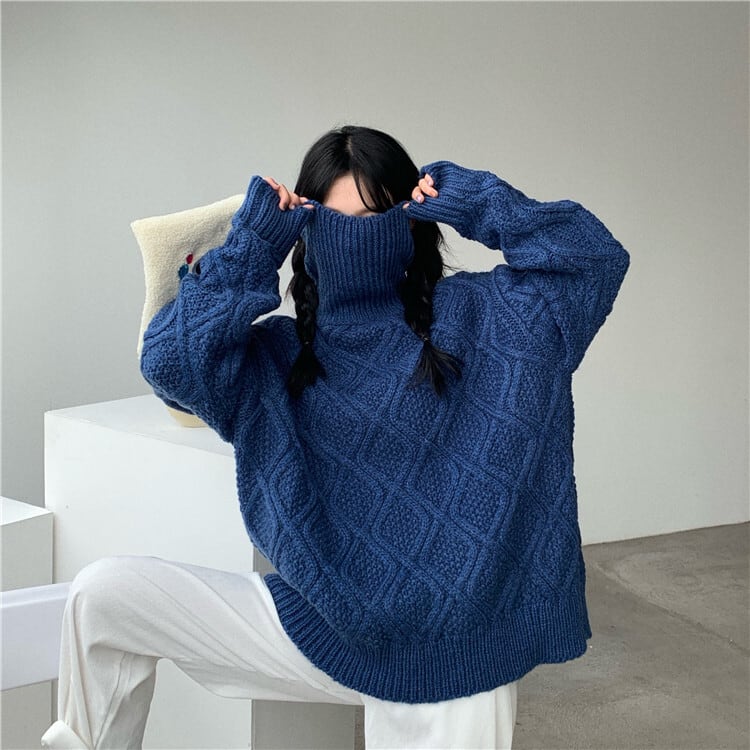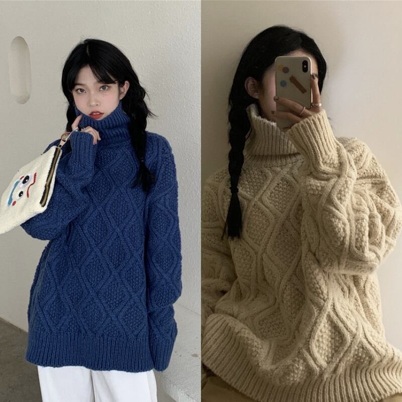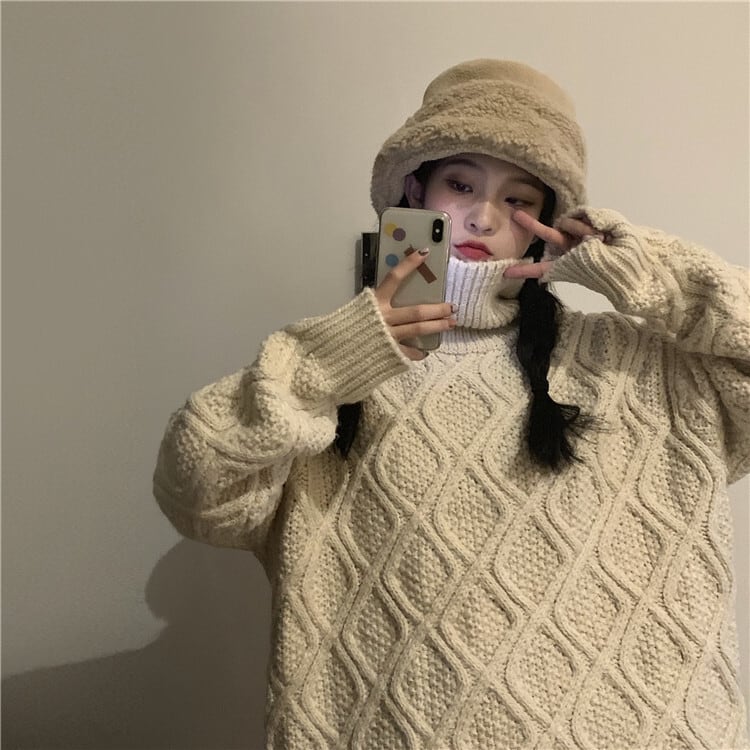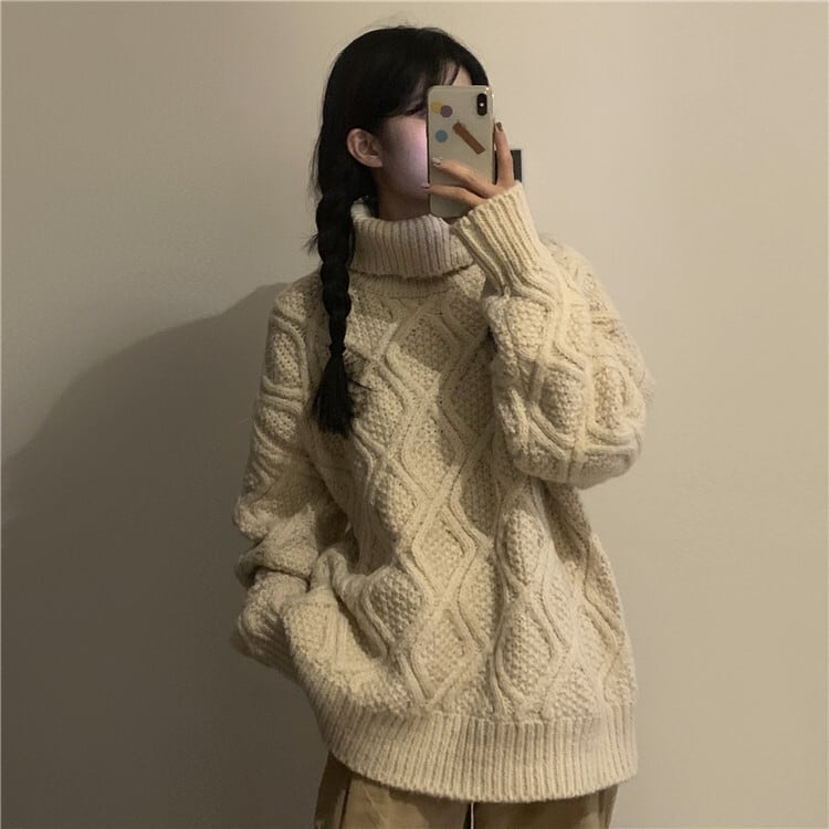 全2色 ニット ケーブル編み タートルネック 長袖 セーター ゆったり 体型カバー 秋冬 こなれ感 お出かけ カジュアル 大人可愛い ざっくり
