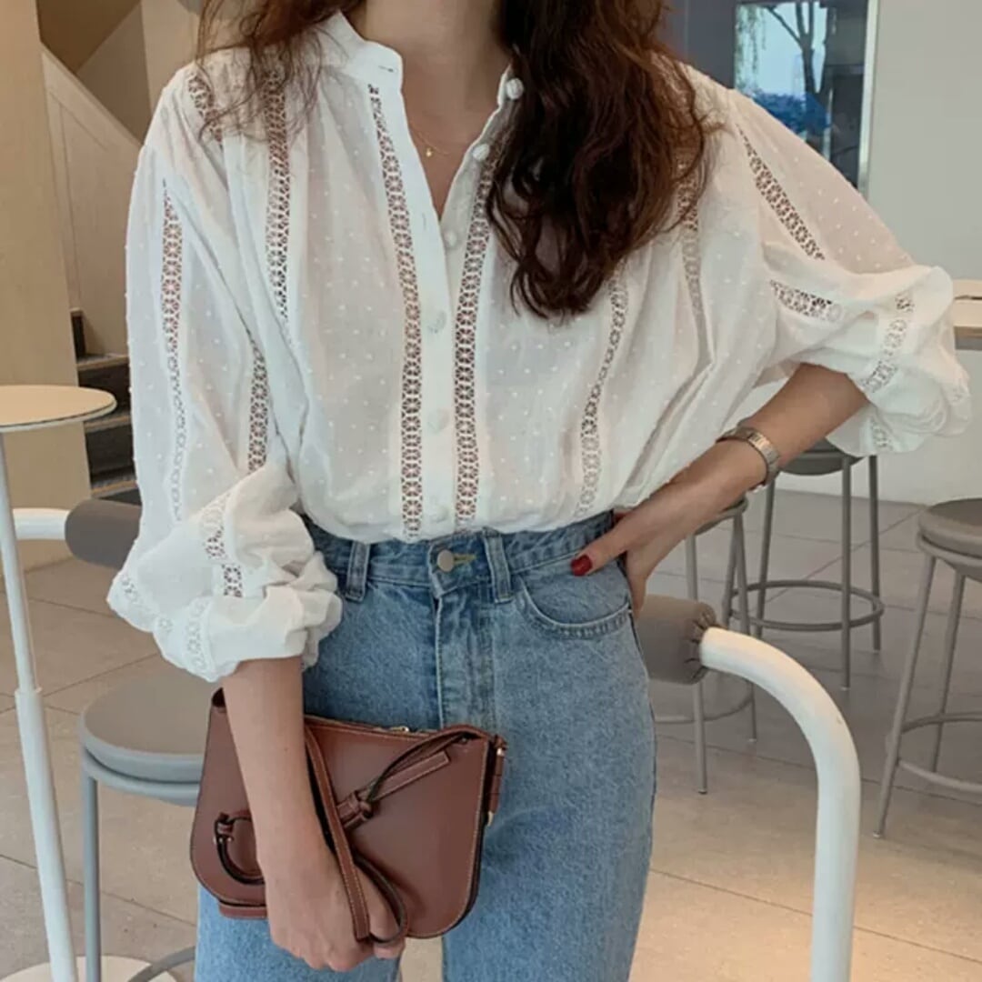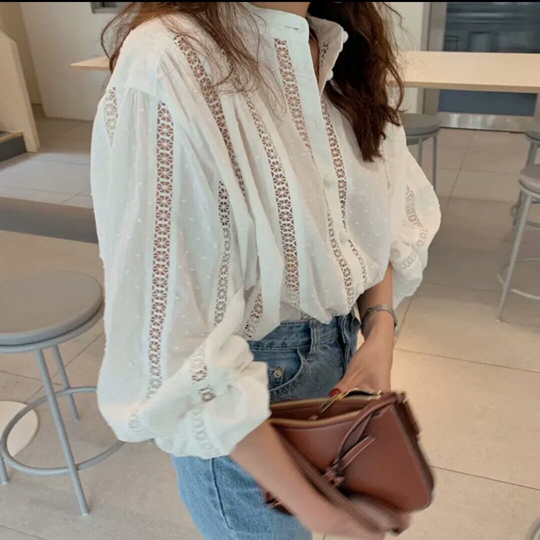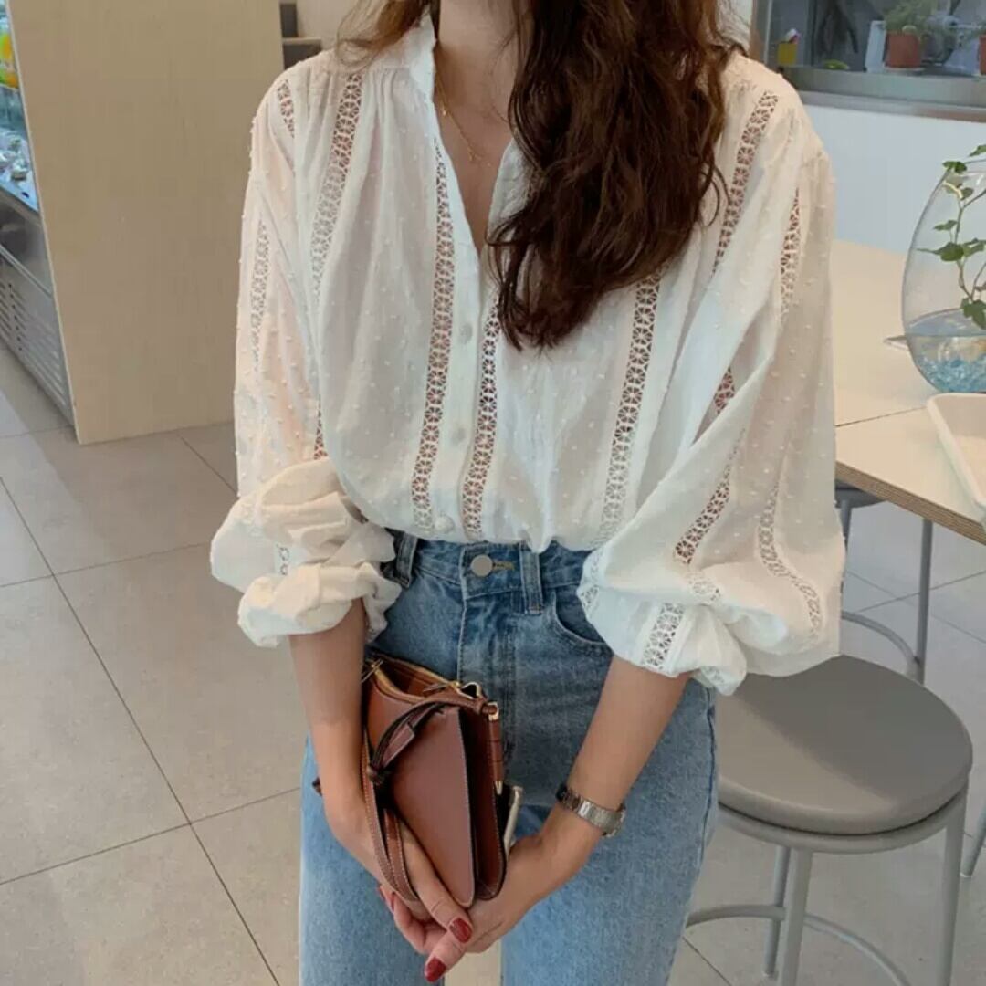 ラウンドネック ボリューム スリーブ ブラウス シャツ トップス 大人 カジュアル シンプル キレイめ お出かけ お買い物 デート 女子会 秋冬 春 通学 学生 通勤 韓国ファッション