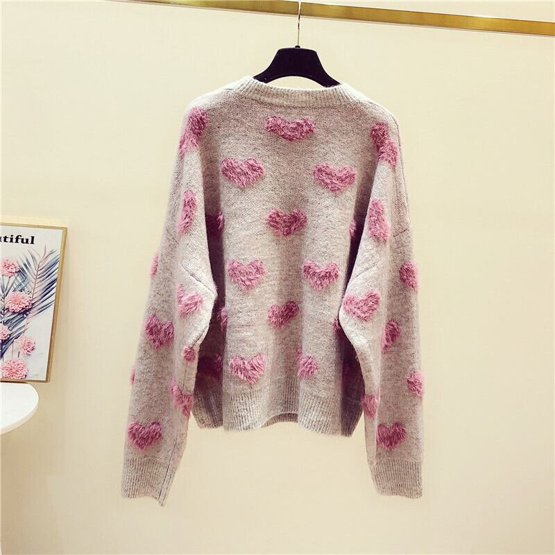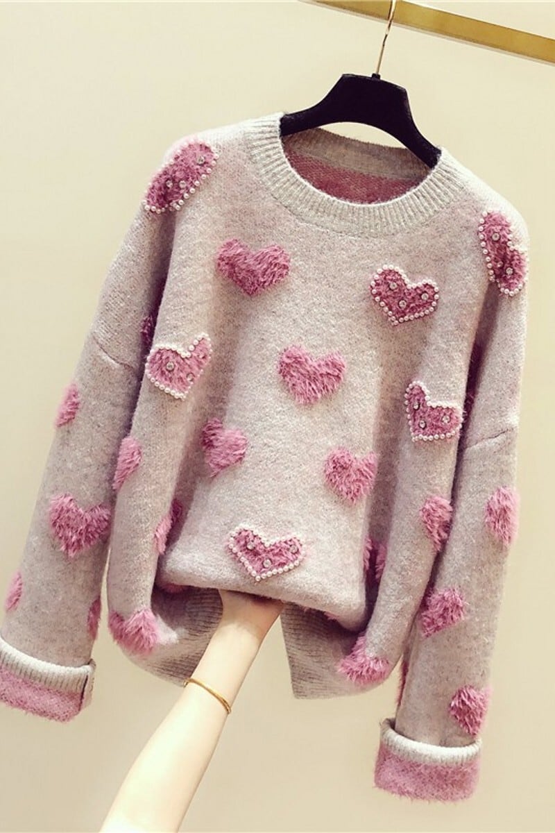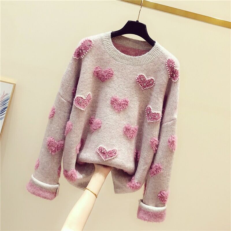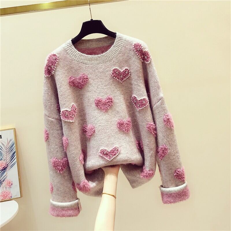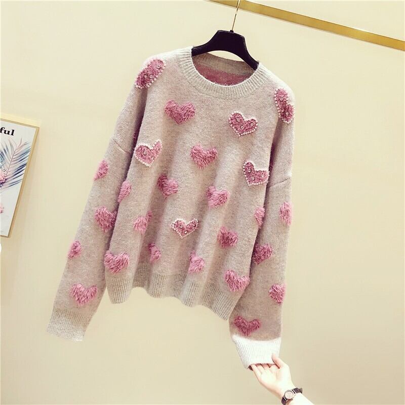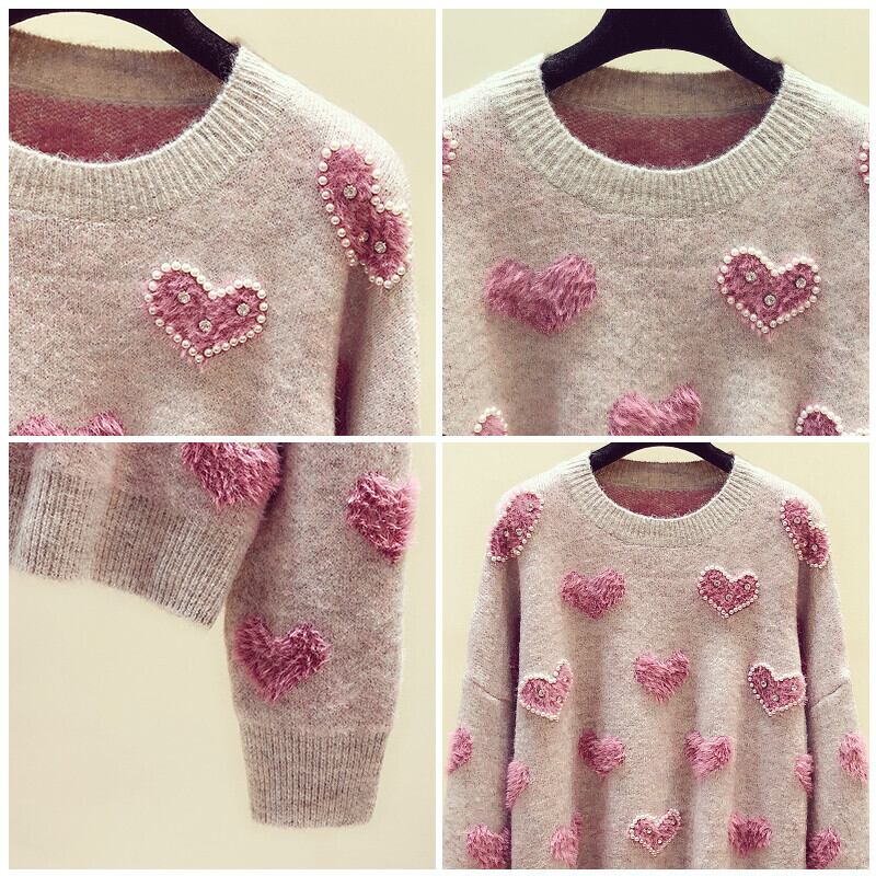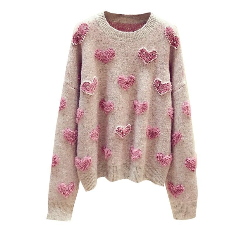 トップス セーター ニット ハート柄 ガーリー 可愛い ゆったり ビーズ ラウンドネック あったか カジュアル 秋 春 冬