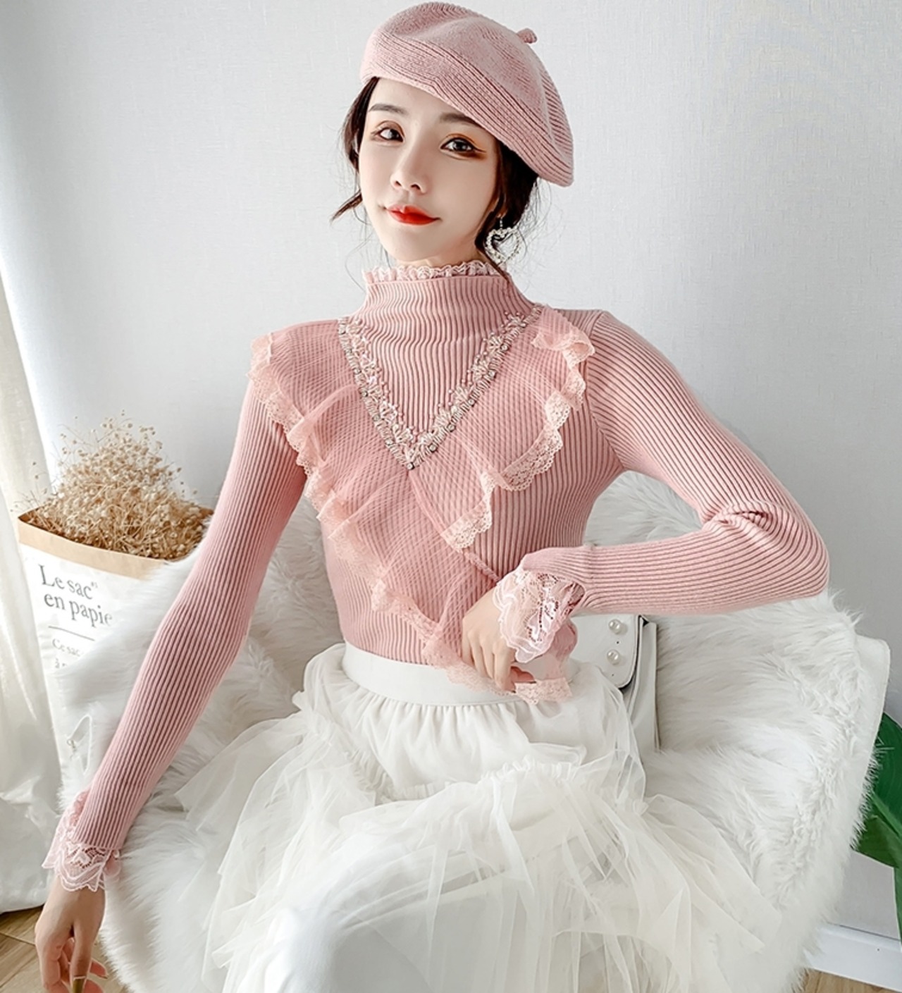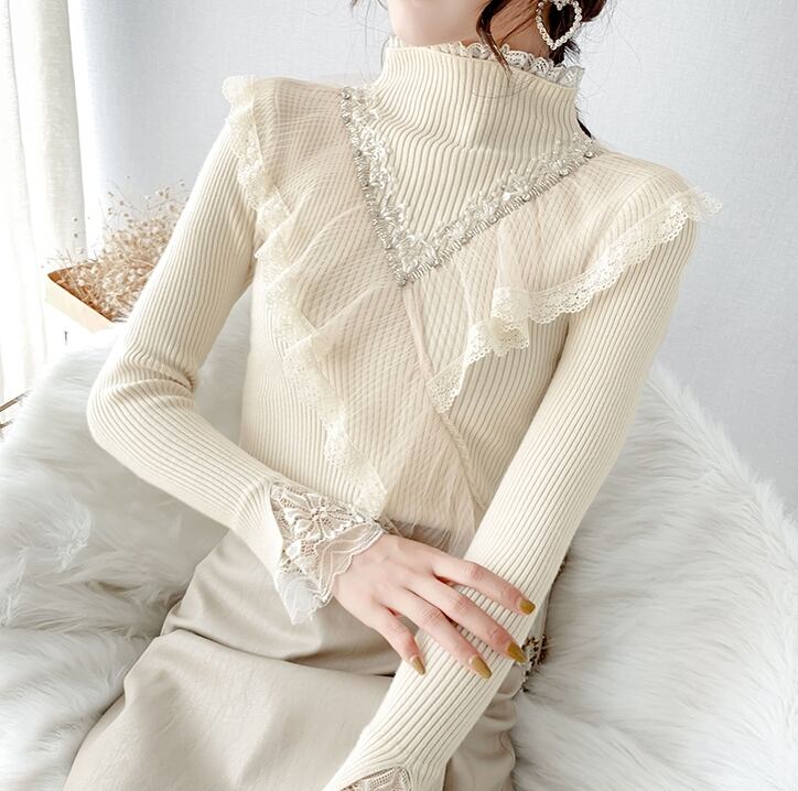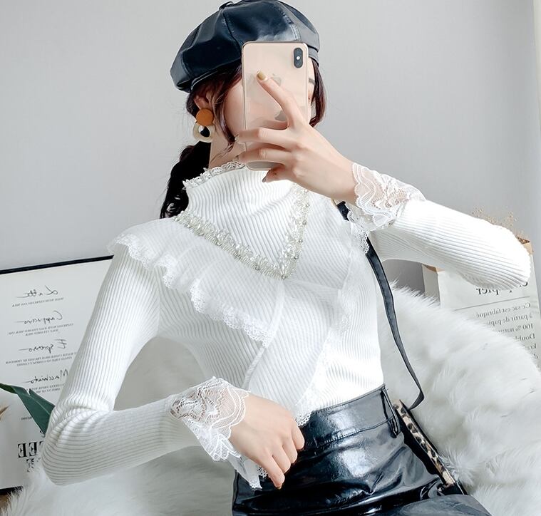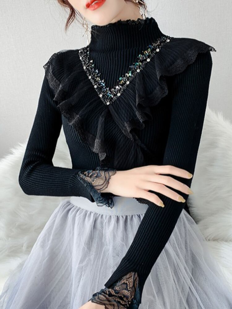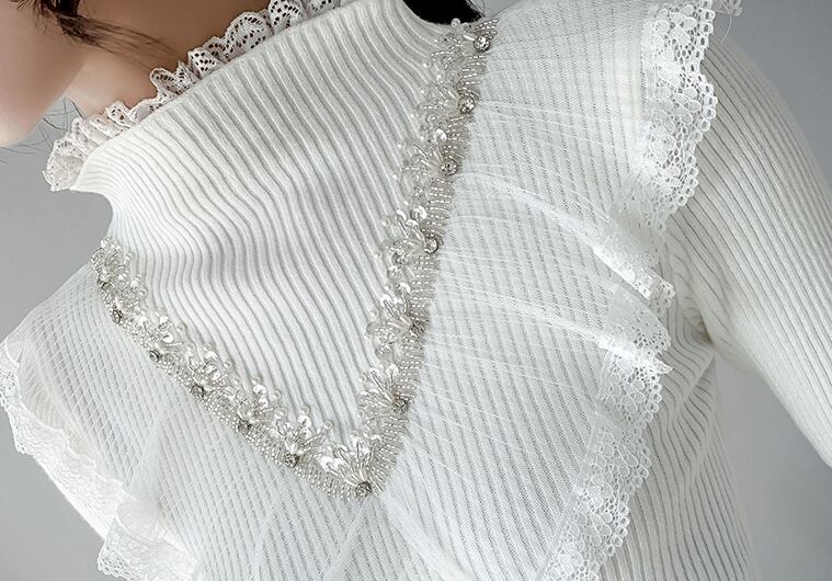 全4色 トップス セーター リブニット ハイネック プルオーバー スパンコール ビーズ レース フリル ガーリー 大人可愛い きれいめ 可愛い スリムカジュアル 秋 冬 春