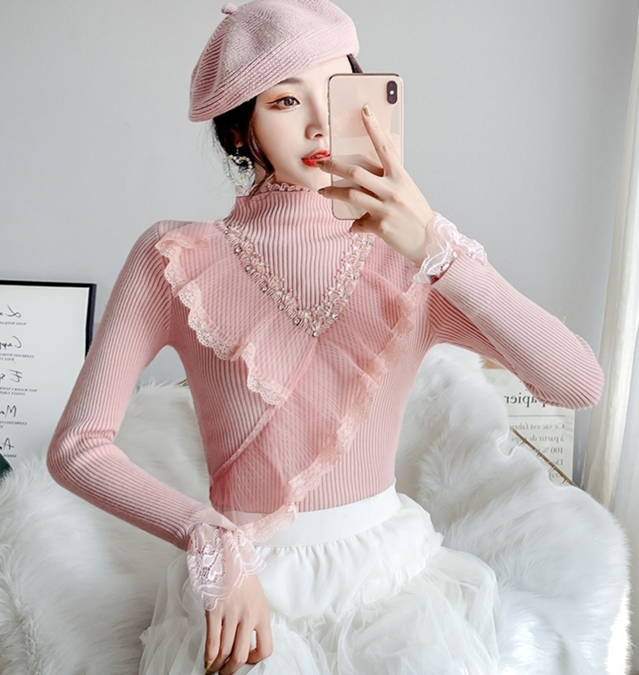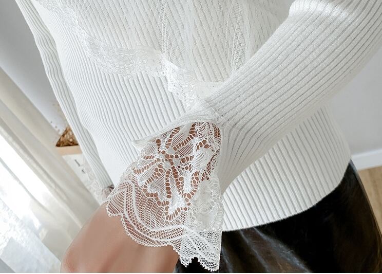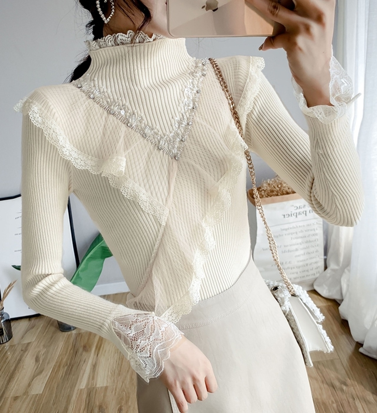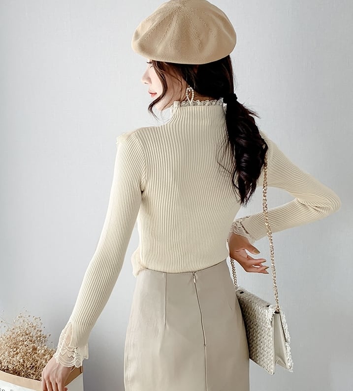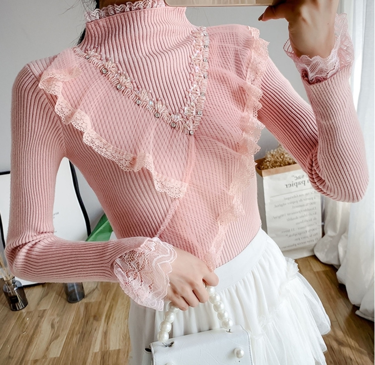 全4色 トップス セーター リブニット ハイネック プルオーバー スパンコール ビーズ レース フリル ガーリー 大人可愛い きれいめ 可愛い スリムカジュアル 秋 冬 春