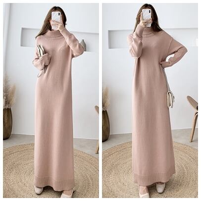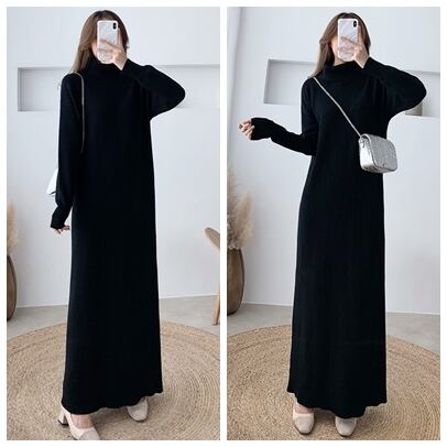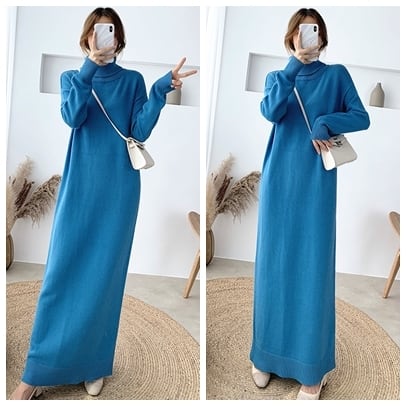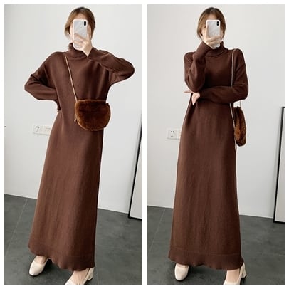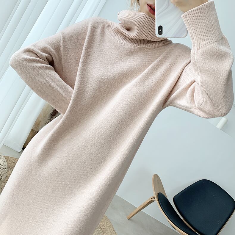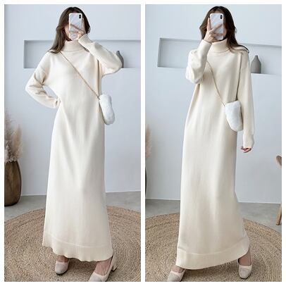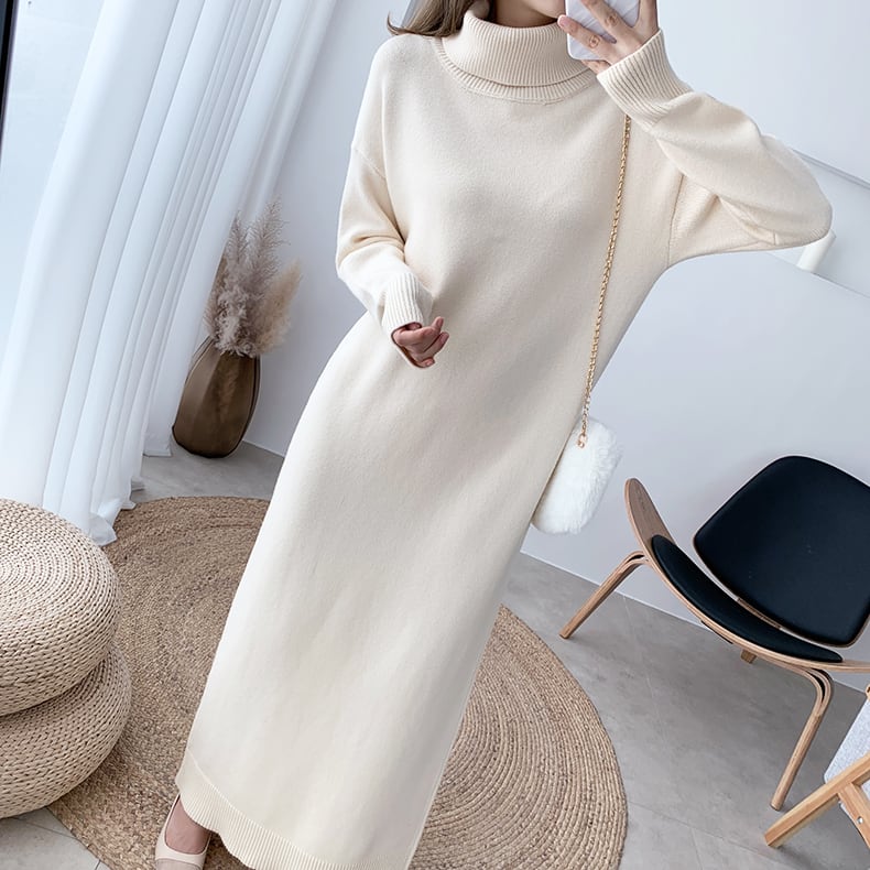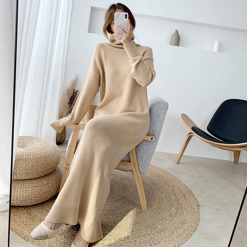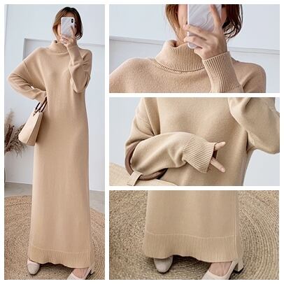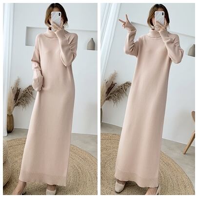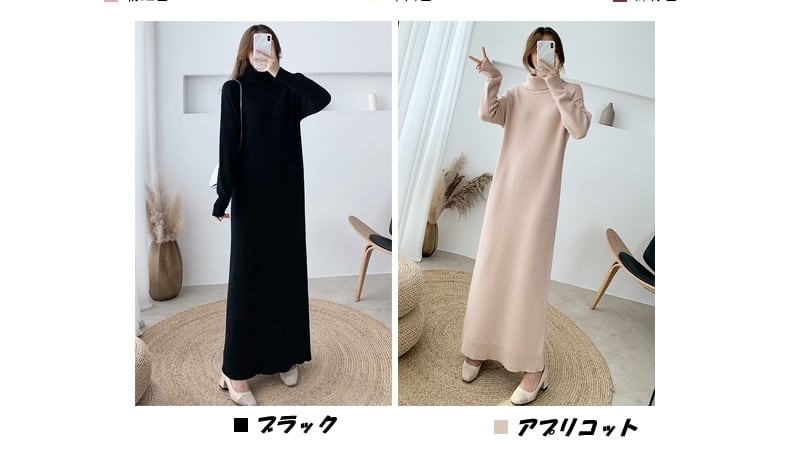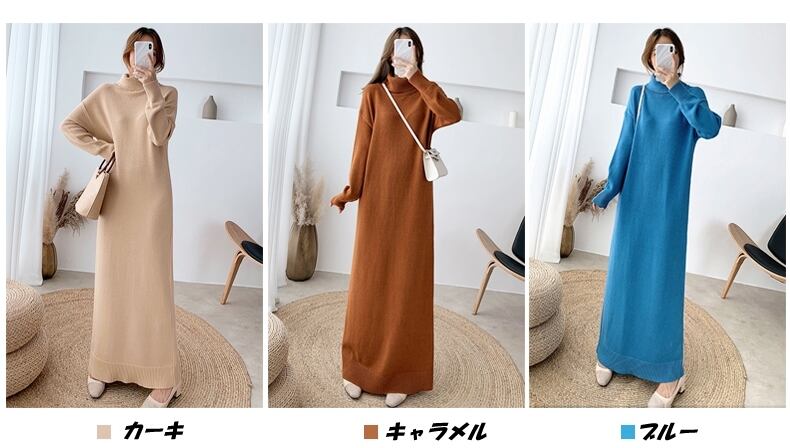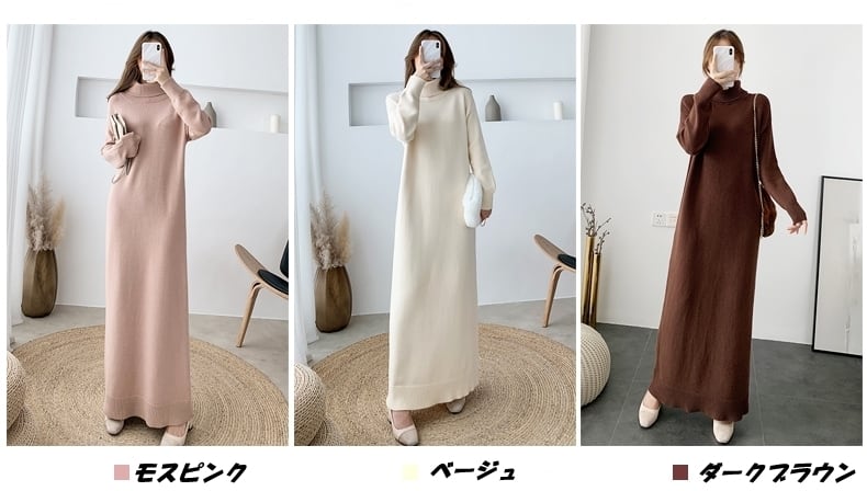 全8色 超ロング丈 ニット ワンピース タートル ハイネック 長袖 リブ セーター Iライン 脚長効果 高身長 ブラック カーキ ベージュ アプリコット ダークブラウン キャメル モカピンク 秋冬 レディース アパレル