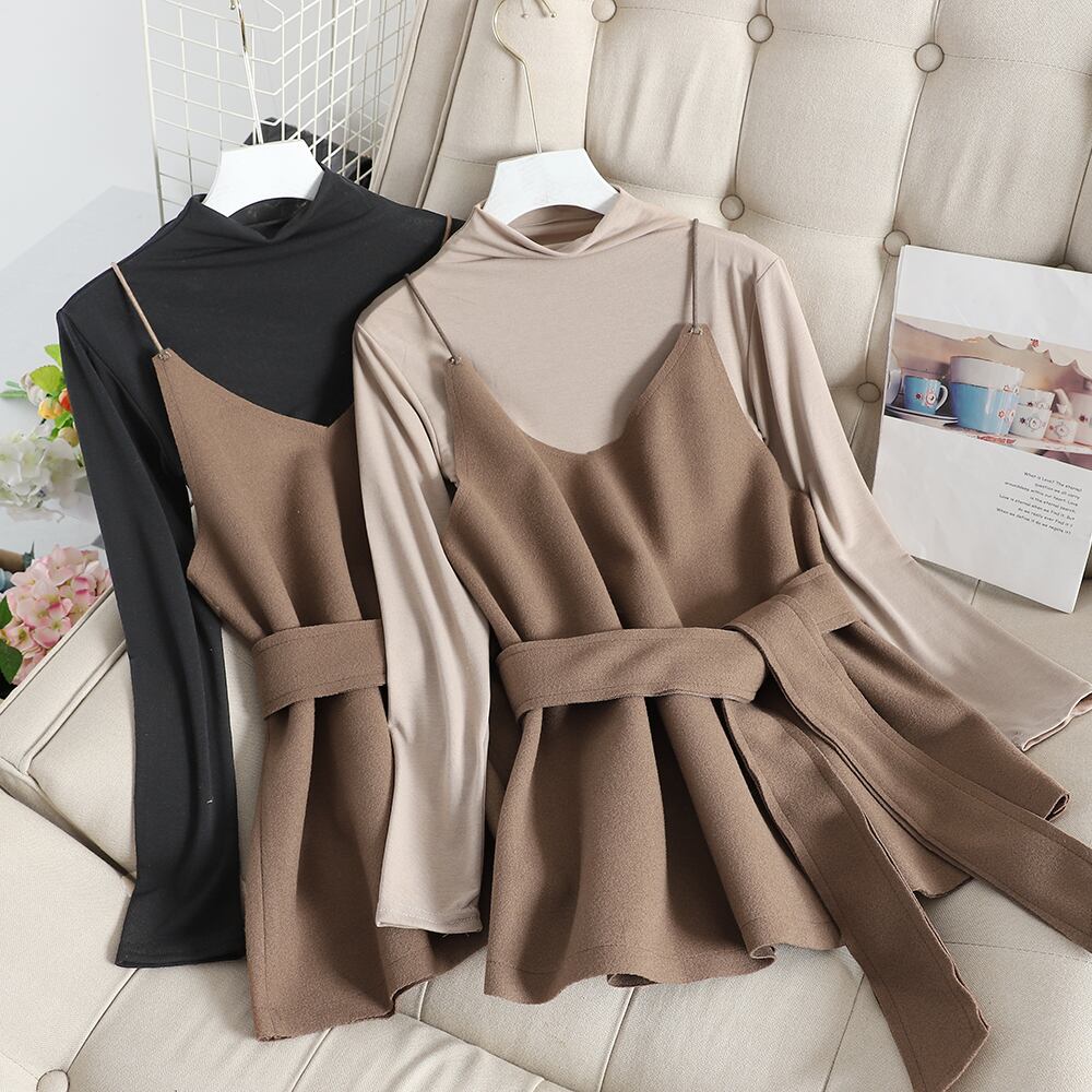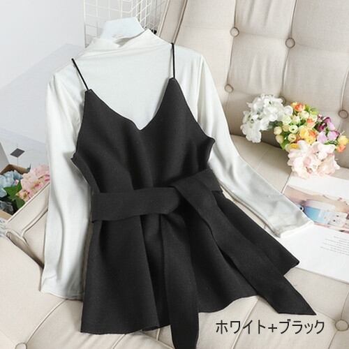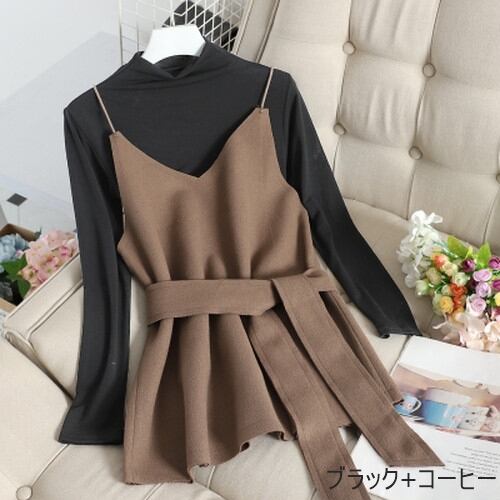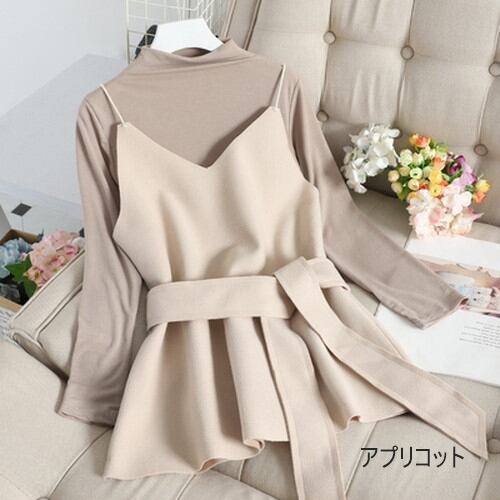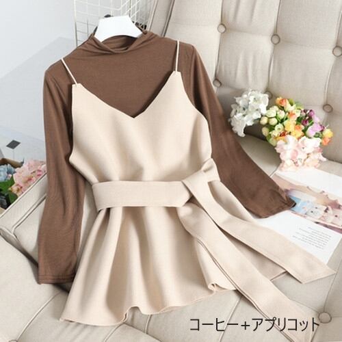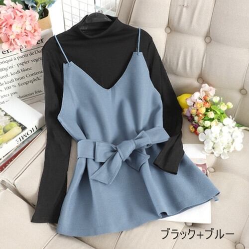 全6色 ツーピース 2点セットトップス カットソー キャミソール プルオーバー レイヤード フリル 長袖 バイカラー ガーリー 可愛い きれいめ リボン カジュアル 大人 秋 冬 春
