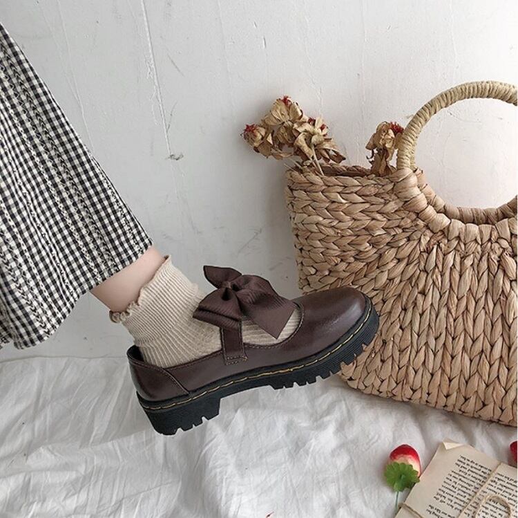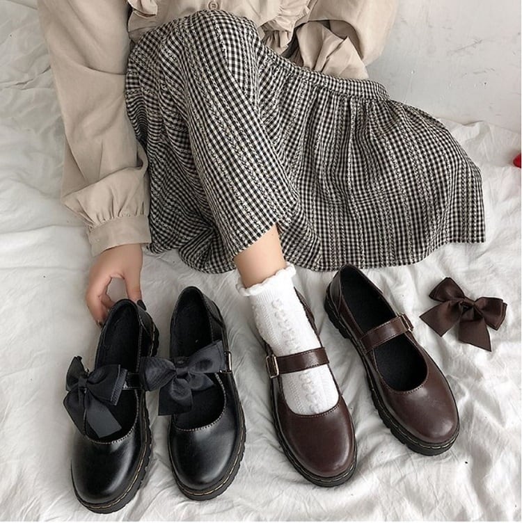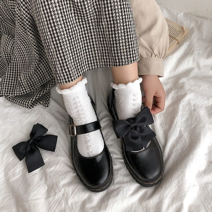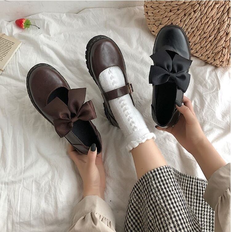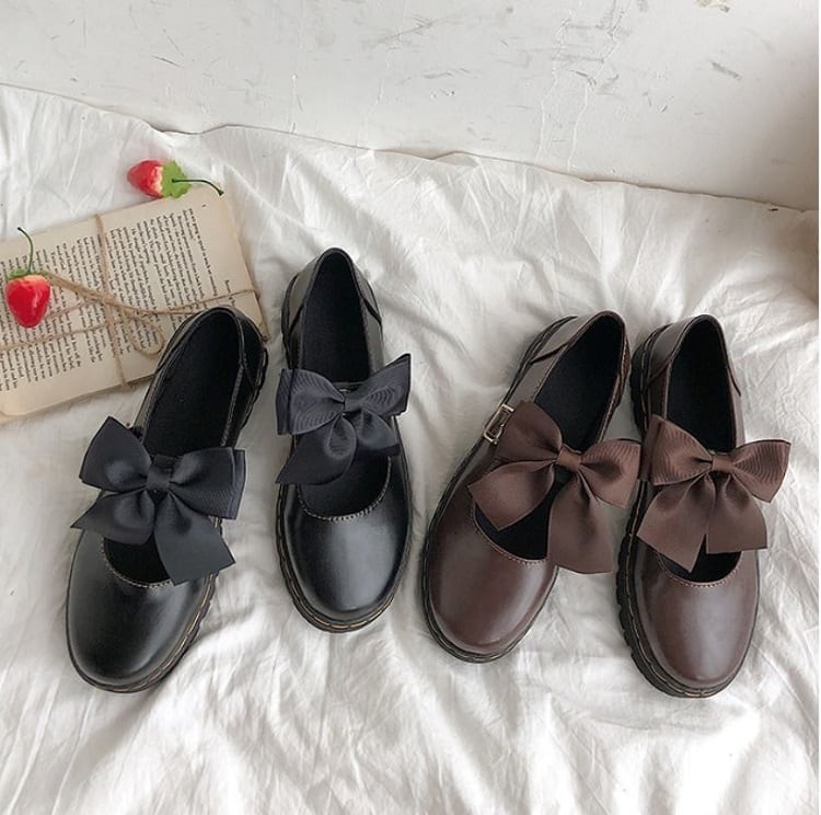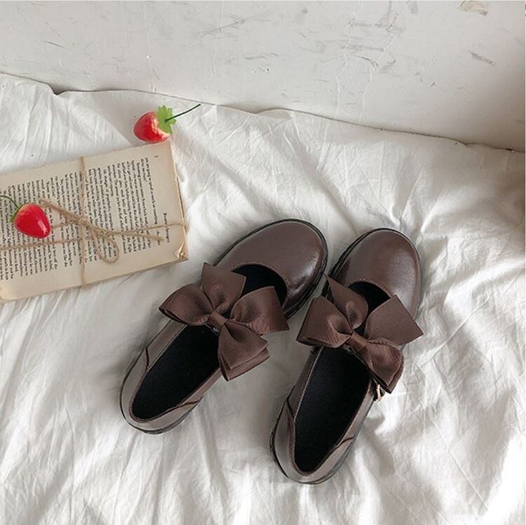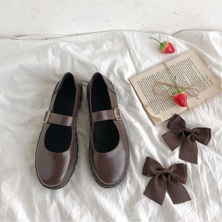 全2色 フラットシューズ ラウンドトゥ ストラップ リボン 2WAY PU レザー 可愛い ガーリー ロリータ ブラック ブラウン