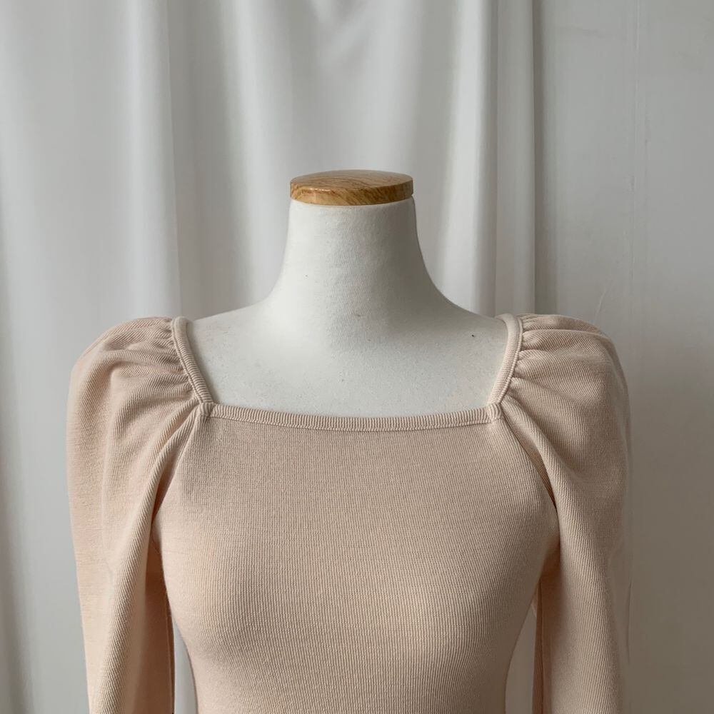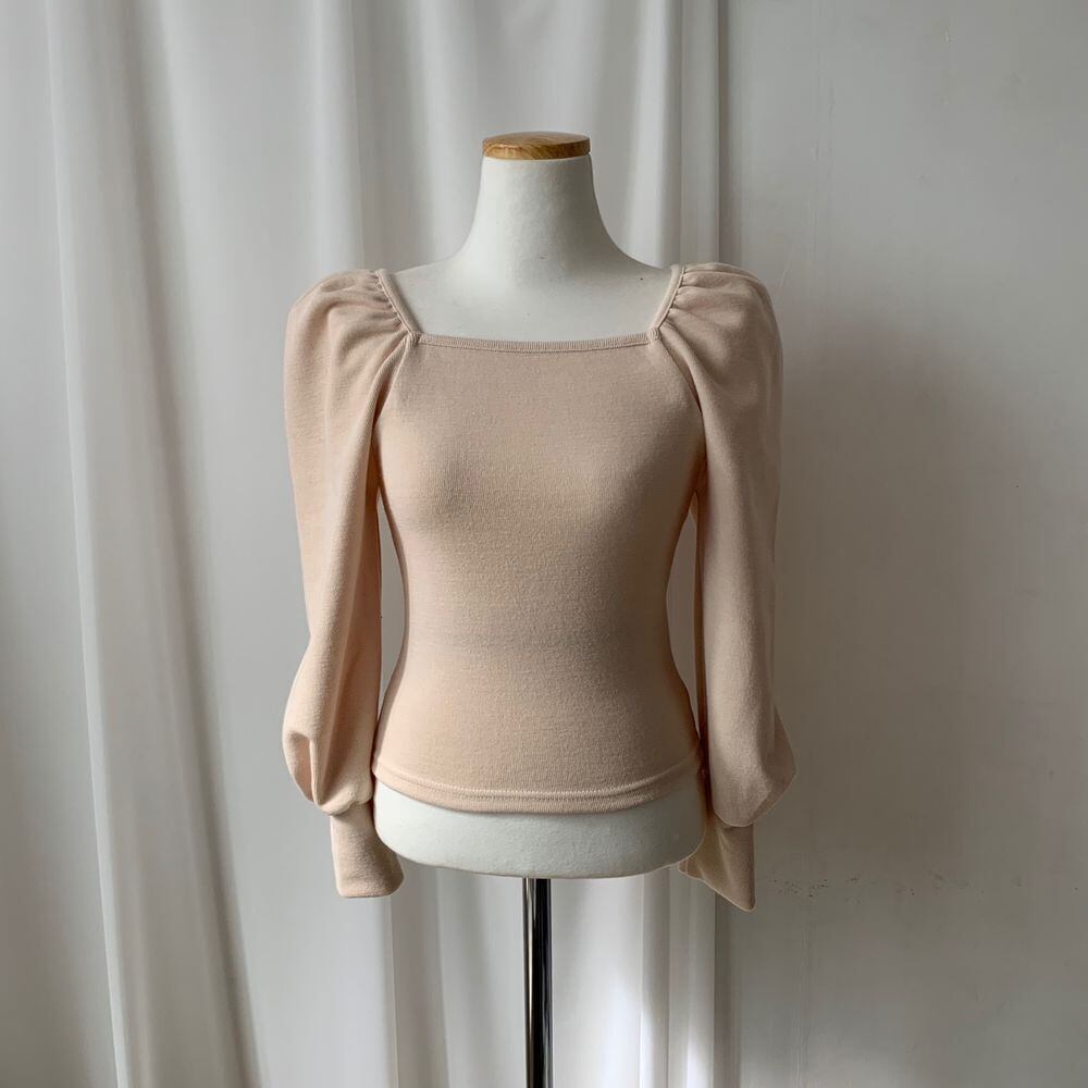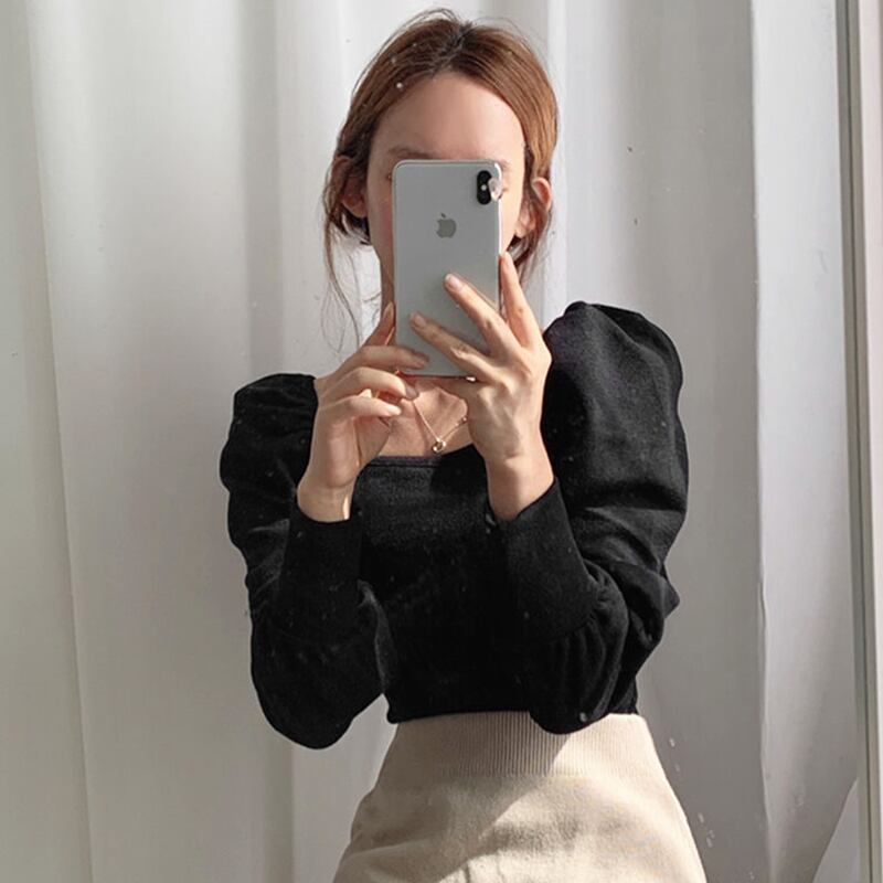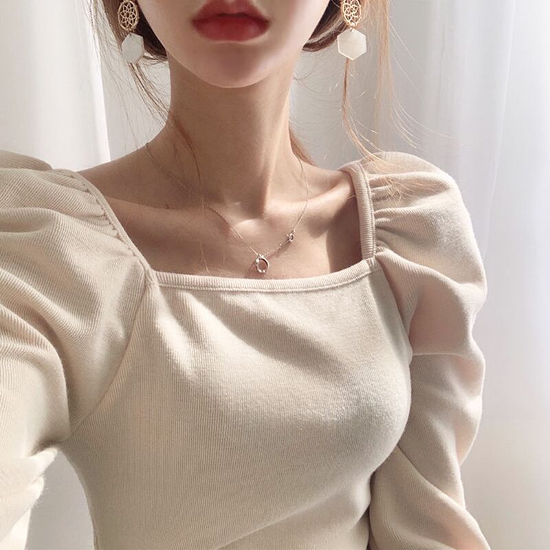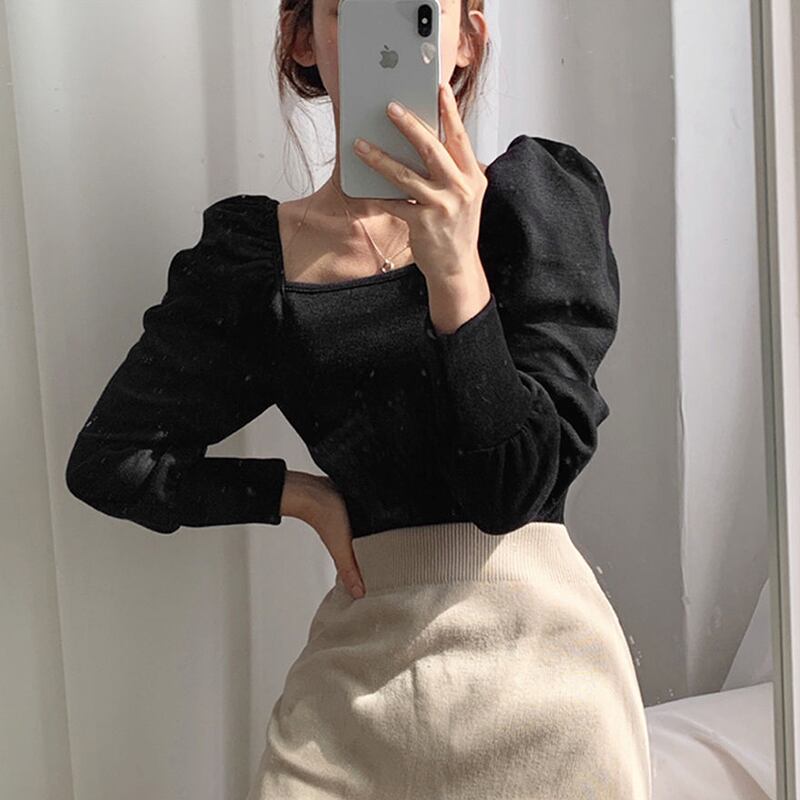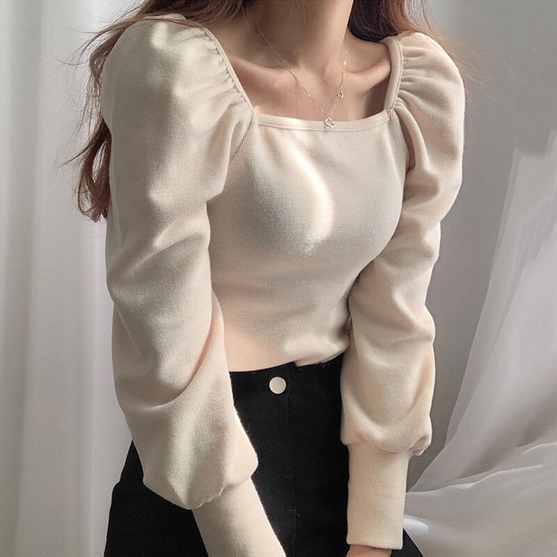 全2色 トップス カットソー プルオーバー スクエアネック 長袖 スリム ランタンスリーブ パフスリーブ カジュアル ショート 大人可愛い 秋 春 冬