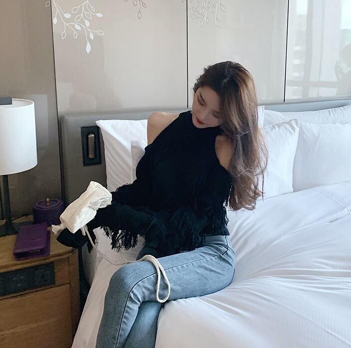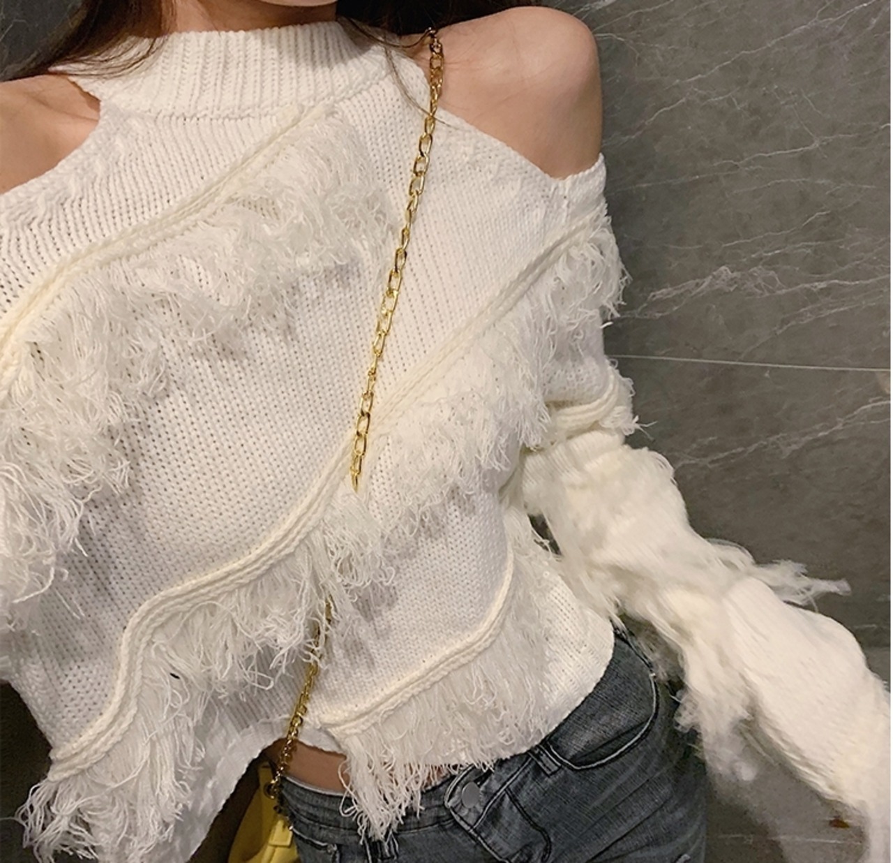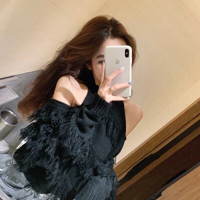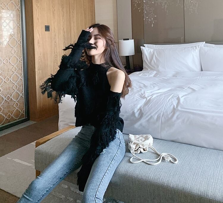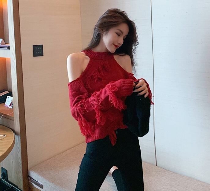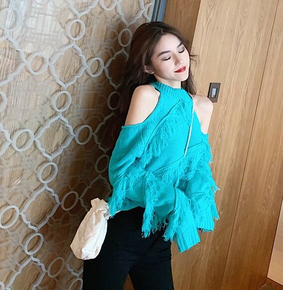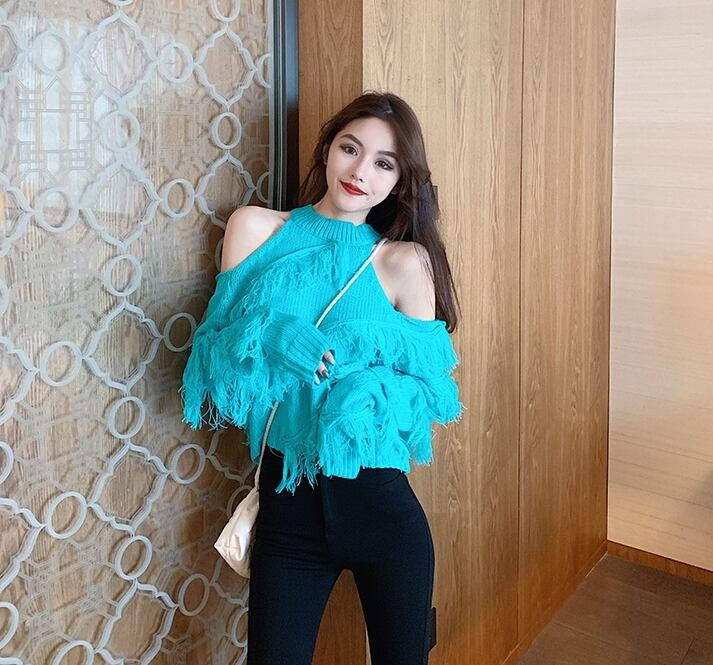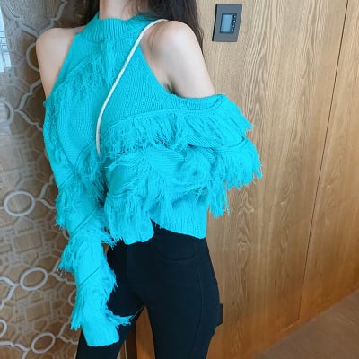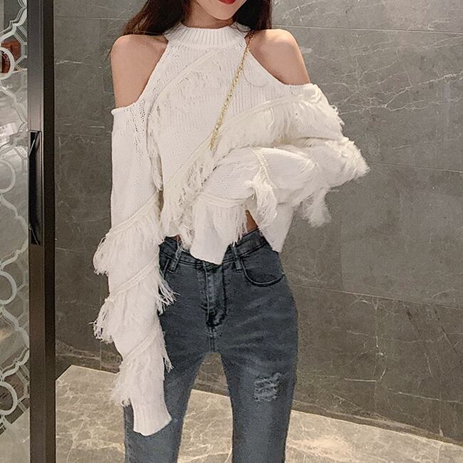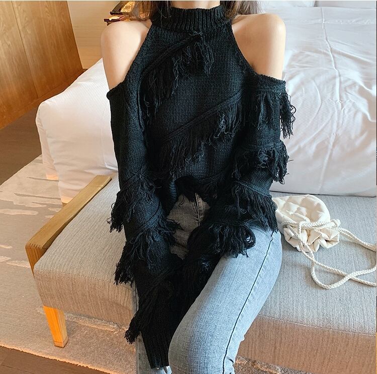 全5色 トップス ニット セーター プルオーバー 肩見せ フリンジ ロングスリーブ ハイネック セクシー デート 個性的 カジュアル ガーリー 秋 冬 春