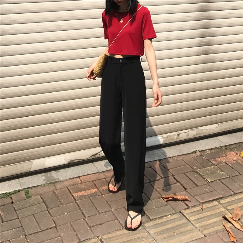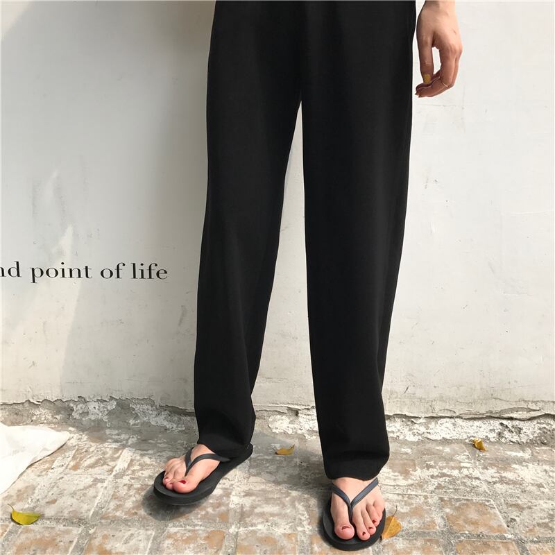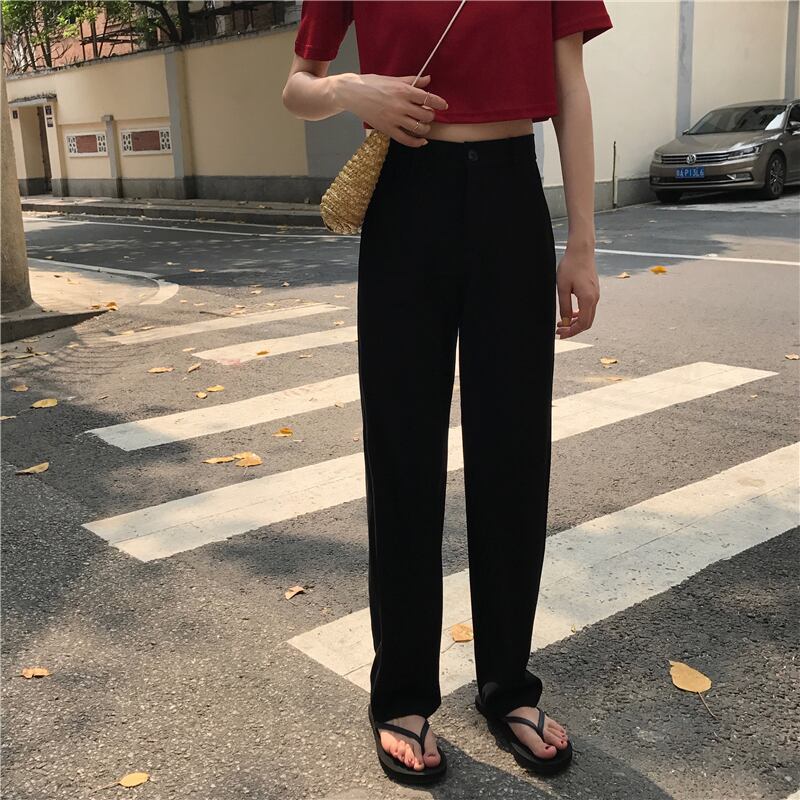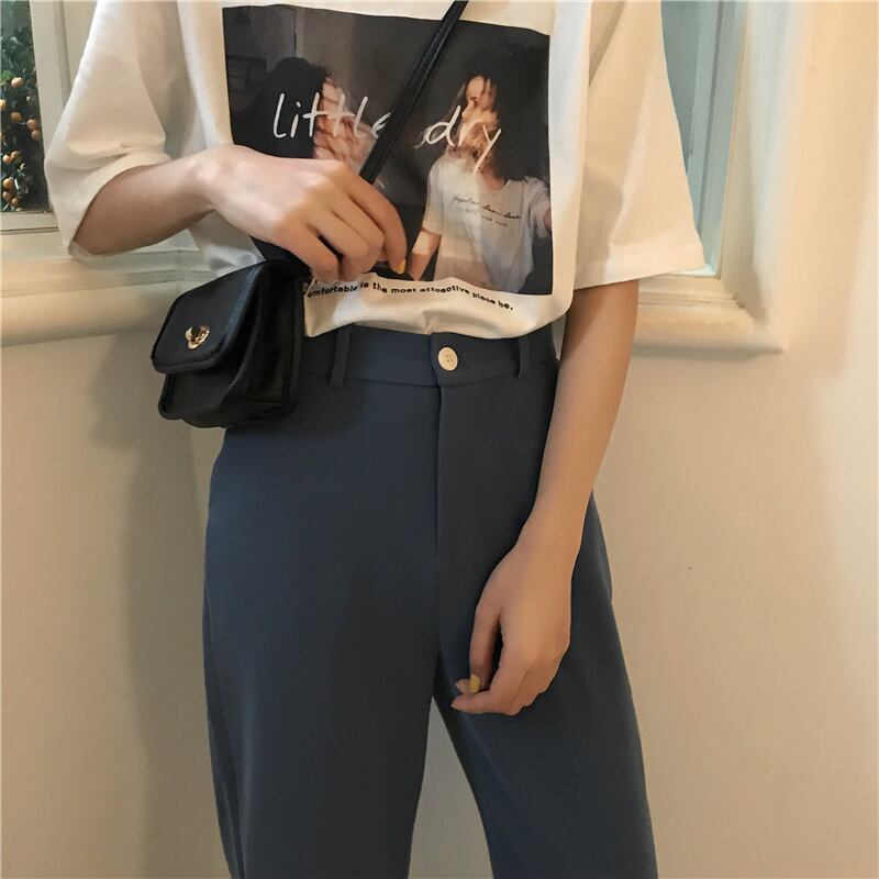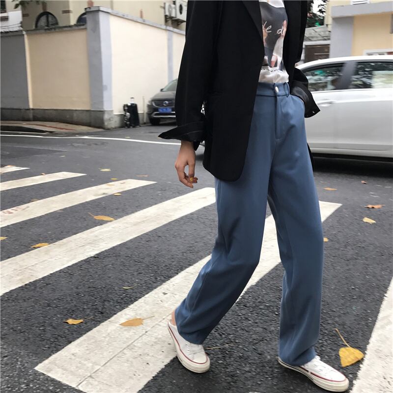 全2色 ストレートパンツ ハイウエスト ロング丈 スラックス 定番 ベーシック 無地 シンプル カジュアル お出かけ レジャー ブラック ブルー