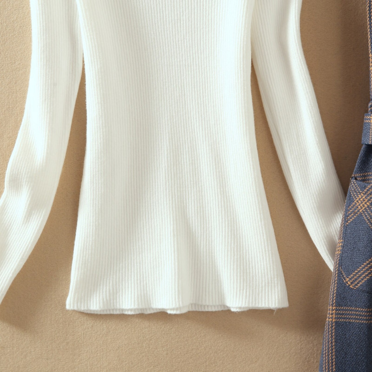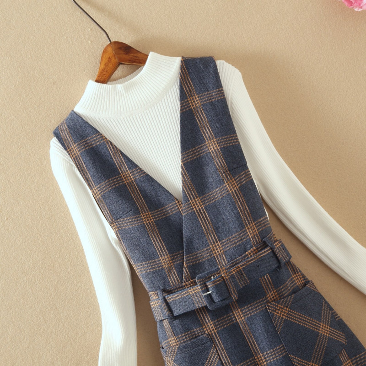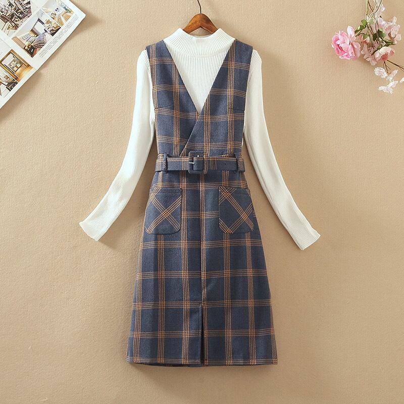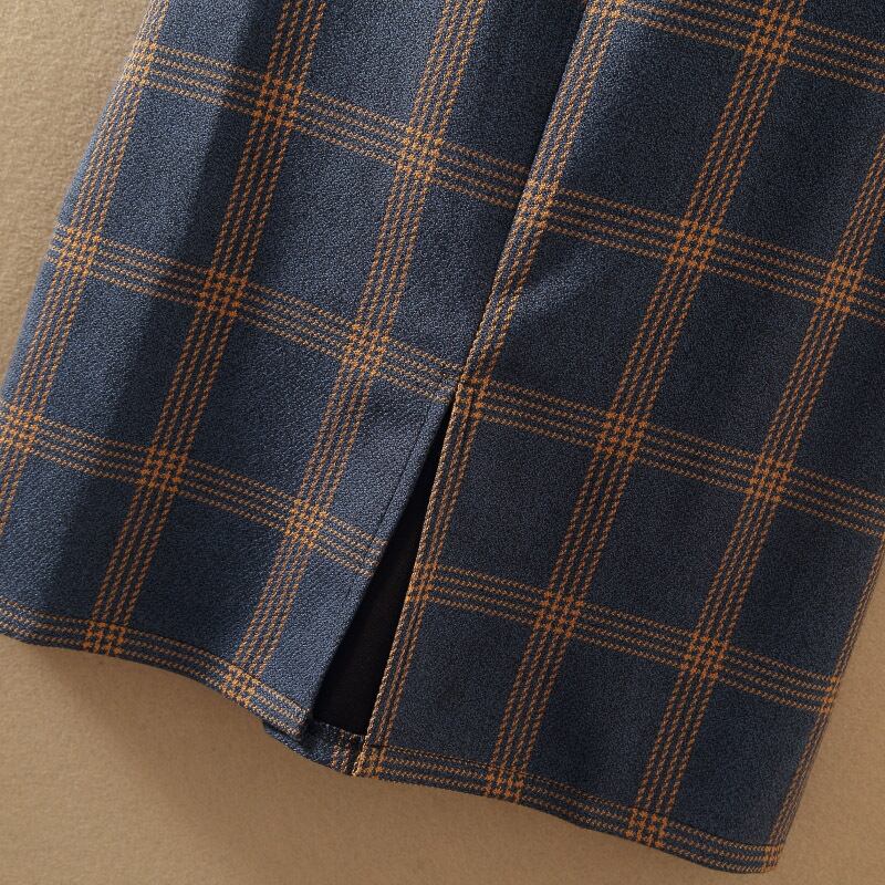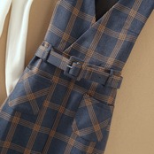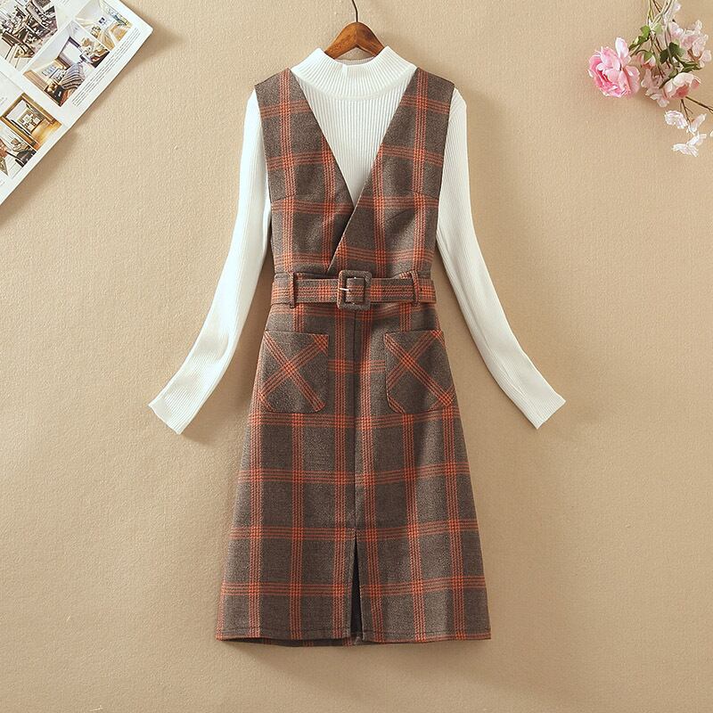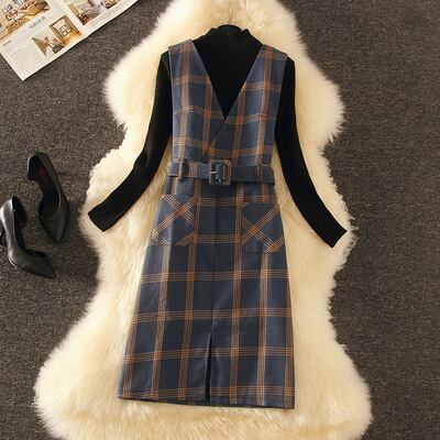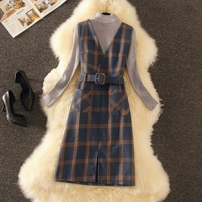 全4色 セットアップ ツーピース セーター ワンピース ベルト Vネック スリット ハイネック スリム カジュアル チェック柄 デート 秋 春 冬