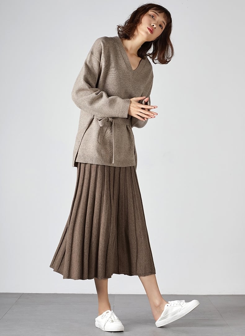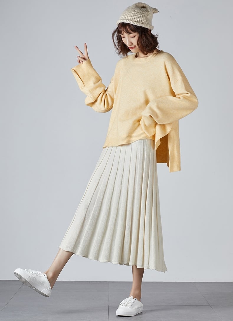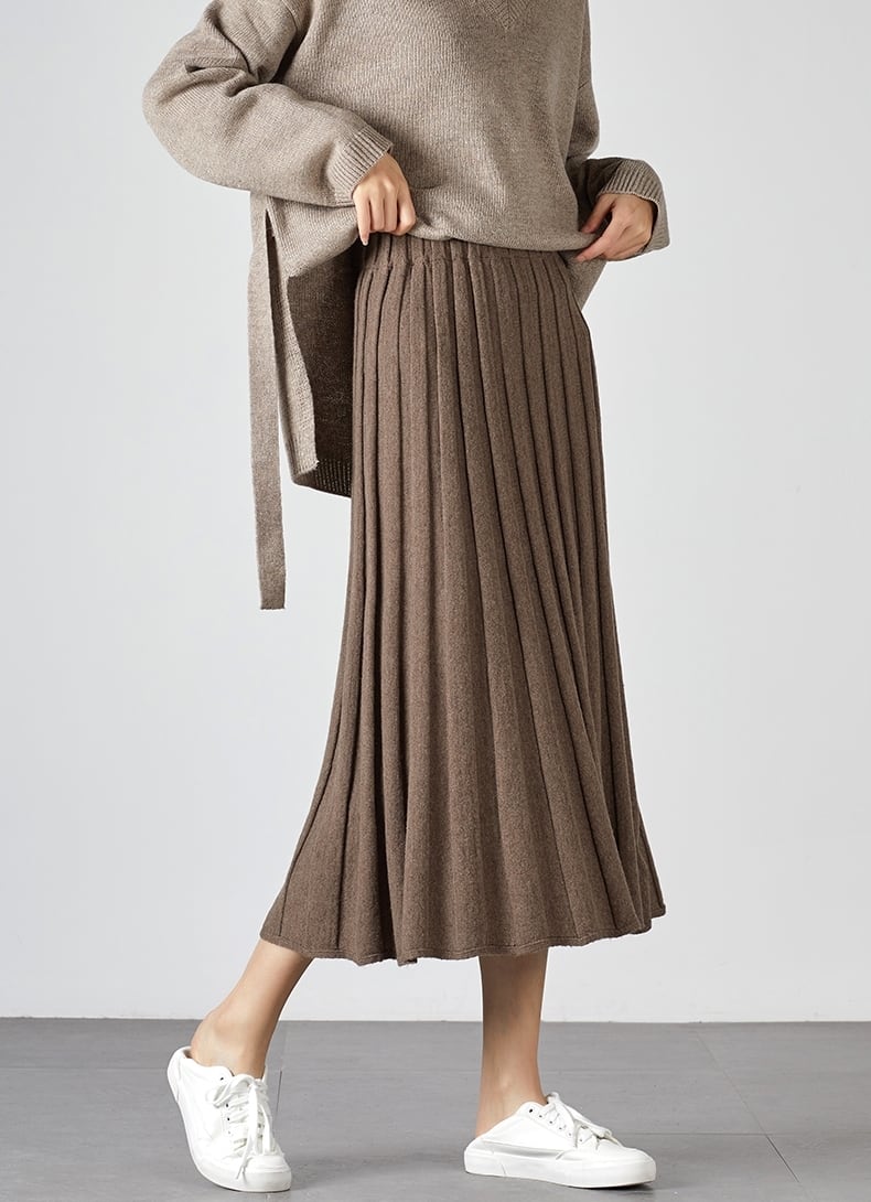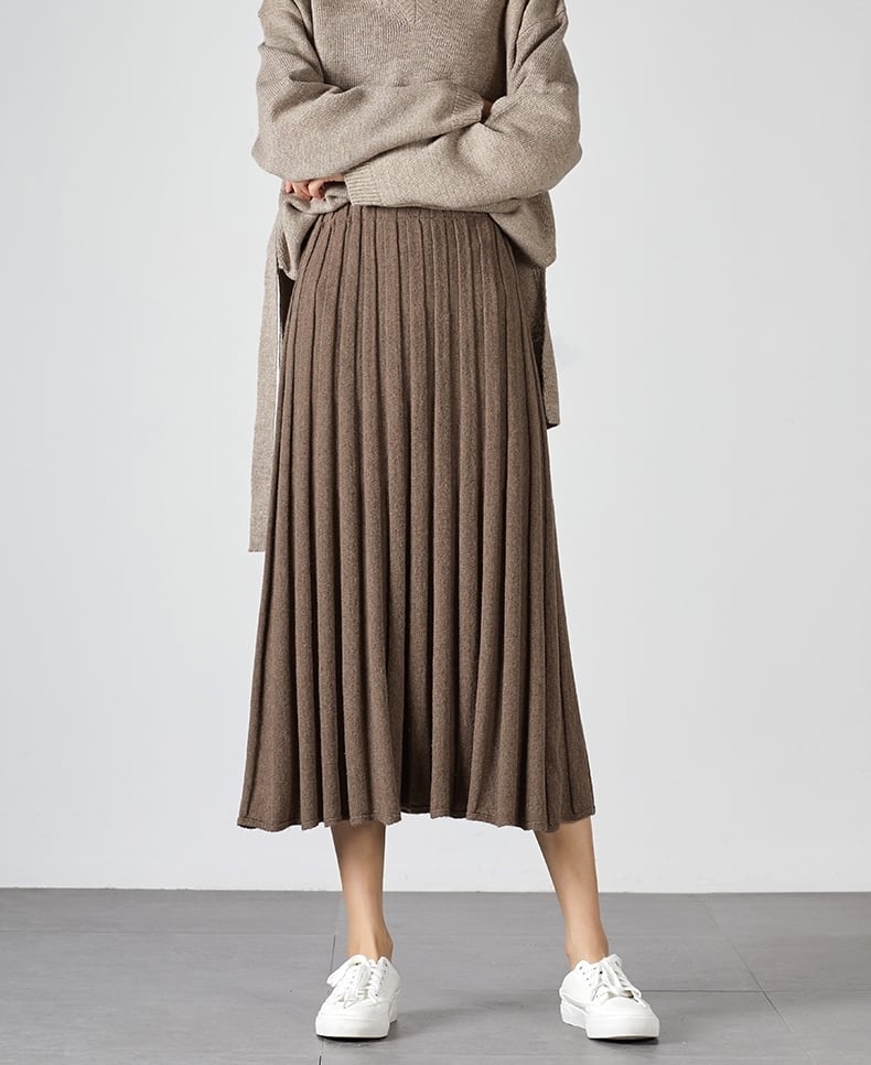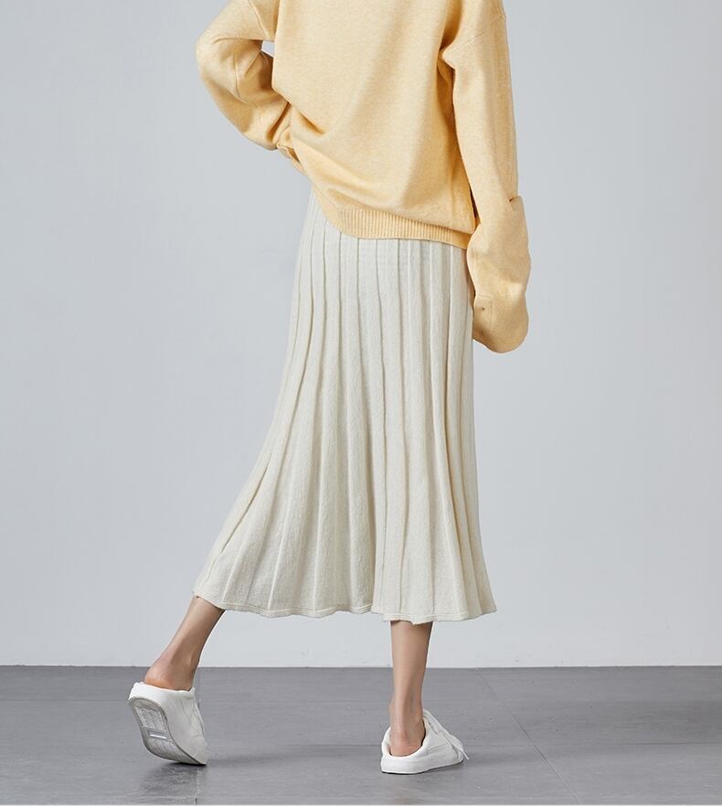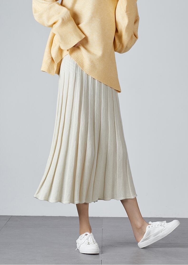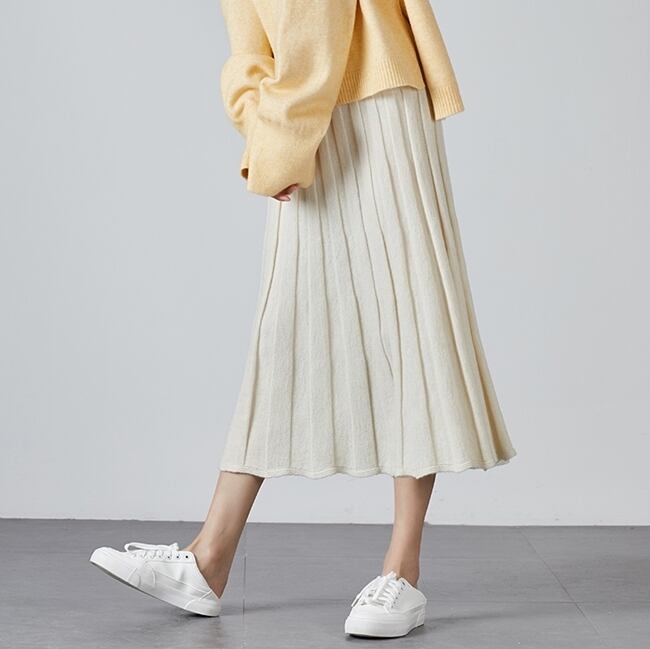 全2色 ボトムス スカート ニットスカート ミモレ丈 プリーツ フレア ゆったり ハイウエスト ウエストゴム Aライン 大人可愛い デート デイリー カジュアル 秋 冬 春