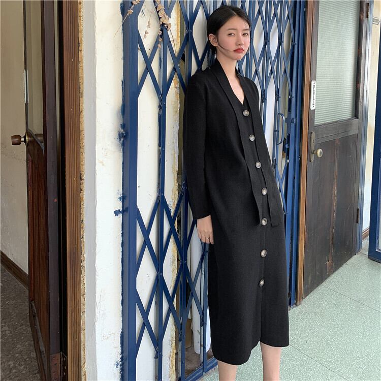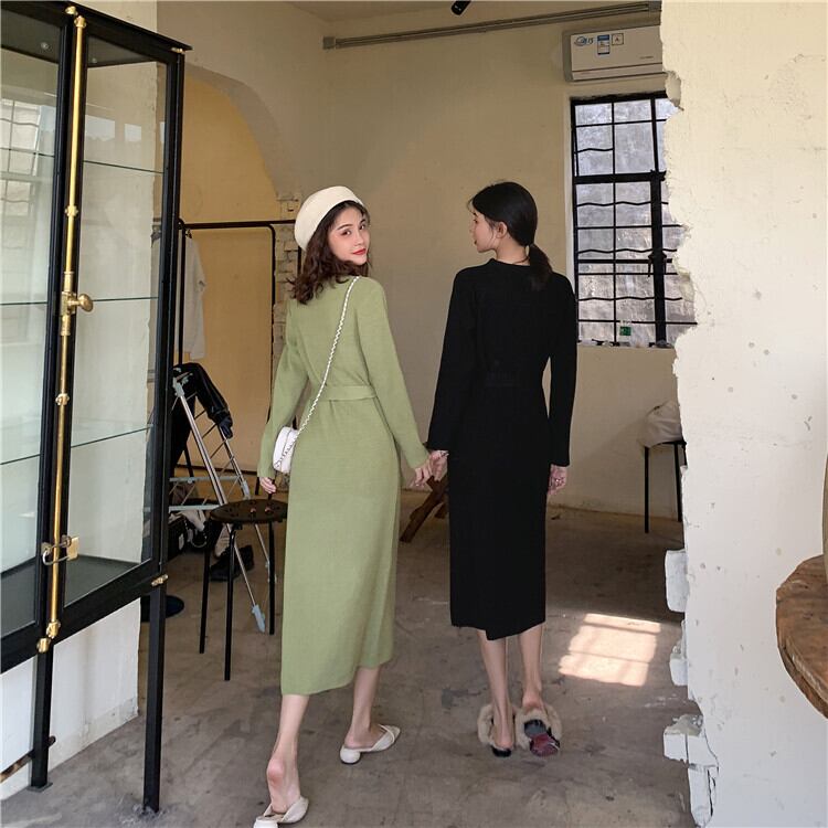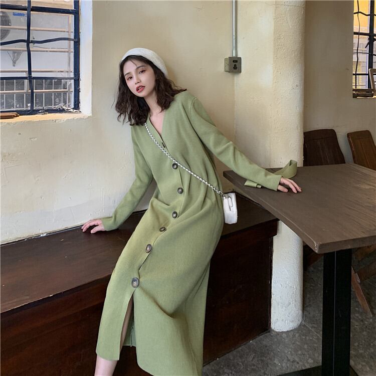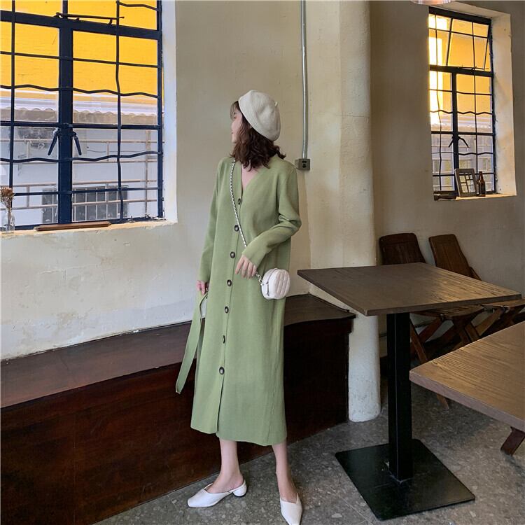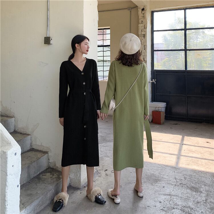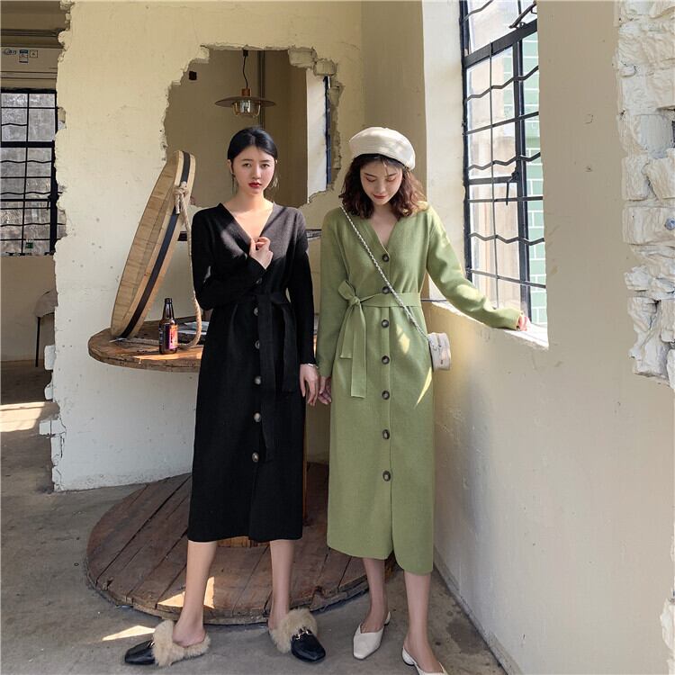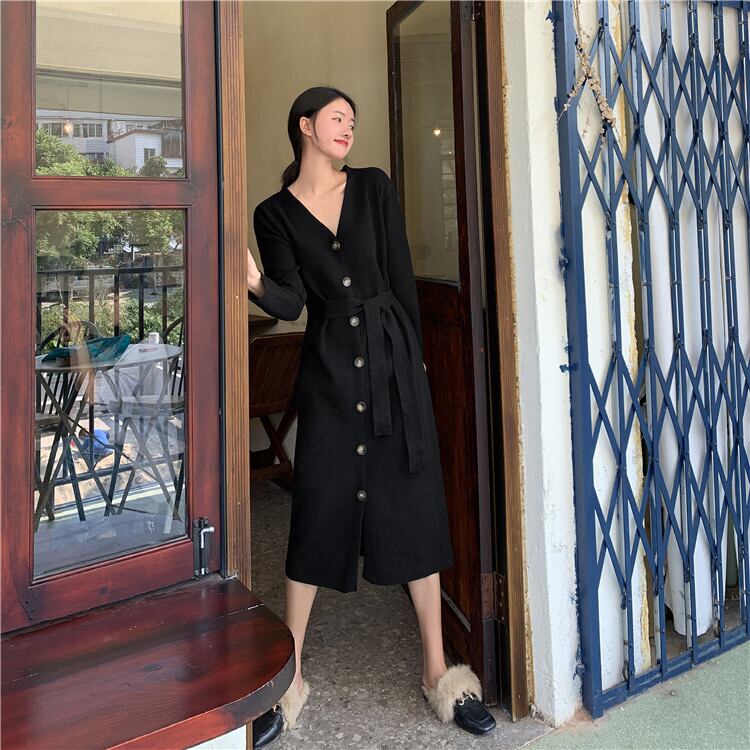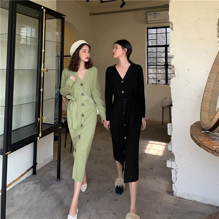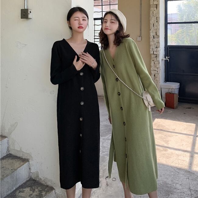 全2色 ワンピース フロントボタン Vネック ミモレ丈 ウエストリボン ニットワンピース レトロ シンプル デイリー カジュアル 上品 デート 無地 秋 冬 春