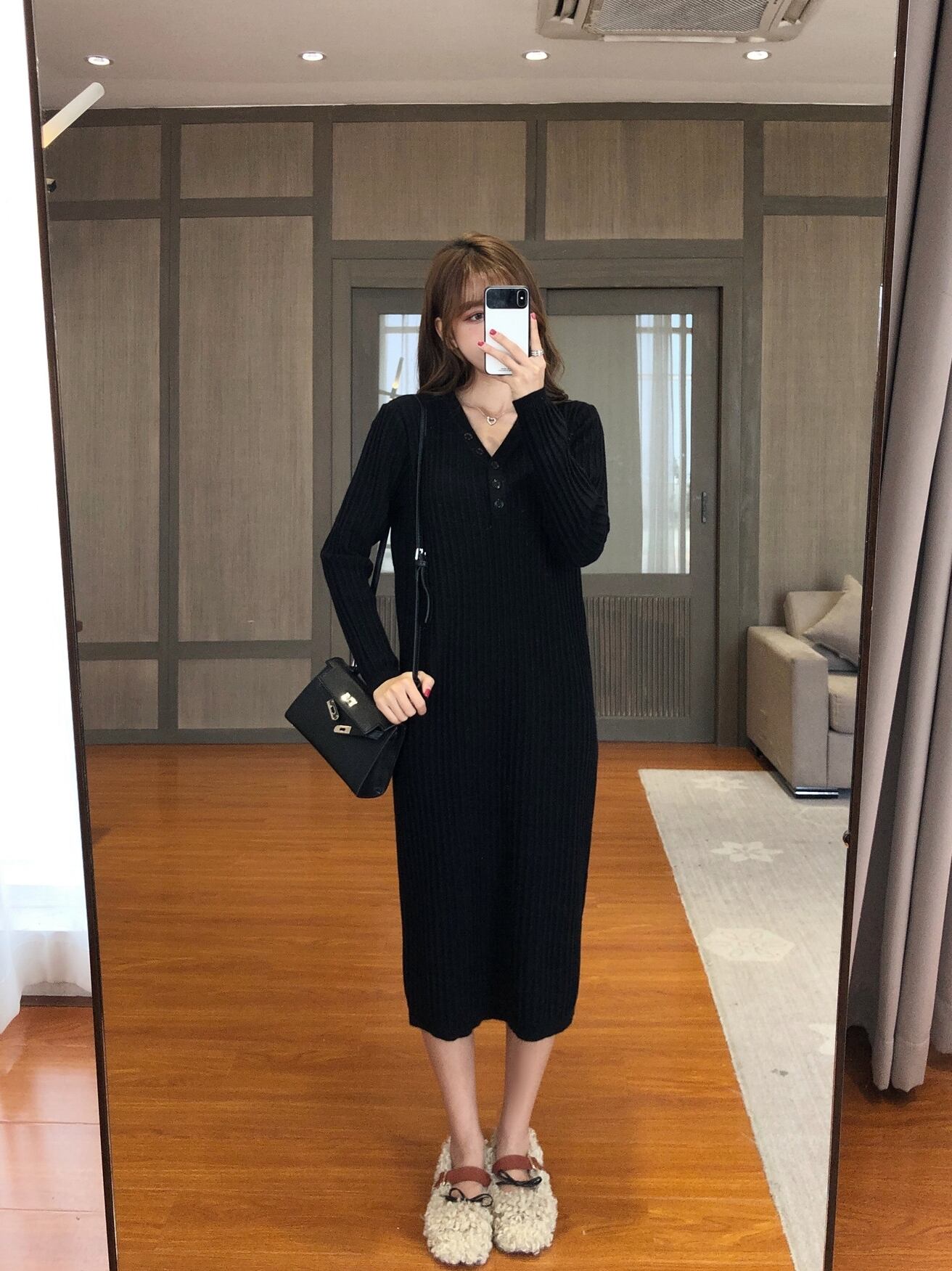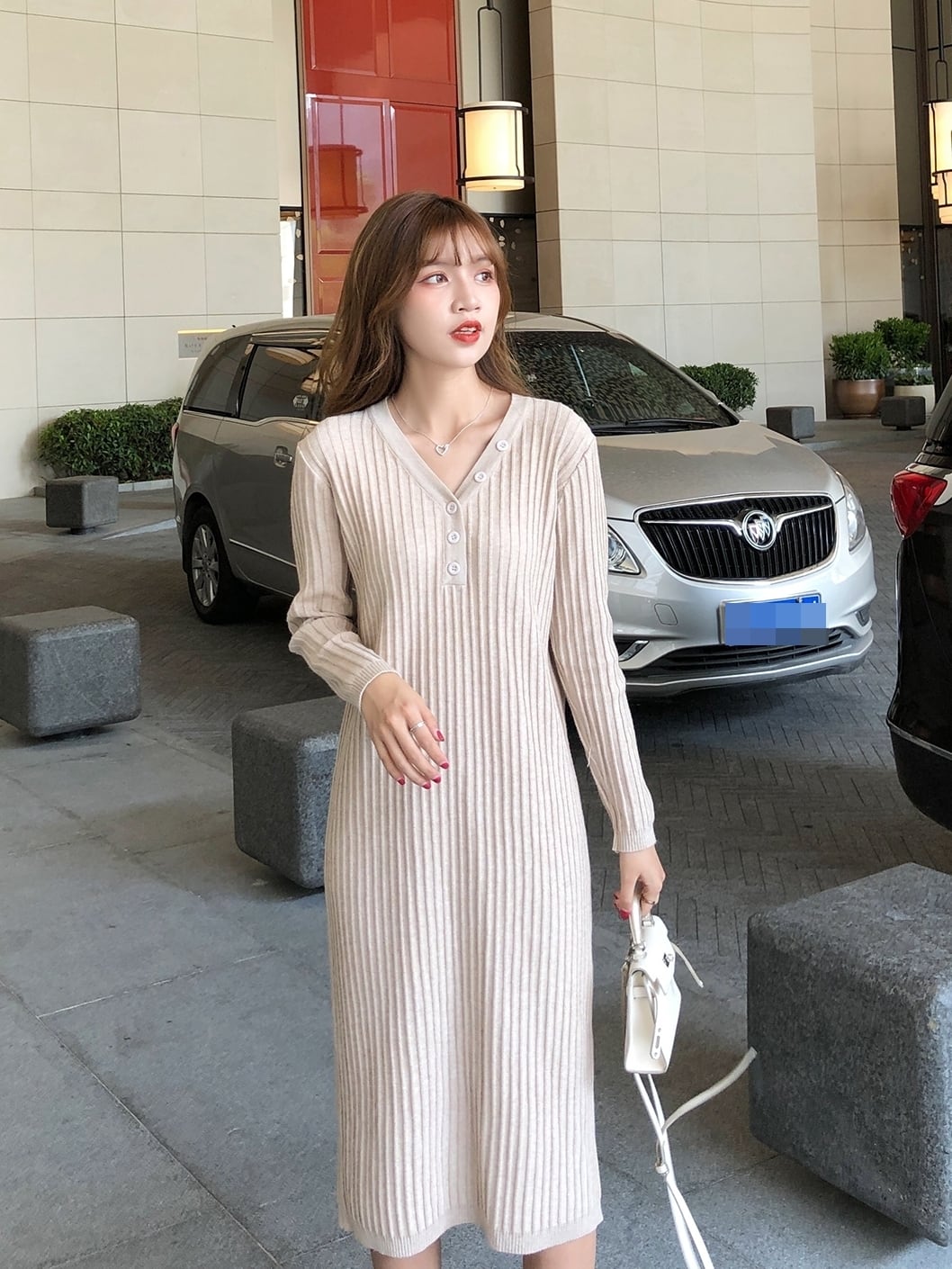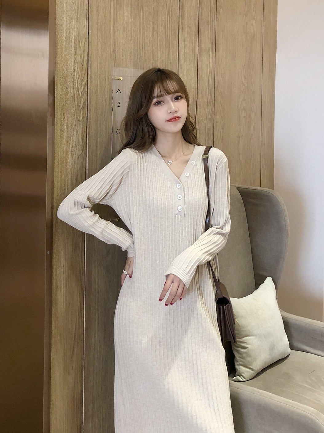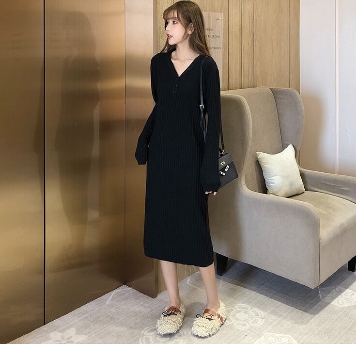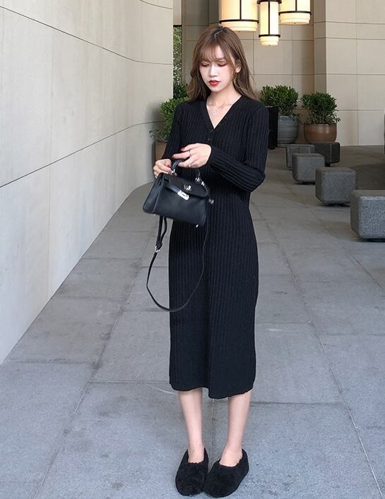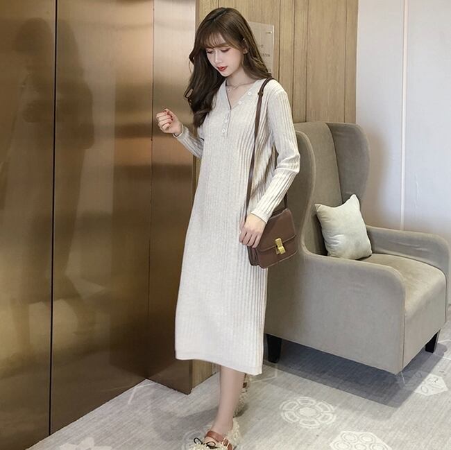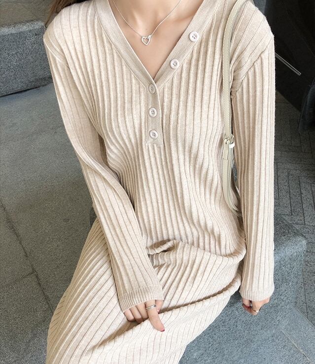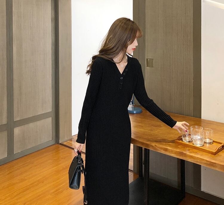 全2色 ワンピース ニットワンピース Vネック スリム ネックボタン ミモレ丈 カジュアル シンプル 無地 ベーシック 大人 あったか デイリー カジュアル 秋 冬 春