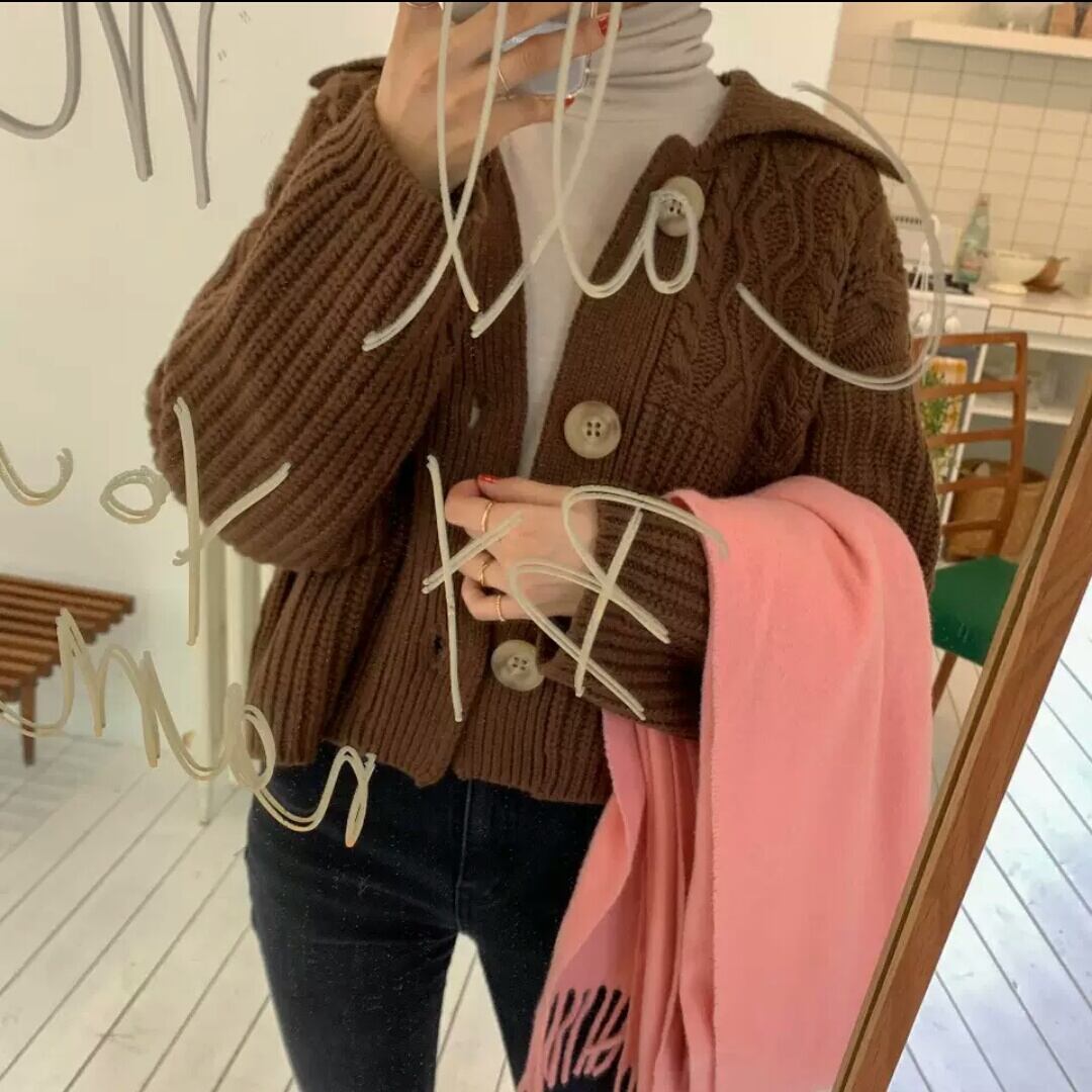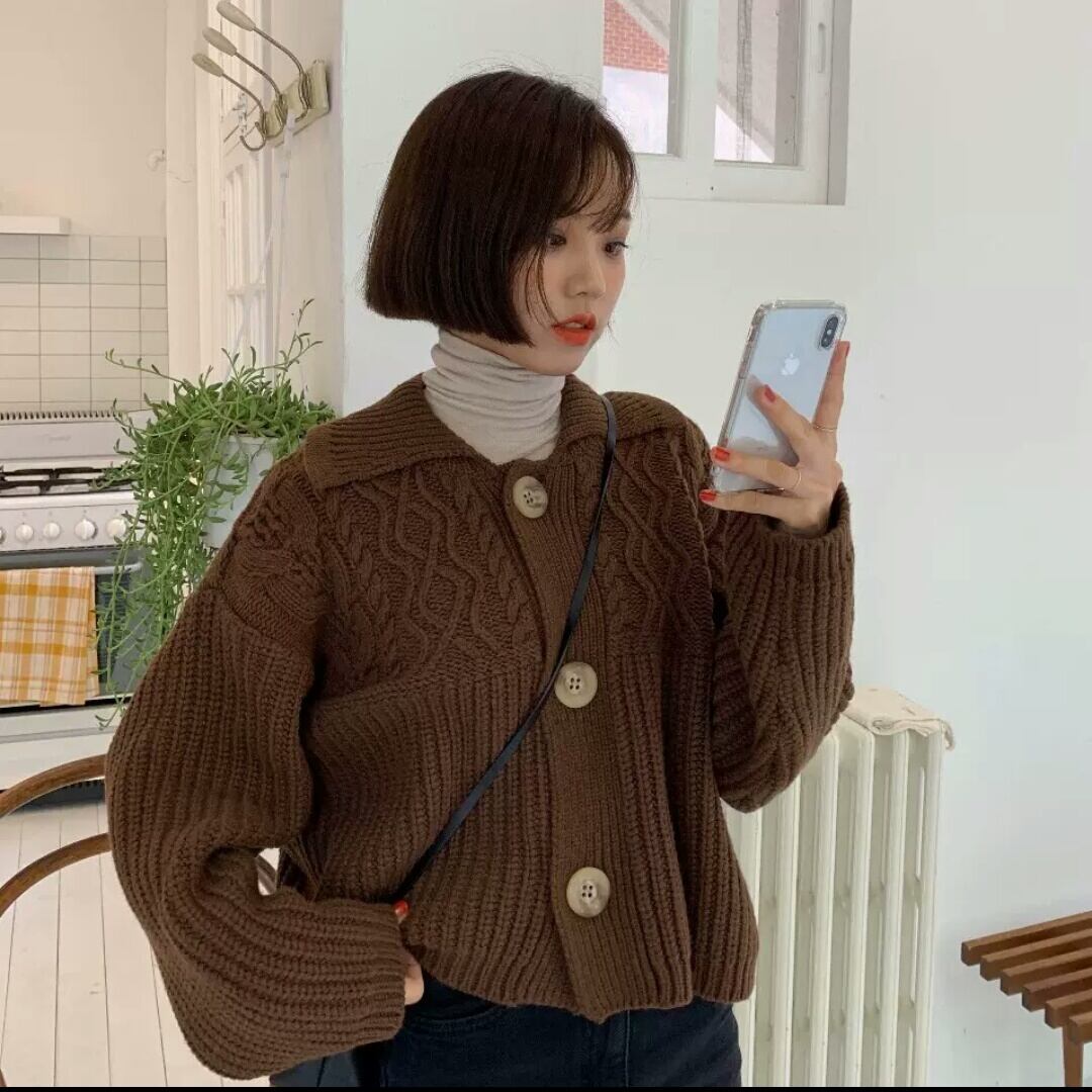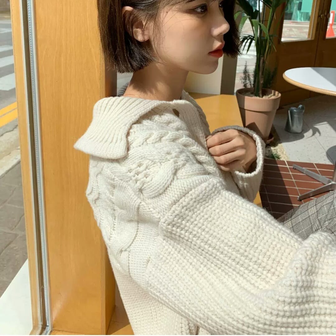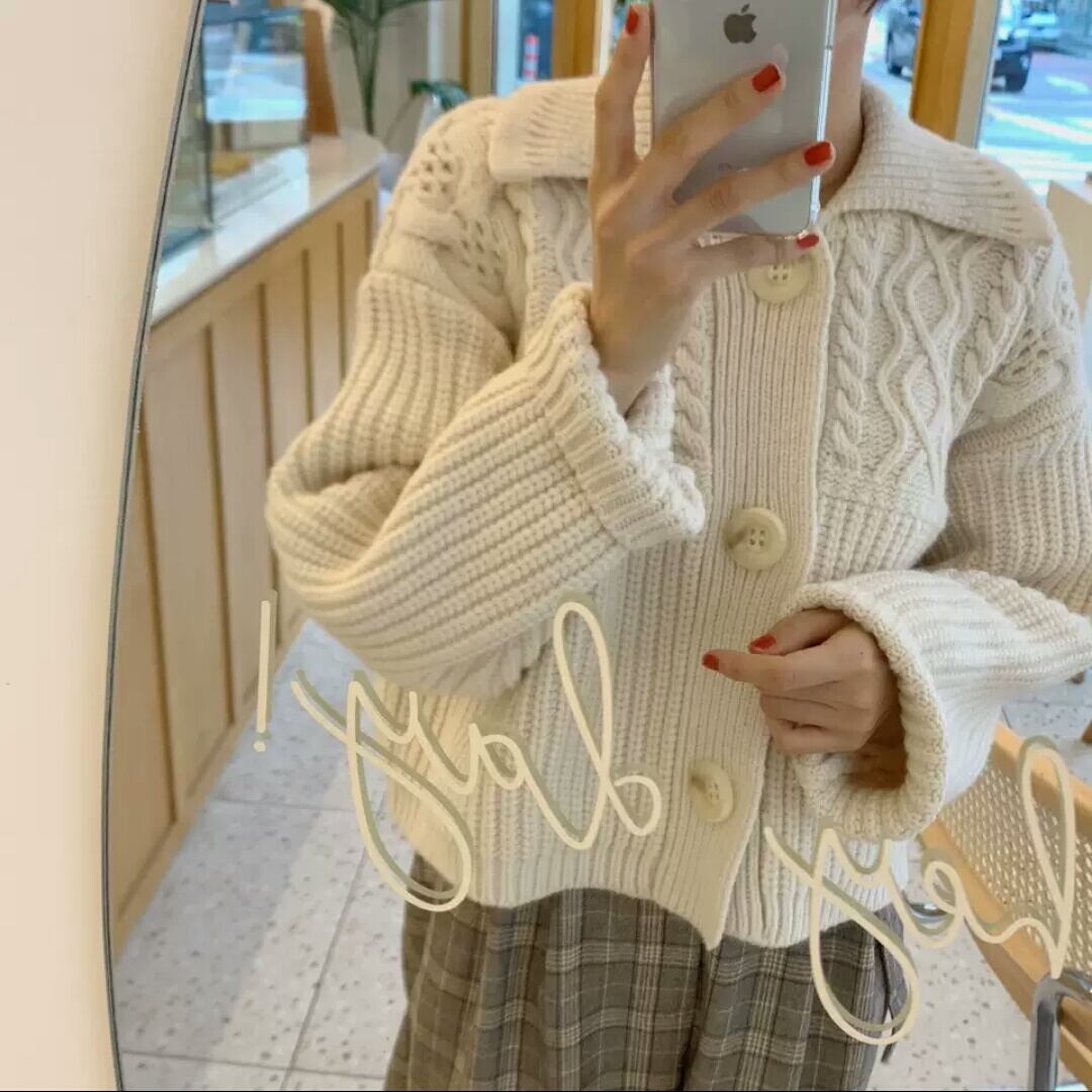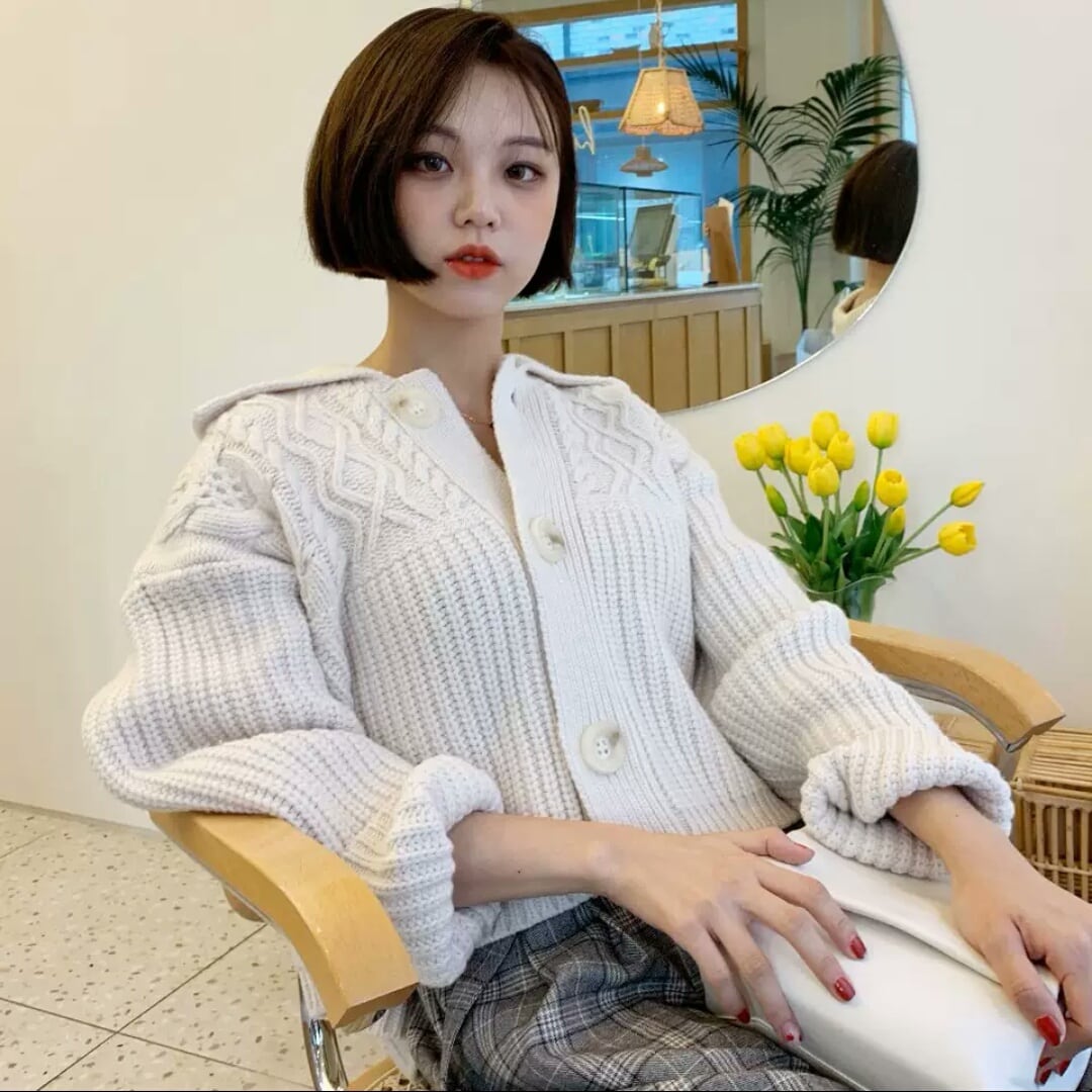 全2色 襟つき アランニット カーディガン ショート丈 短め 大人 カジュアル 可愛い キレイめ シンプル 無地 ゆったり オーバーサイズ お出かけ お買い物 デート 女子会 秋冬 春 通学 学生 通勤 韓国ファッション
