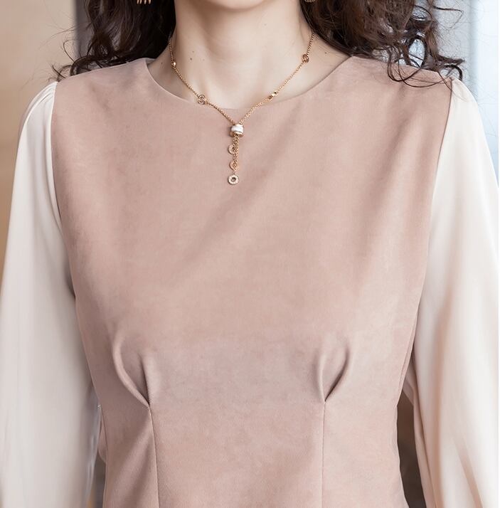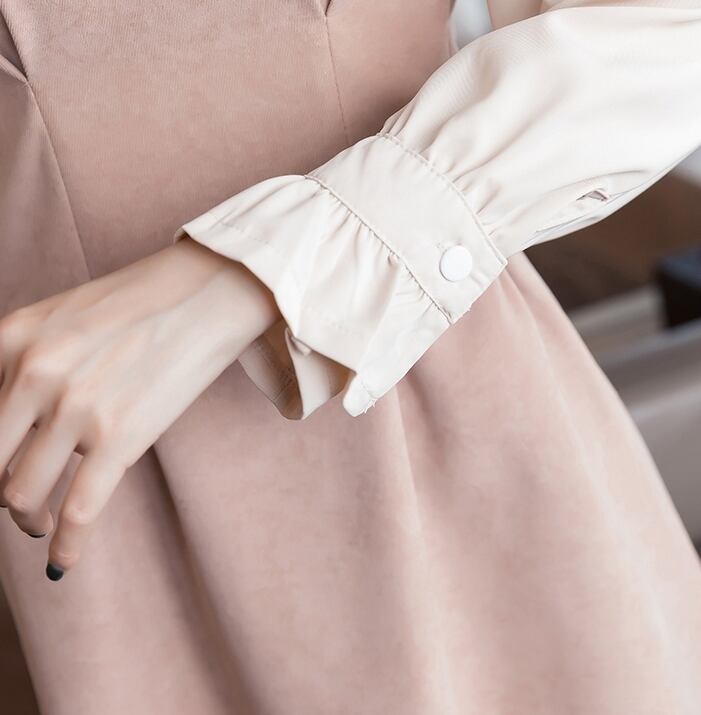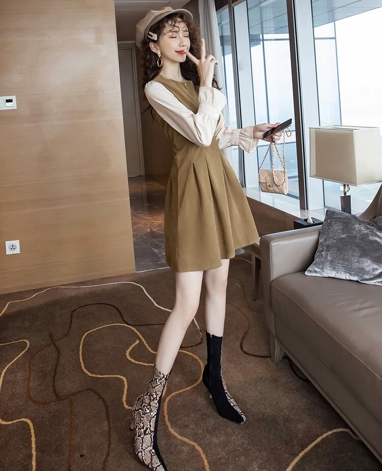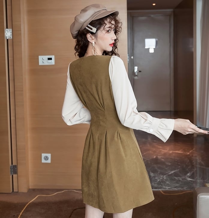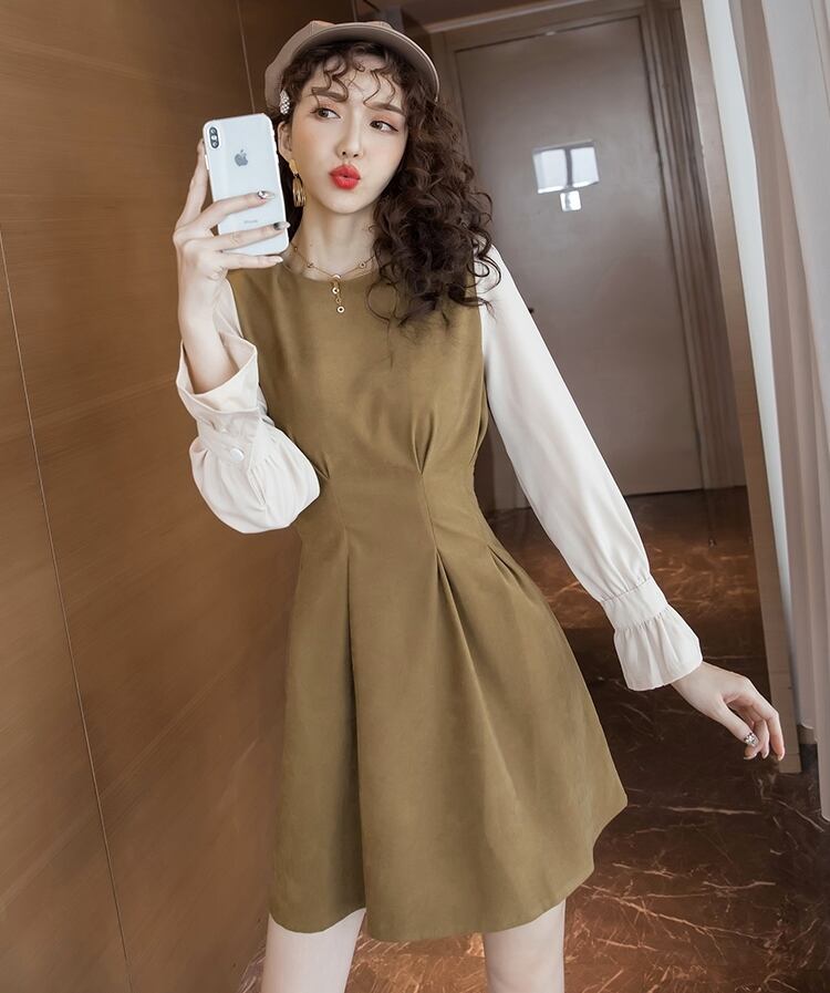 全2色 ワンピース ショート丈 レイヤード風 ラウンドネック 無地 タック フレア ドレープ ウエストマーク フレアスリーブ ガーリー 大人可愛い きれいめ カジュアル デート 上品 秋 冬 春