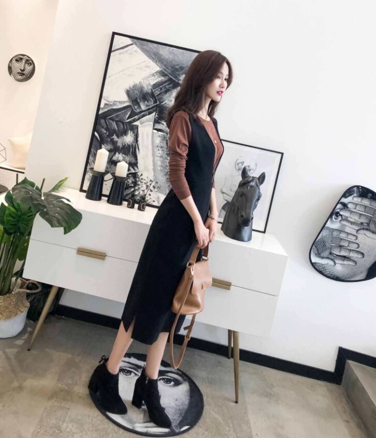 全2色 ワンピース ジャンパースカート ノースリーブ ミモレ丈 スリム Vネックシンプル きれいめ スリット カジュアル 上品 デート 大人 無地 秋 冬 春